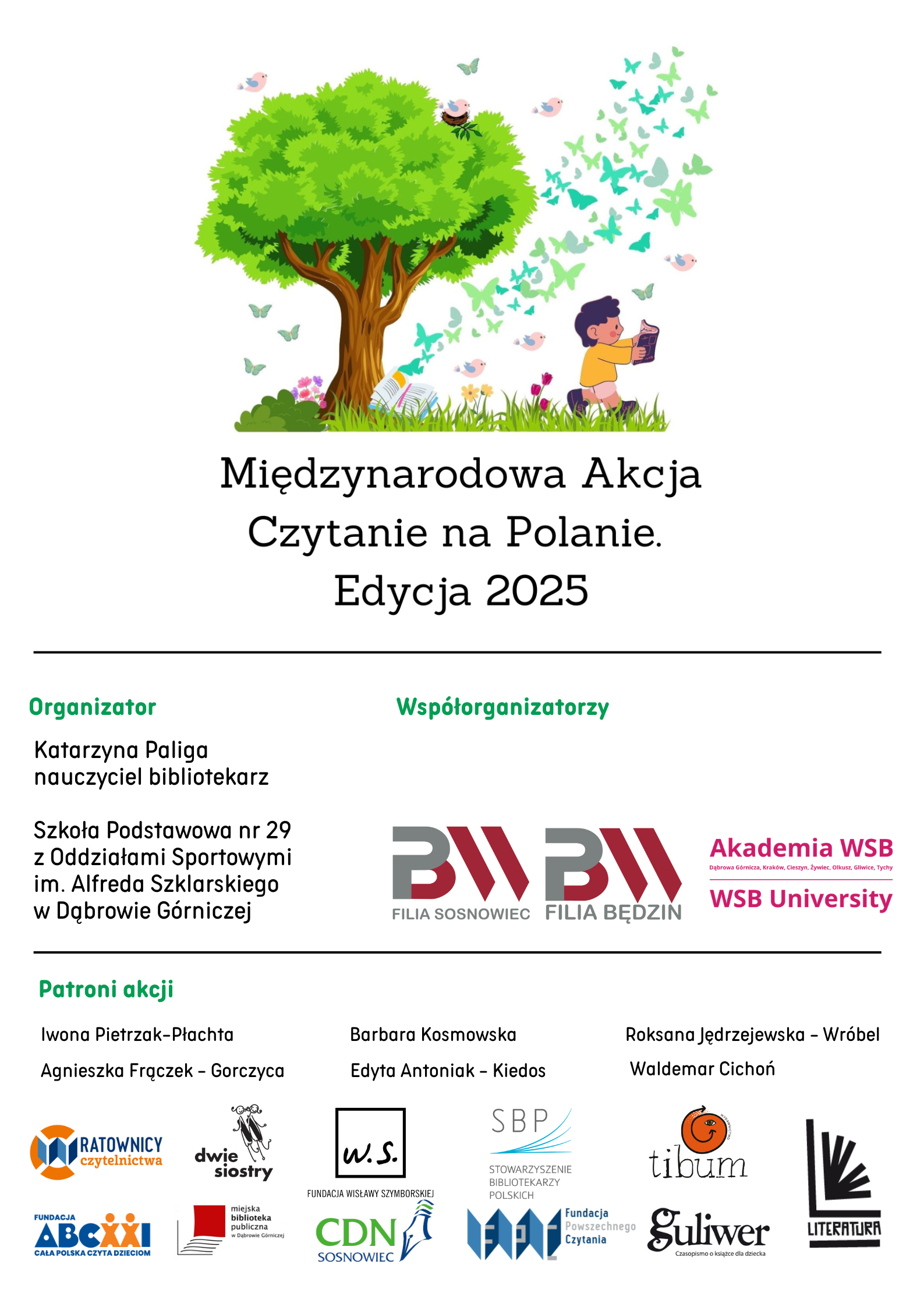 W roku szkolnym 2024/25 nasza szkoła wzięła udział w akcji promującej czytelnictwo "Czytanie na Polanie". Jest to akcja ogólnopolska o zasięgu międzynarodowym i jak wskazuje nazwa powinna odbyć się w otoczeniu przyrody.