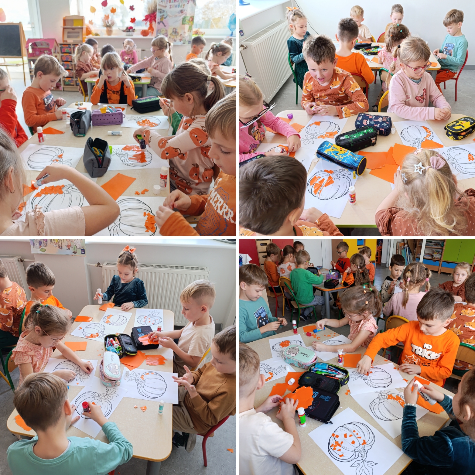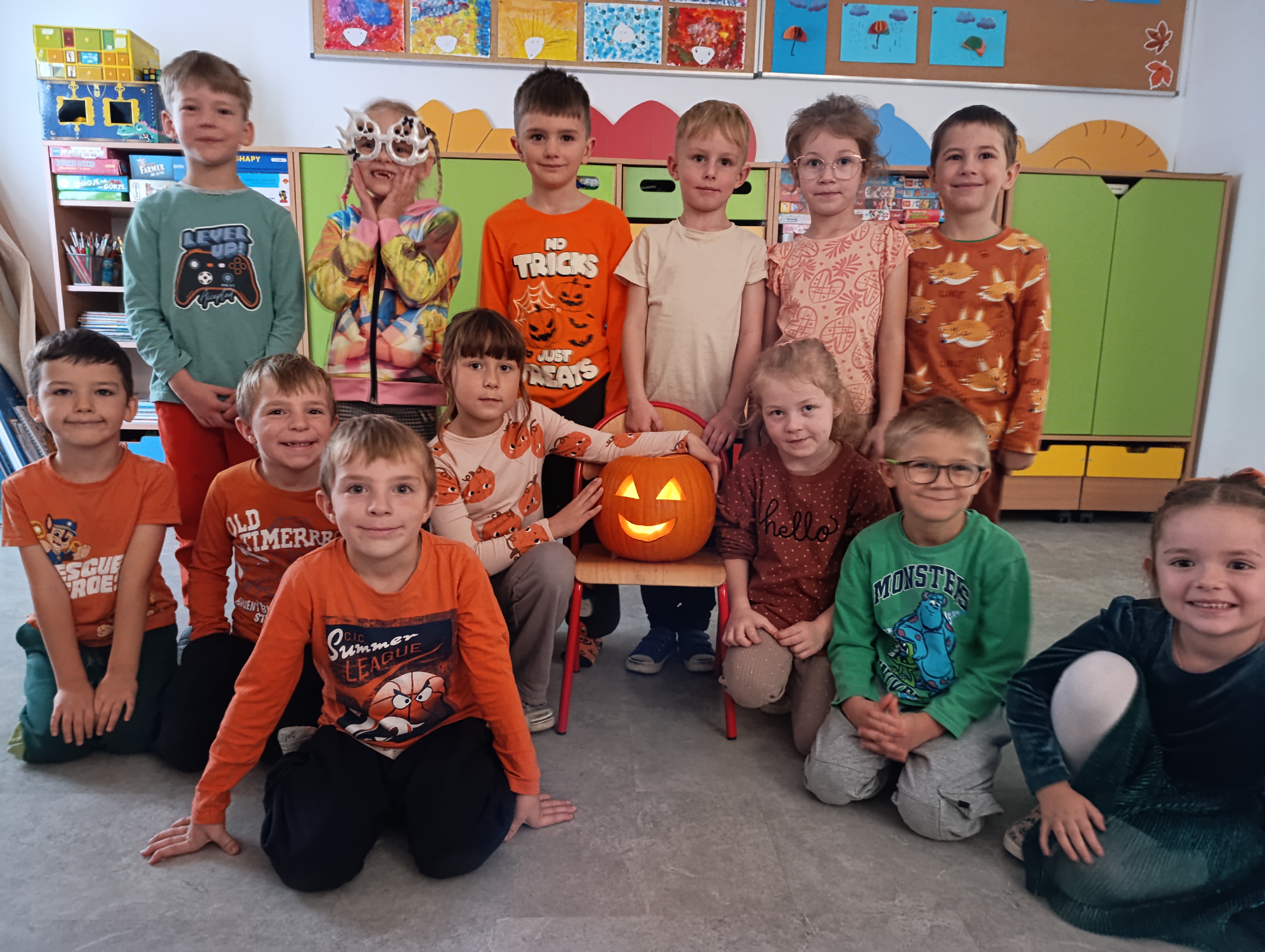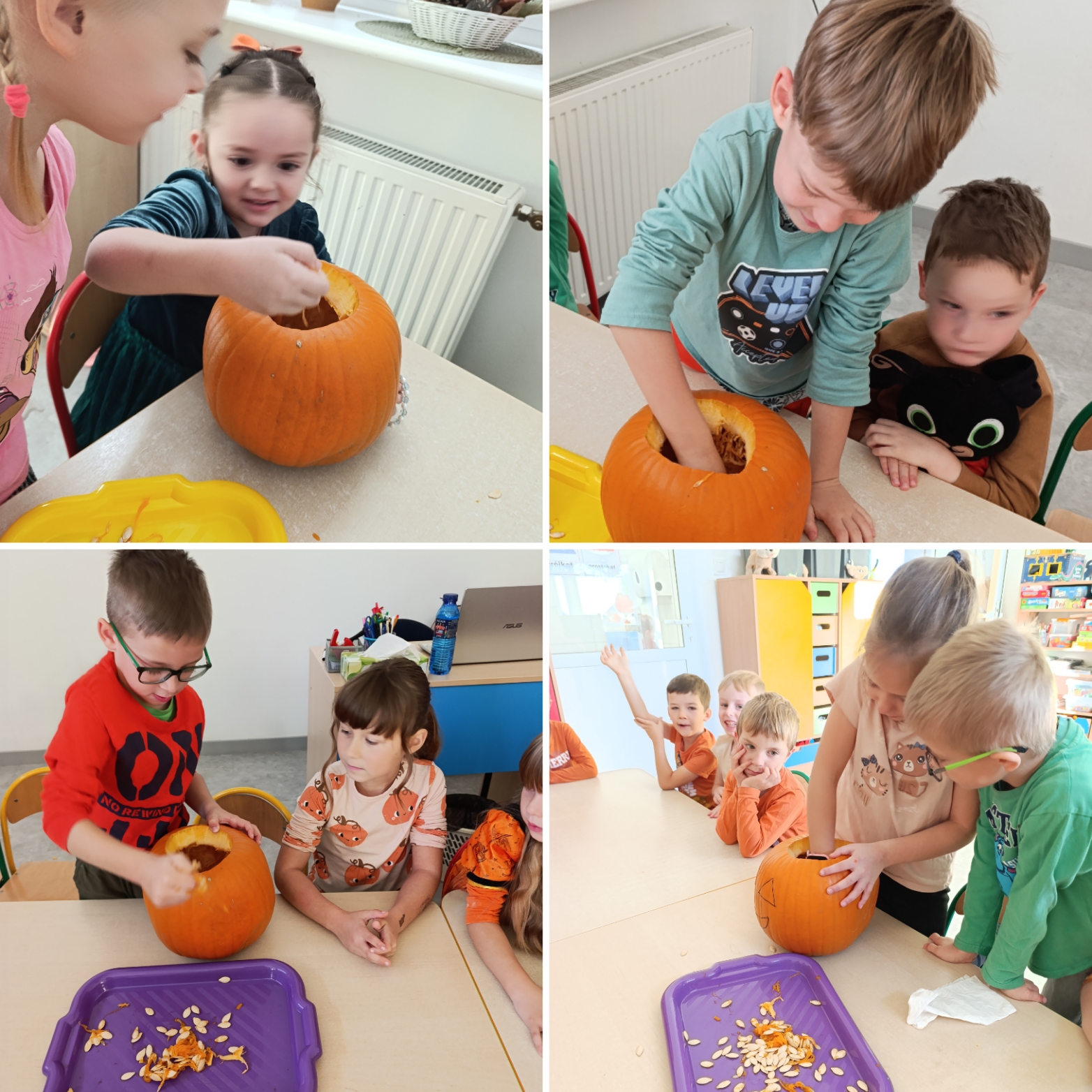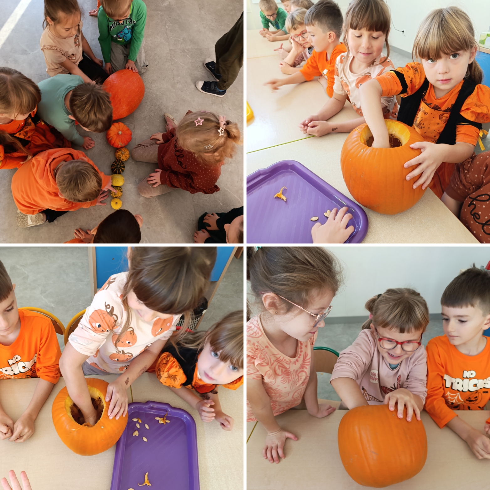 Poznaliśmy także budowę dyni i z wielką ciekawością sprawdziliśmy jak wygląda od środka. Starannie wyjęliśmy z niej wszystkie pestki i powstał piękny lampion. W ciągu dnia bawiliśmy się w nasze ulubione gry i zabawy ruchowe, a na zakończenie każdy wykonał własną pracę plastyczną: „Dynia z mojego ogrodu”.