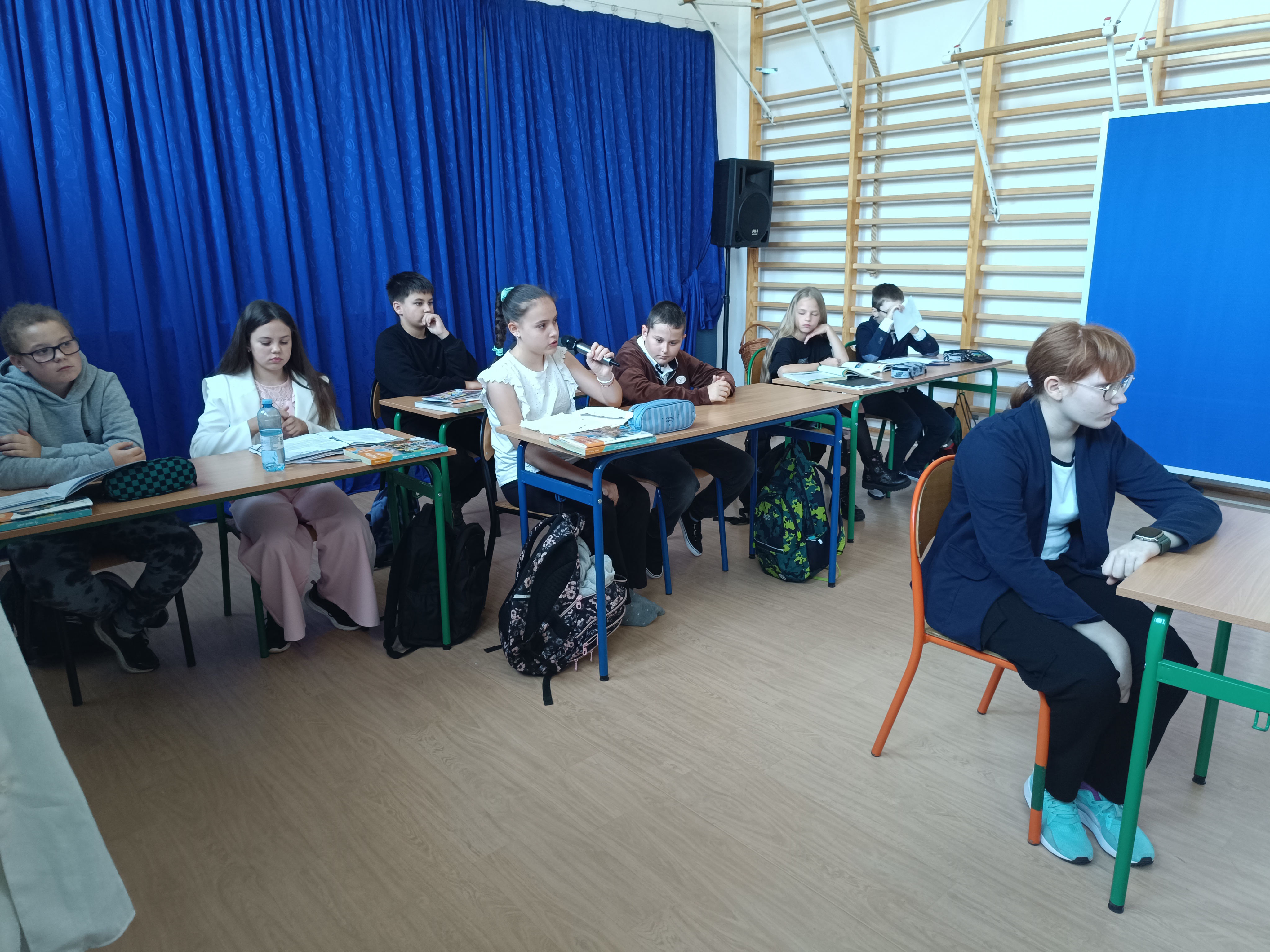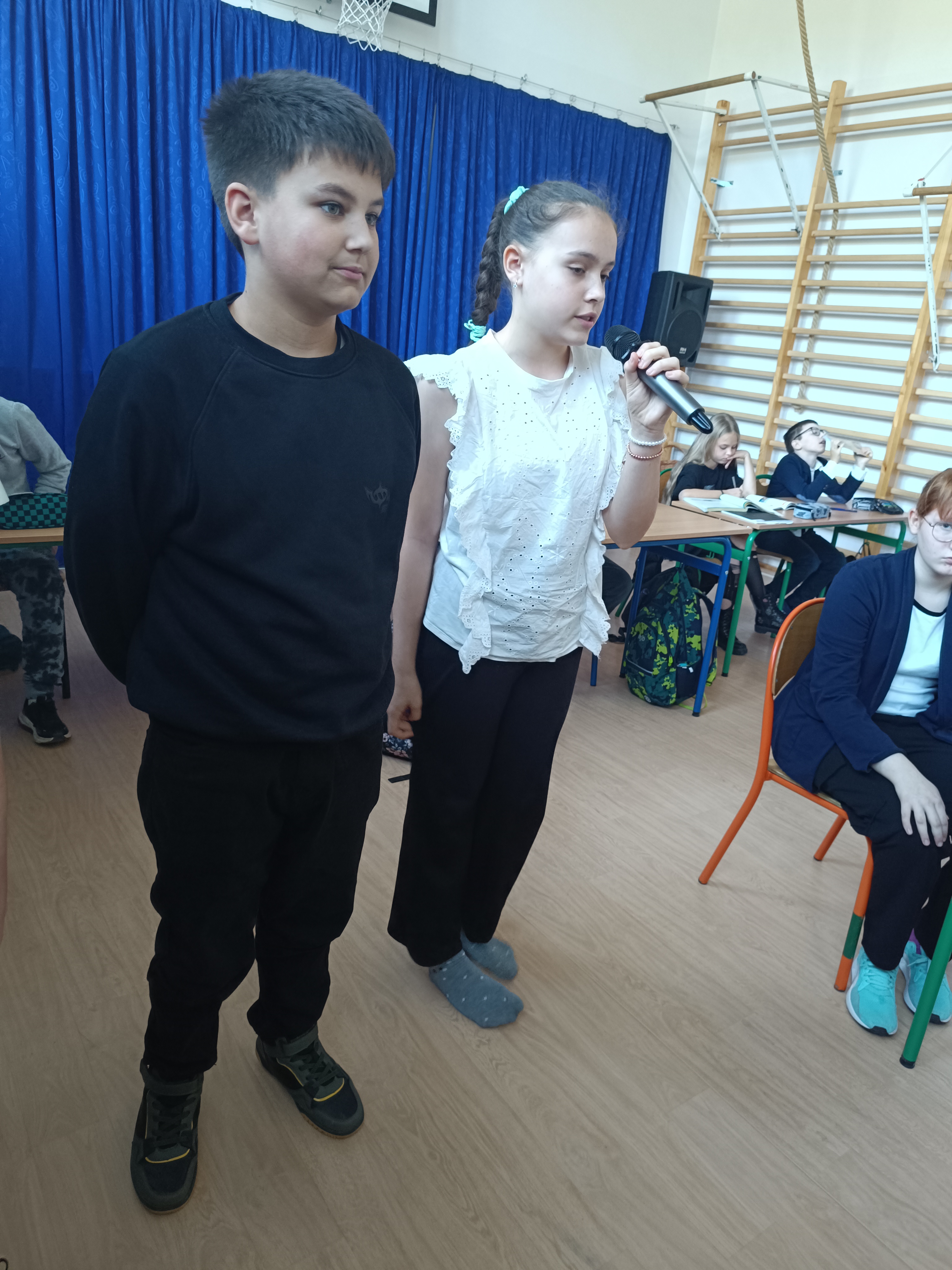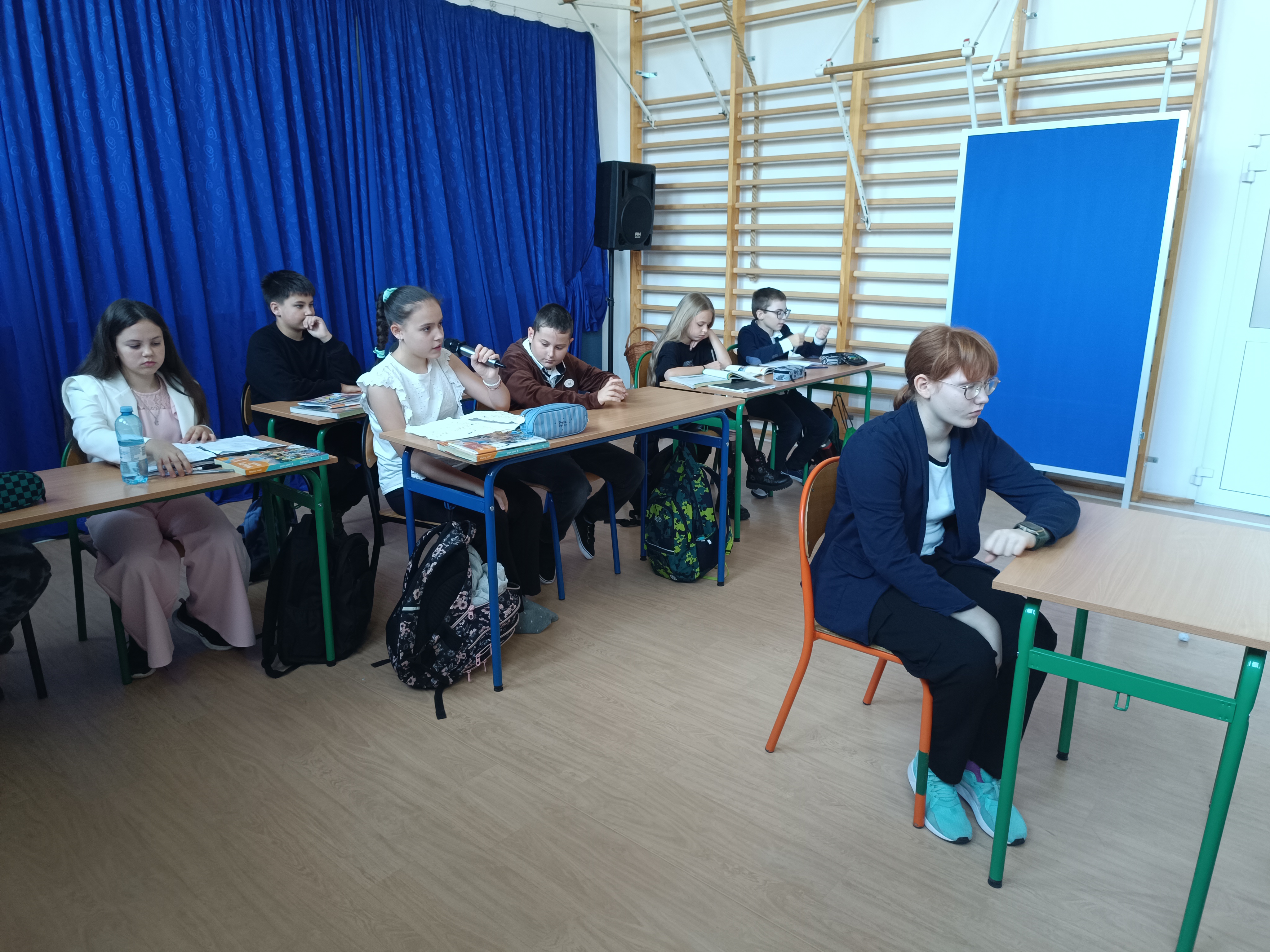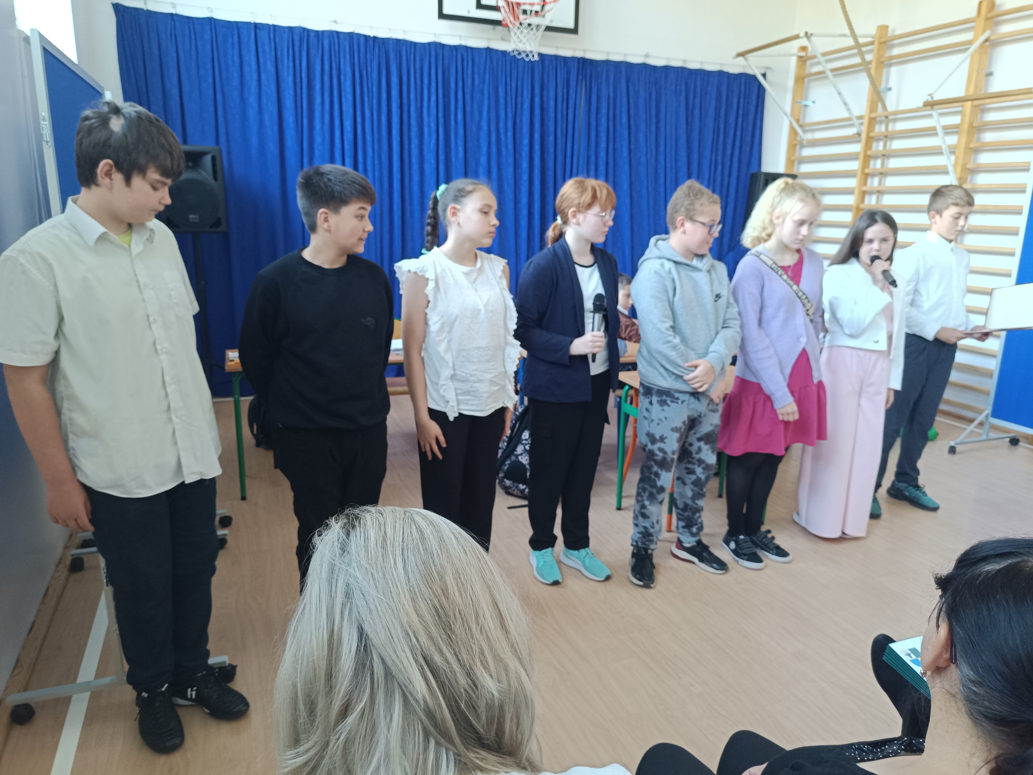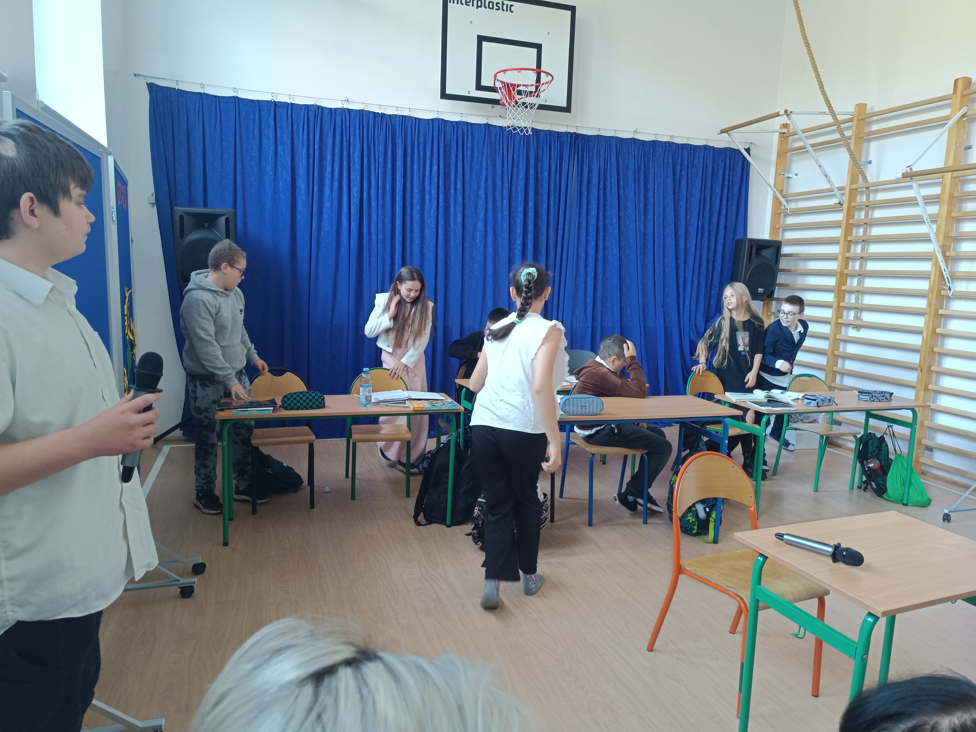 Uczniowie klasy szóstej przygotowali krótki apel, w którym w humorystyczny sposób przedstawili scenki z życia szkolnego i nauczycielskiego. Ich występ dostarczył wszystkim wiele radości i uśmiechu, ukazując codzienność szkoły z przymrużeniem oka.