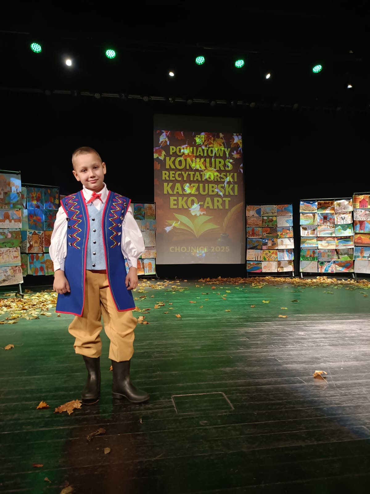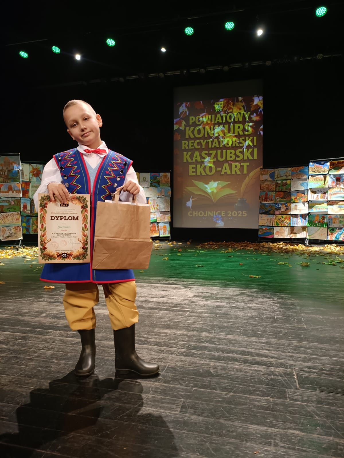 Dziś na scenie Chojnickiego Centrum Kultury swoje umiejętności recytatorskie w języku kaszubskim zaprezentował Jan Zemrys z klasy 2.