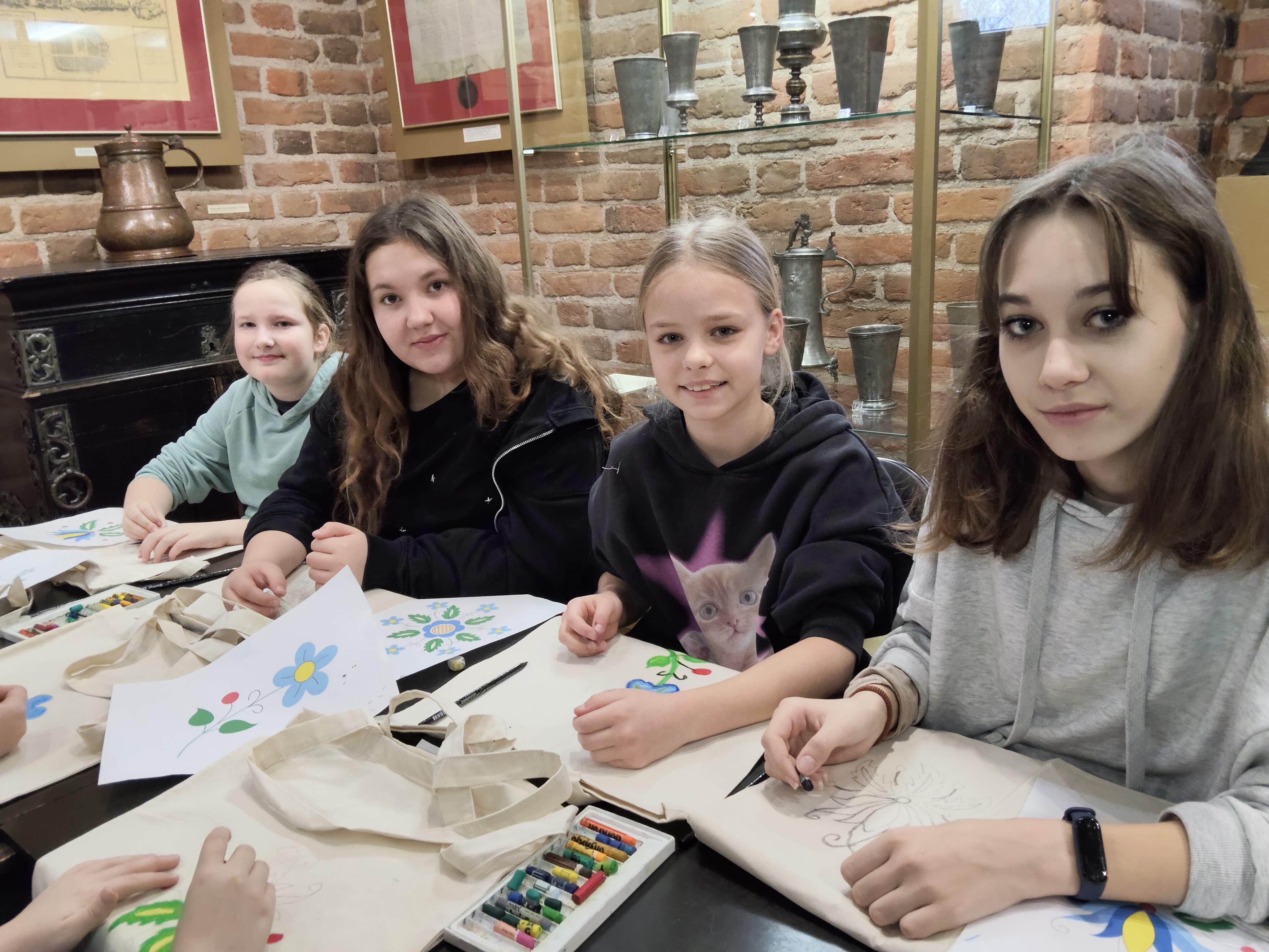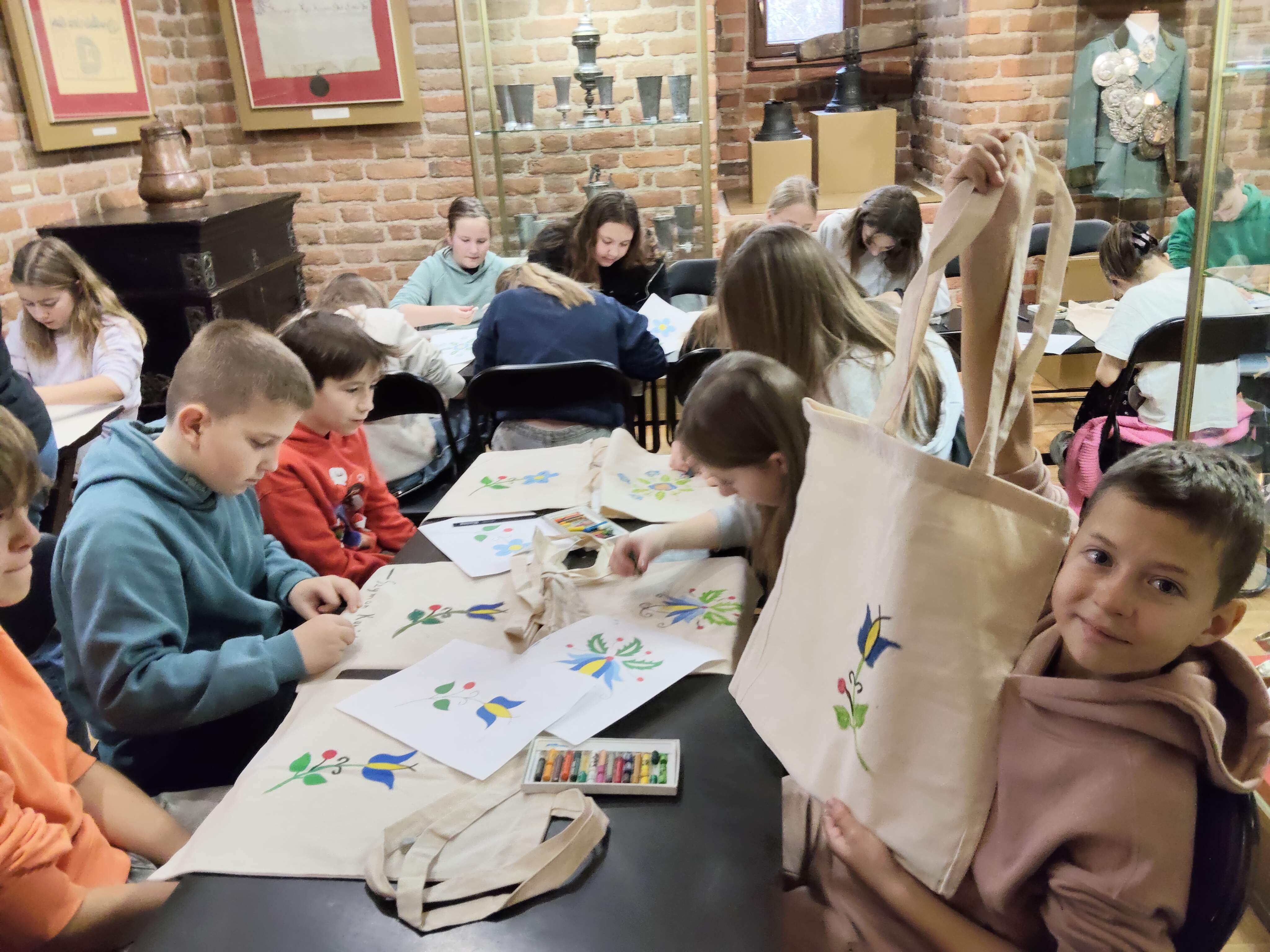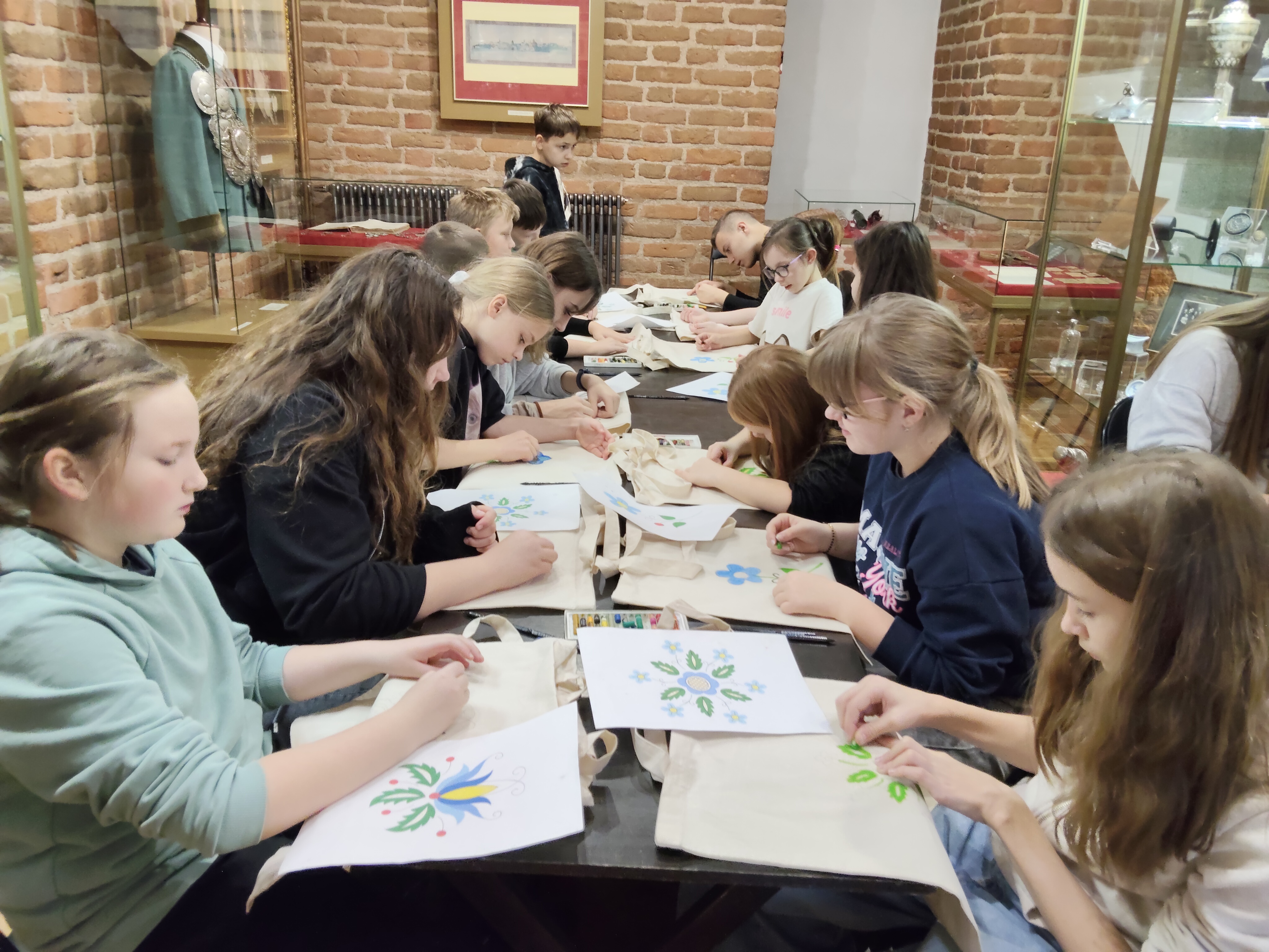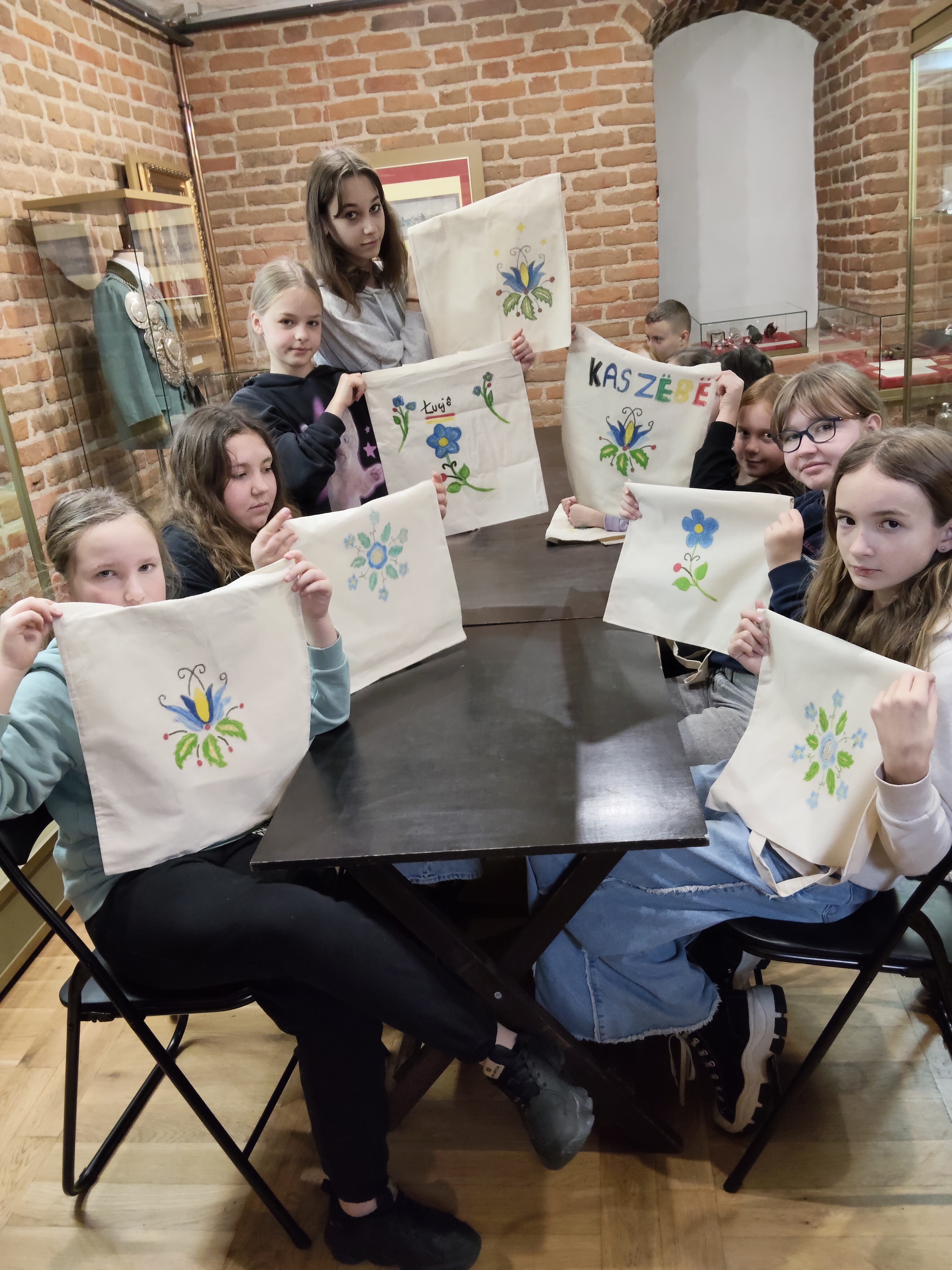Uczniowie klasy 4-7 wzięli udział w wyjątkowych warsztatach z języka kaszubskiego, które odbyły się w lokalnym muzeum. Głównym powodem wizyty w muzeum było malowanie toreb w tradycyjne kaszubskie wzory – uczniowie z ogromnym zaangażowaniem tworzyli własne, barwne kompozycje.