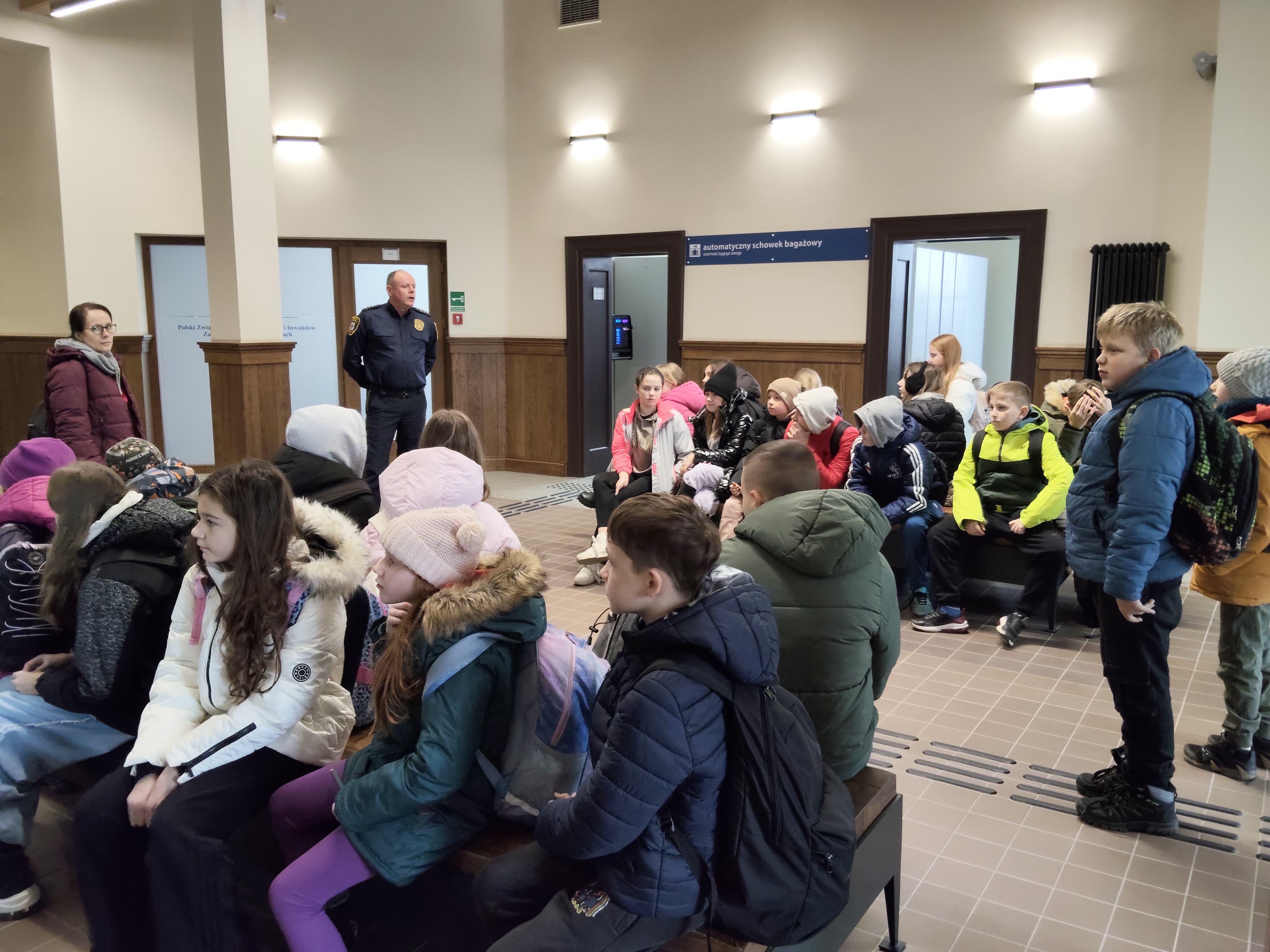Po warsztatach grupa udała się na zwiedzanie wyremontowanego dworca PKP. Przewodnik opowiedział o historii miejsca oraz zmianach, jakie zaszły podczas modernizacji. Dzieci z zainteresowaniem oglądały nowe wnętrza i dowiadywały się, jak funkcjonuje dworzec oraz Straż Miejska.