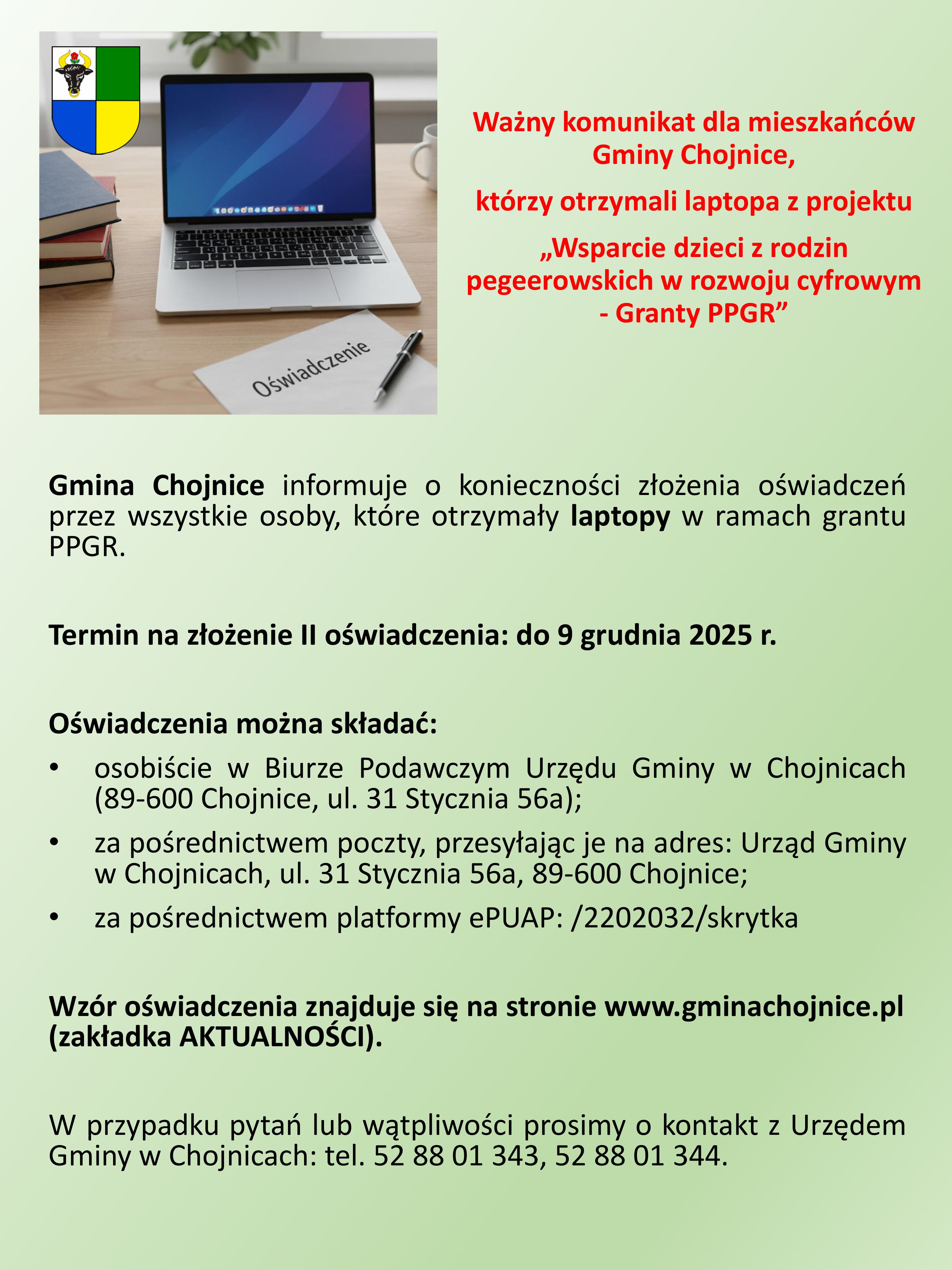 Ważny komunikat dla mieszkańców Gminy Chojnice, którzy otrzymali laptopa z projektu „Wsparcie dzieci z rodzin pegeerowskich w rozwoju cyfrowym - Granty PPGR”.