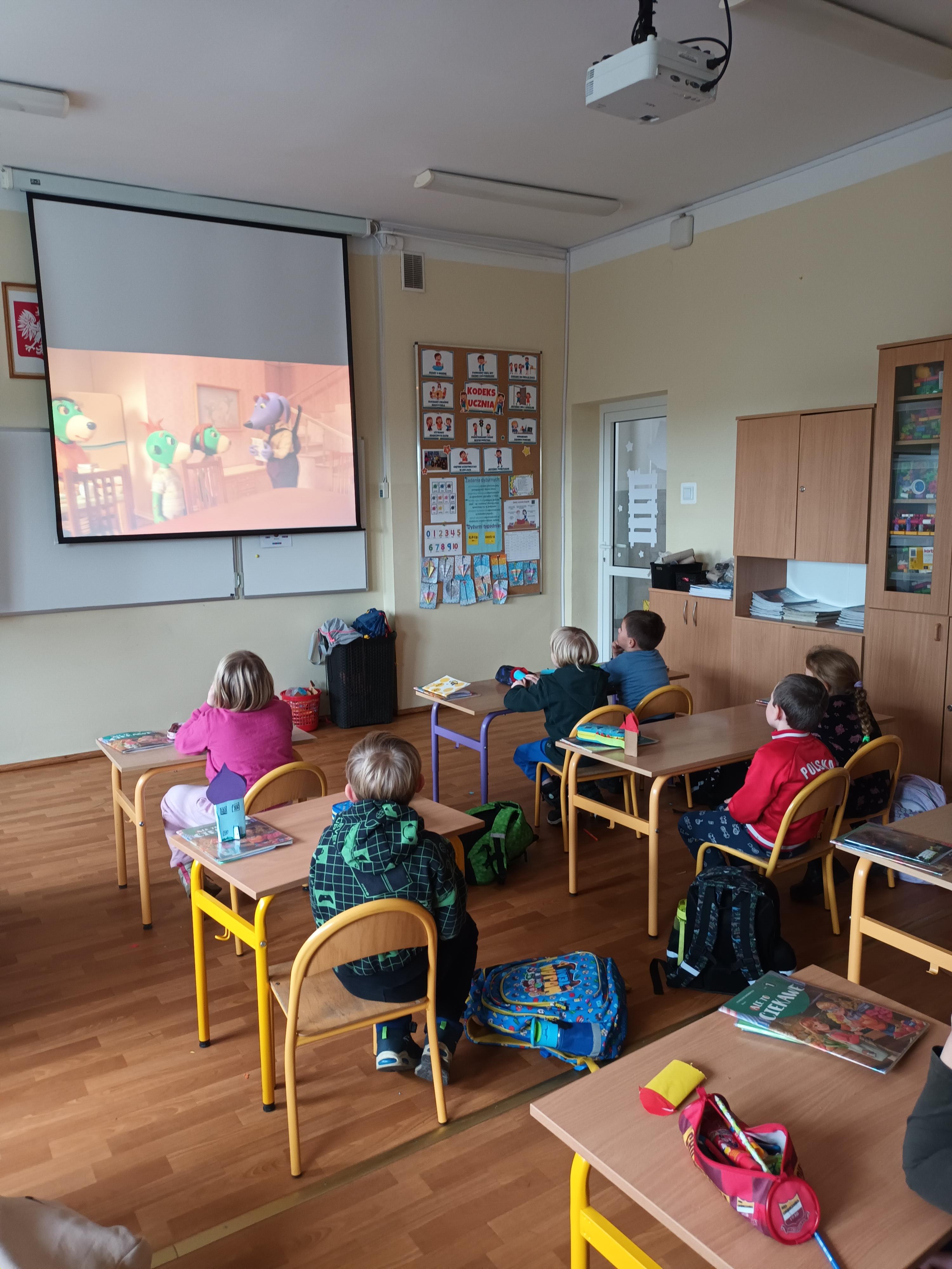 Następnie uczniowie obejrzeli bajkę o Treflikach pt."Warto czytać" i chętnie dyskutowali o zaletach płynących z czytania.Wysłuchali także ważnych próśb książki.