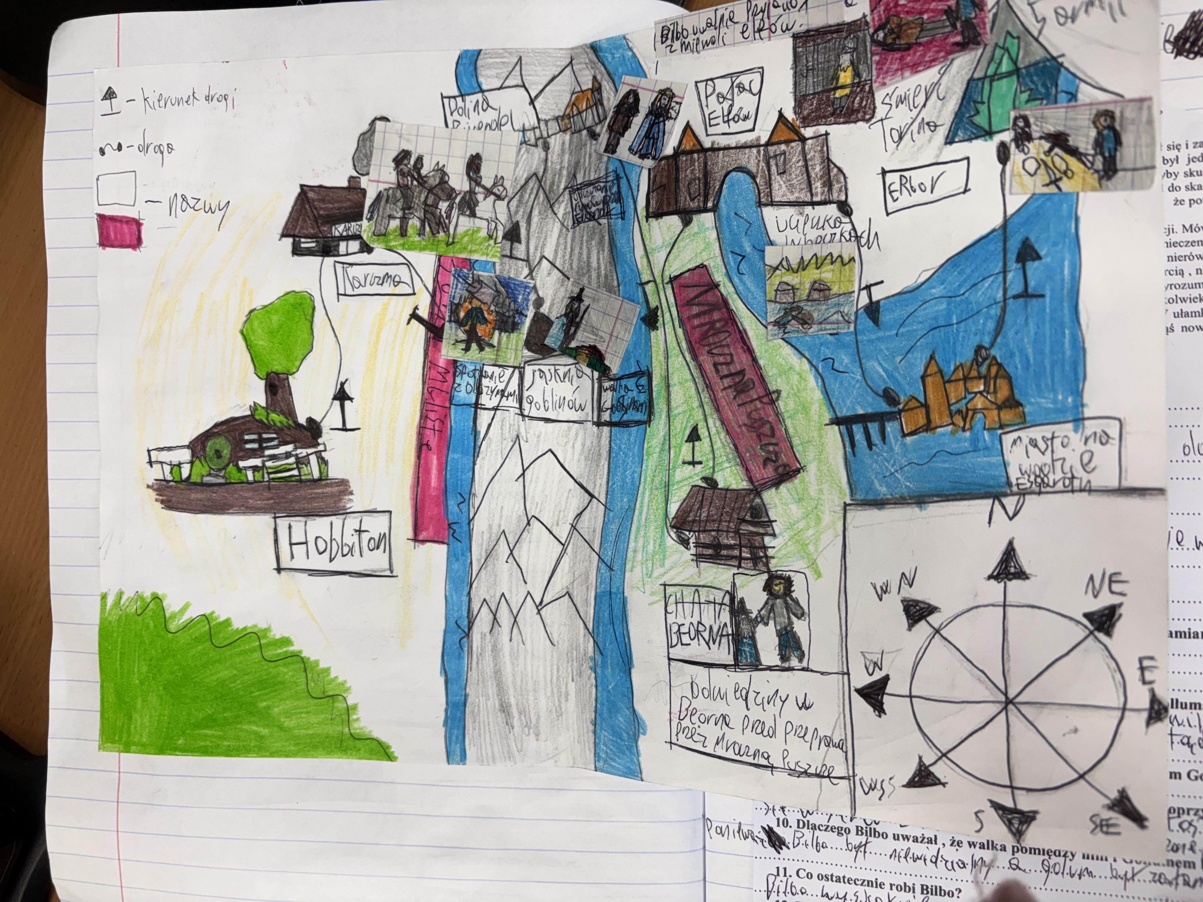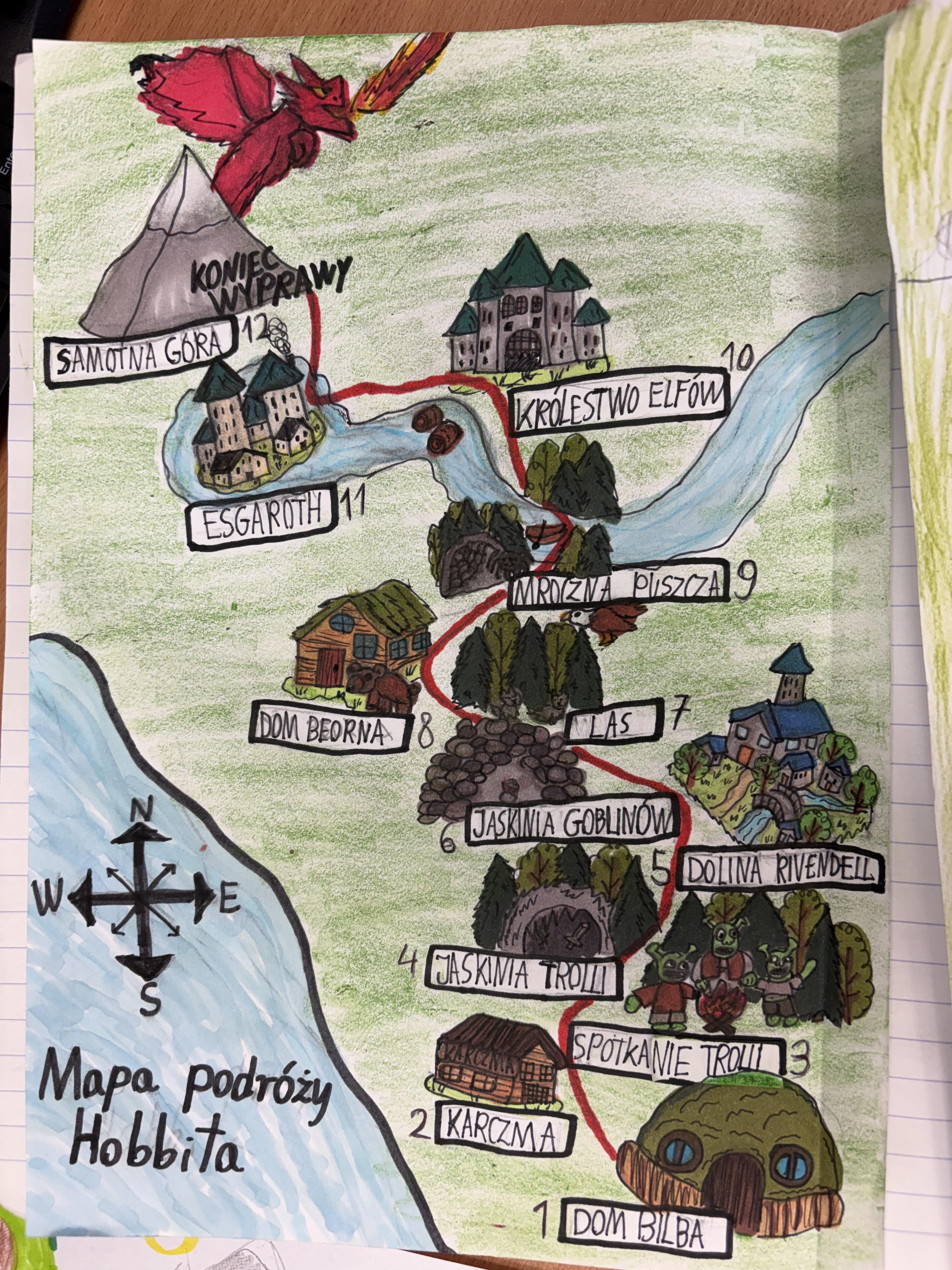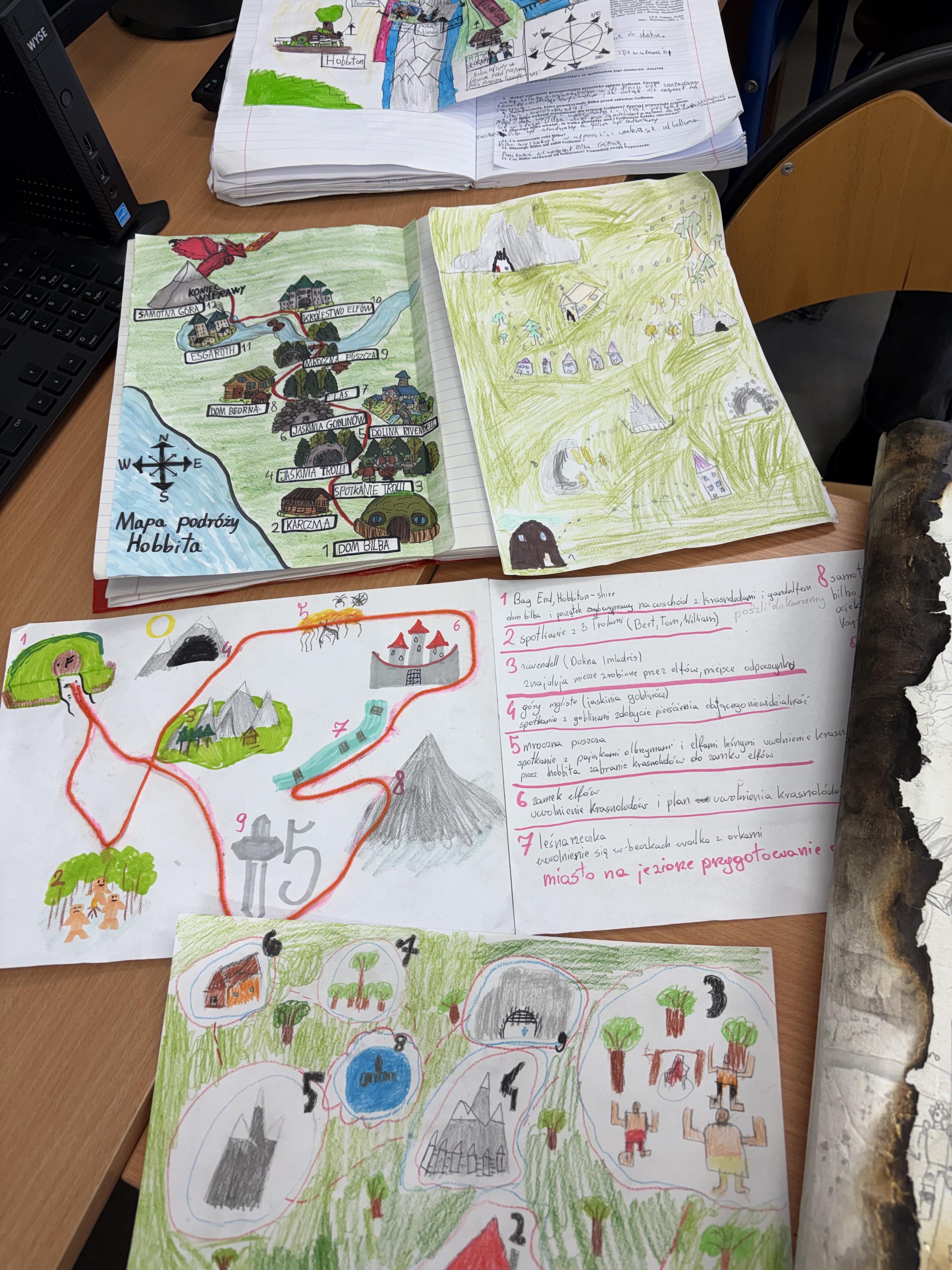 Klasa szósta opracowała plan podróży Bilba na podstawie lektury „Hobbit”. Uczniowie przygotowali ciekawe, pomysłowe mapy przedstawiające kolejne etapy wyprawy, a co najważniejsze – potrafili interesująco o nich opowiadać.