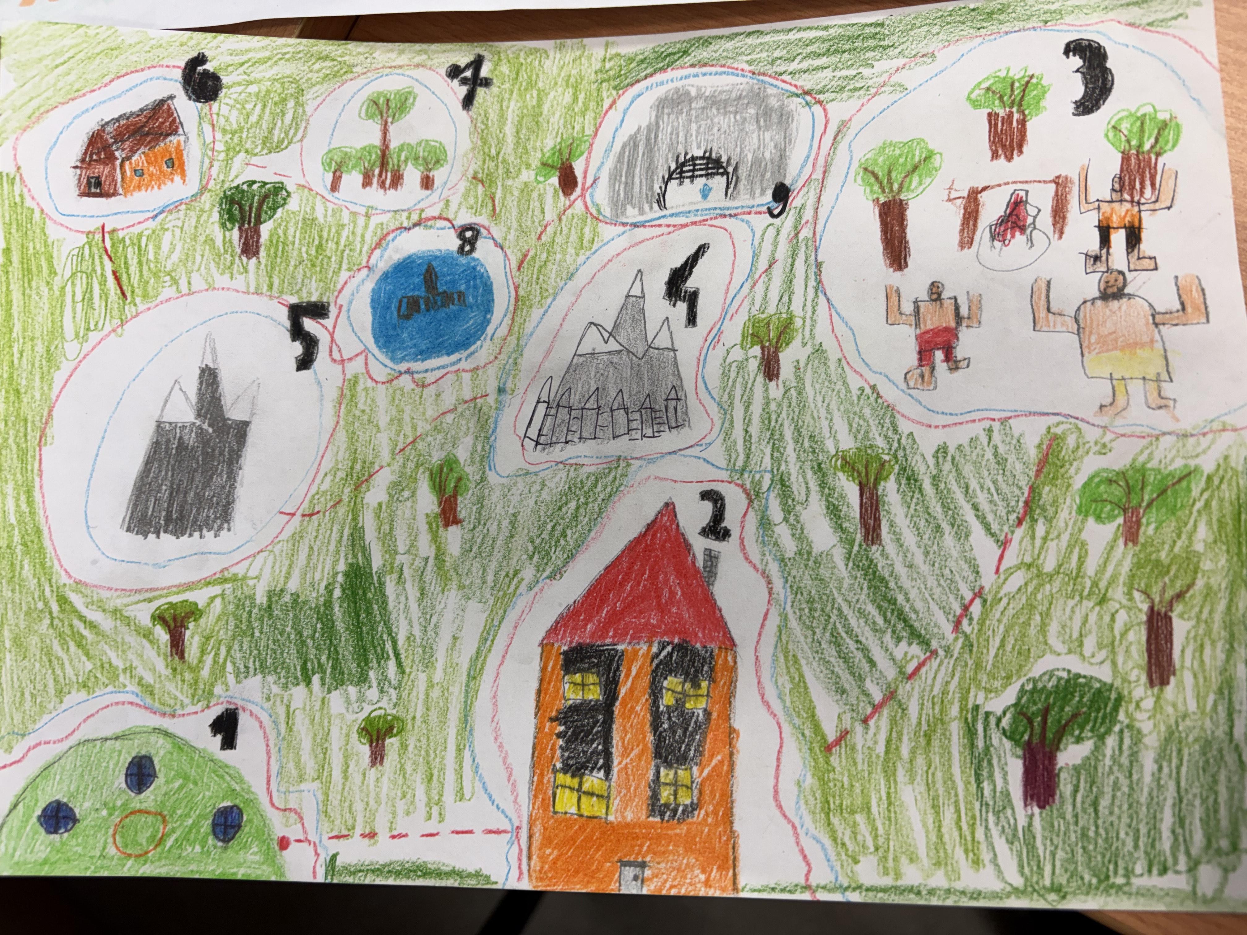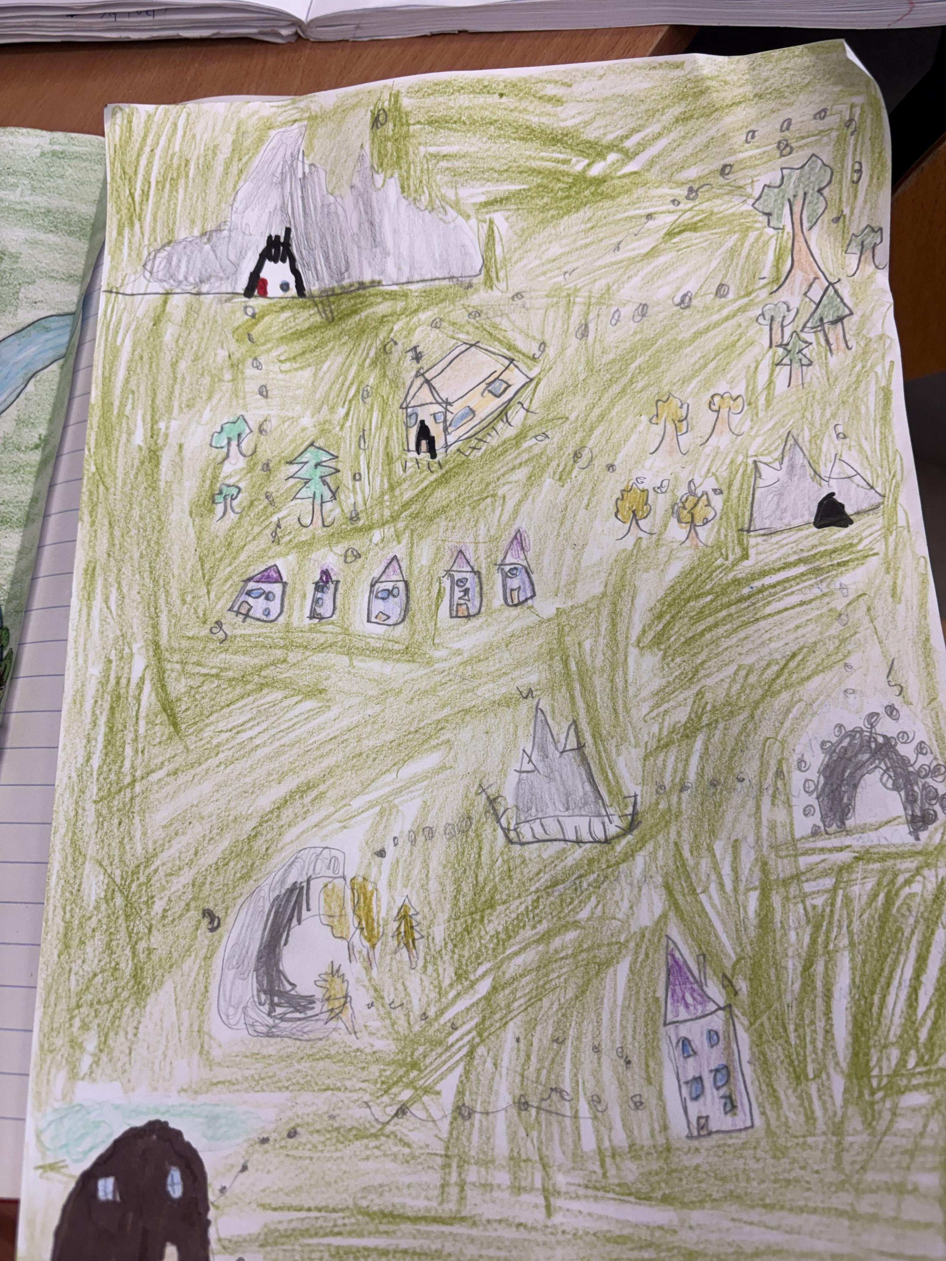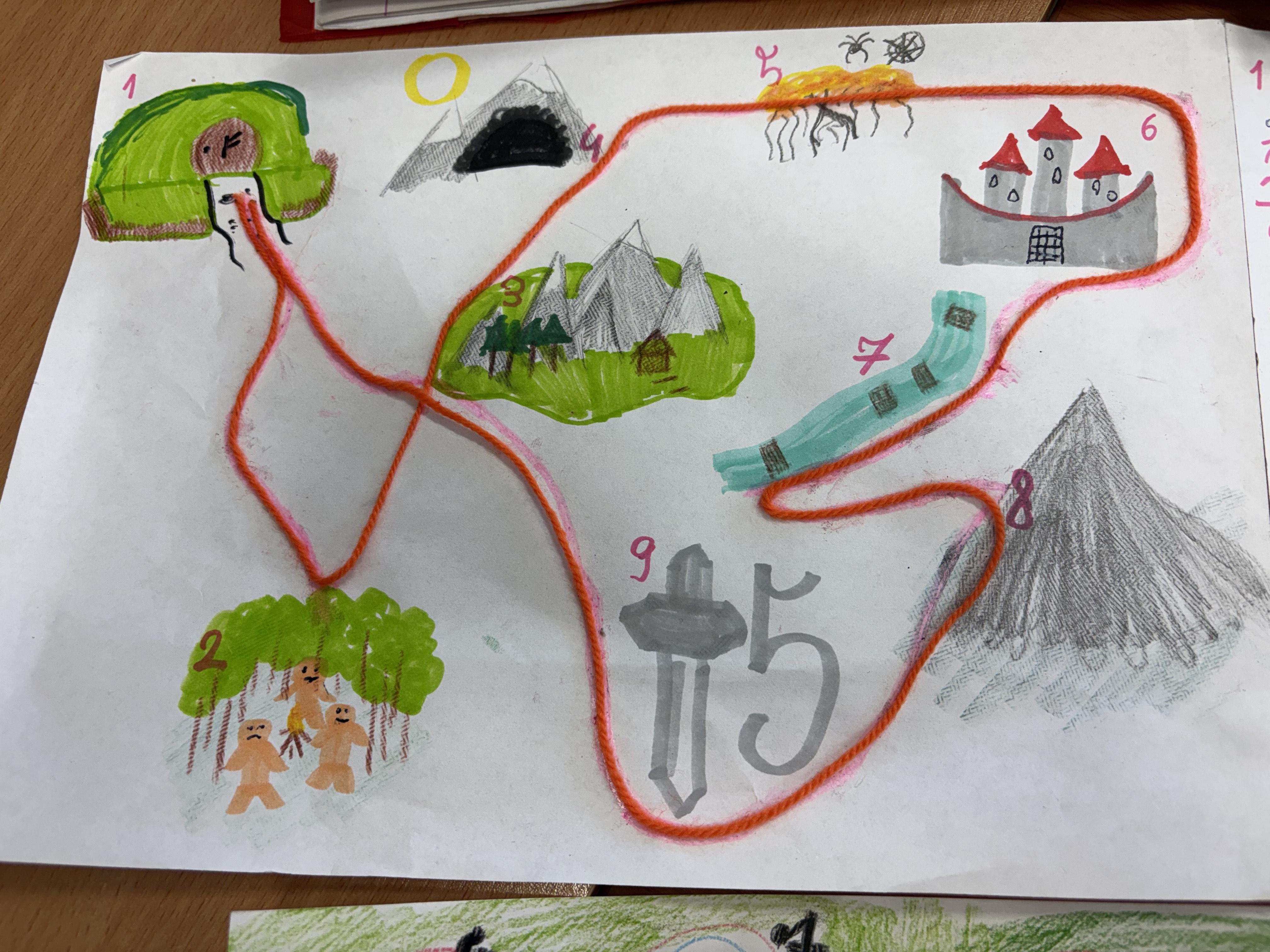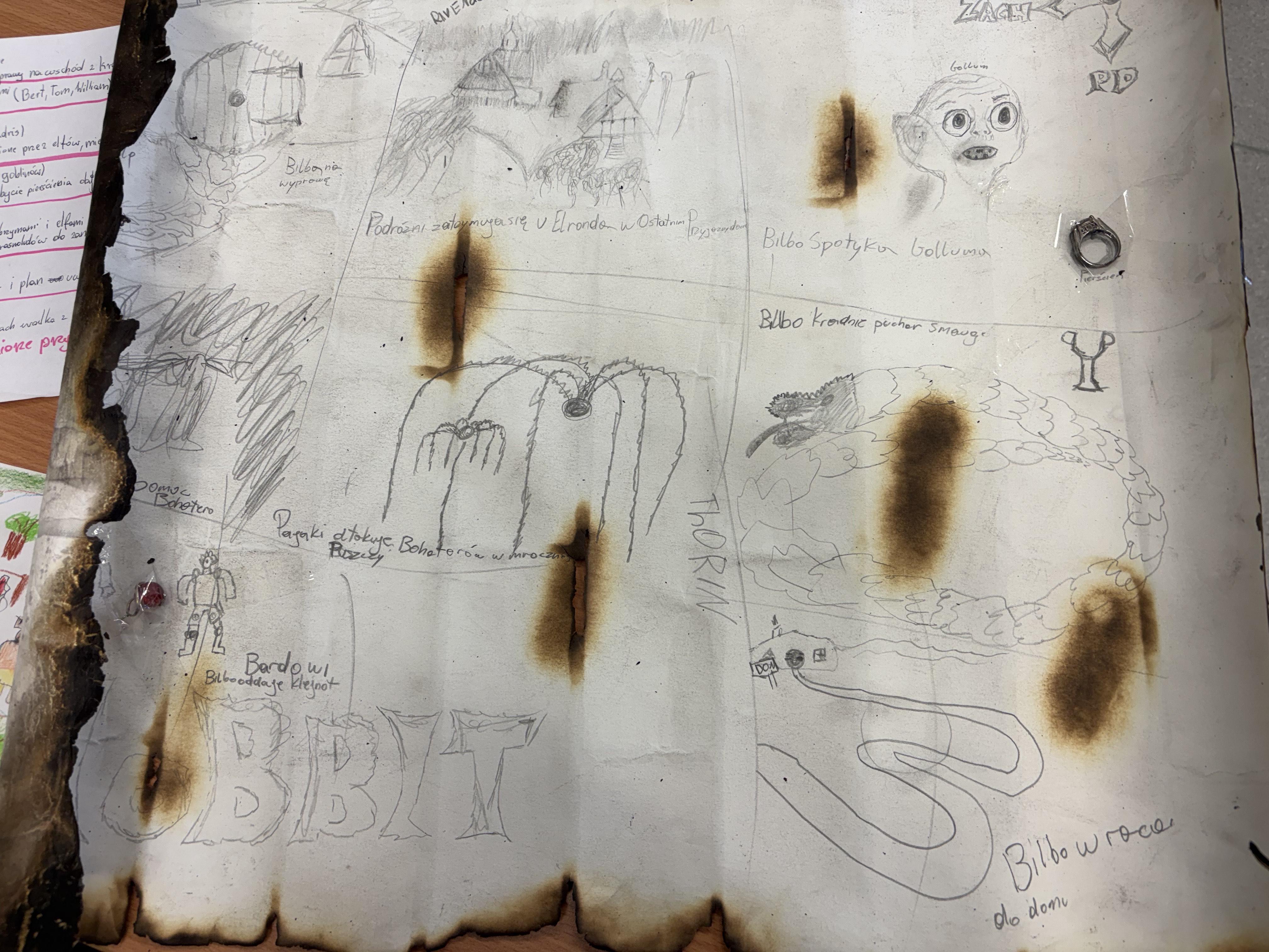 Klasa szósta opracowała plan podróży Bilba na podstawie lektury „Hobbit”. Uczniowie przygotowali ciekawe, pomysłowe mapy przedstawiające kolejne etapy wyprawy, a co najważniejsze – potrafili interesująco o nich opowiadać.