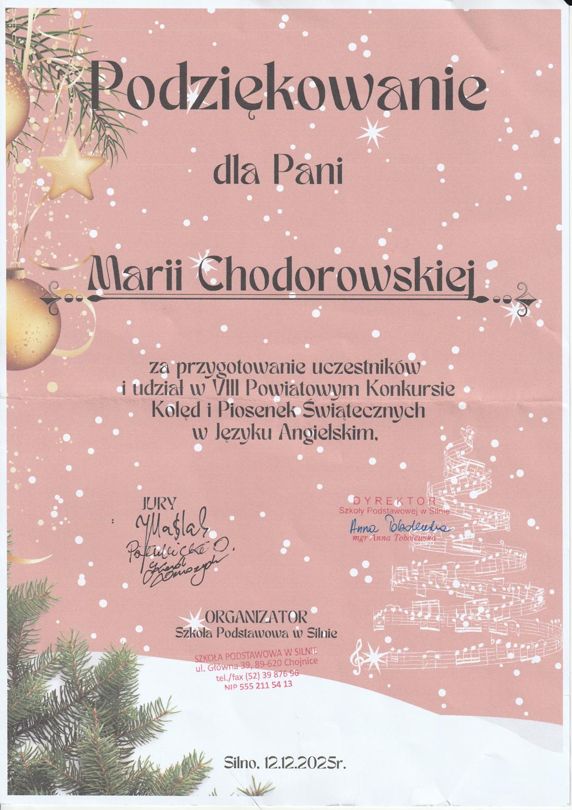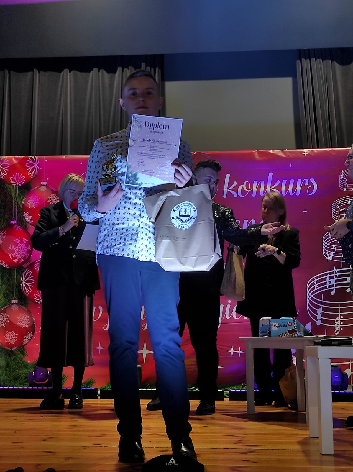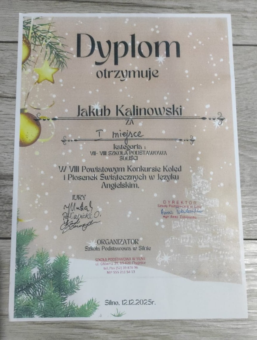 Z ogromną radością informujemy, że Kuba Kalinowski, uczeń klasy siódmej, zajął I miejsce w Powiatowym Konkursie Kolęd i Piosenek Świątecznych w Języku Angielskim.