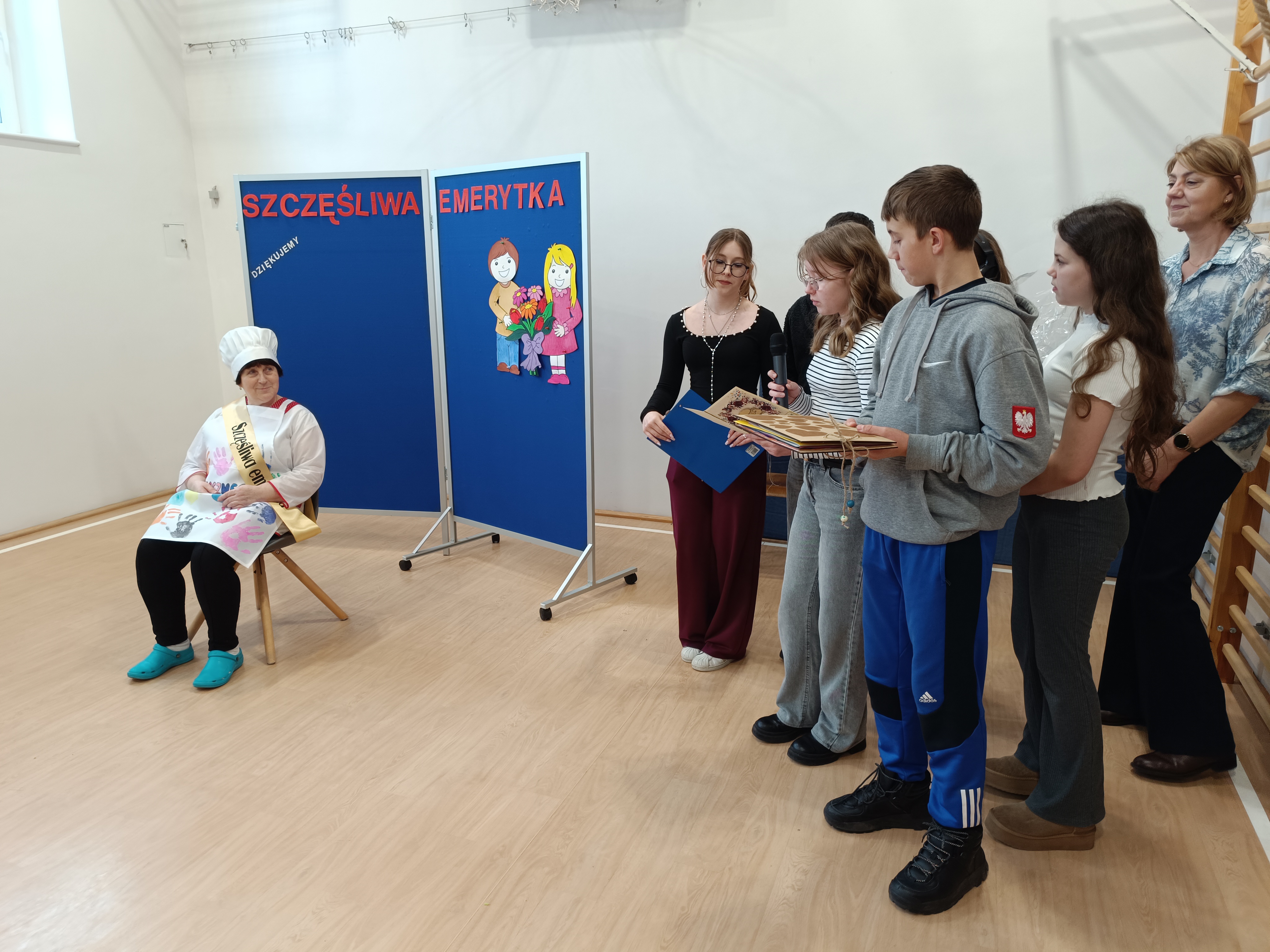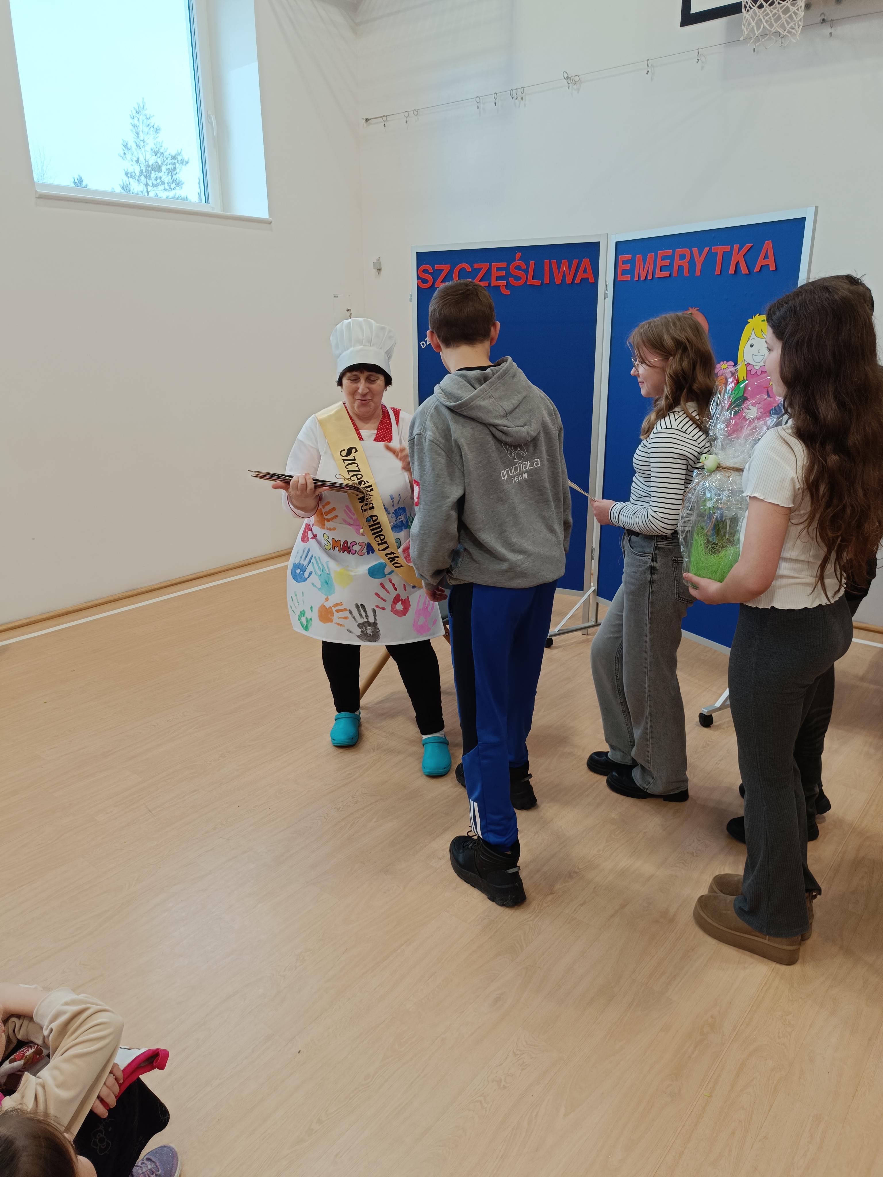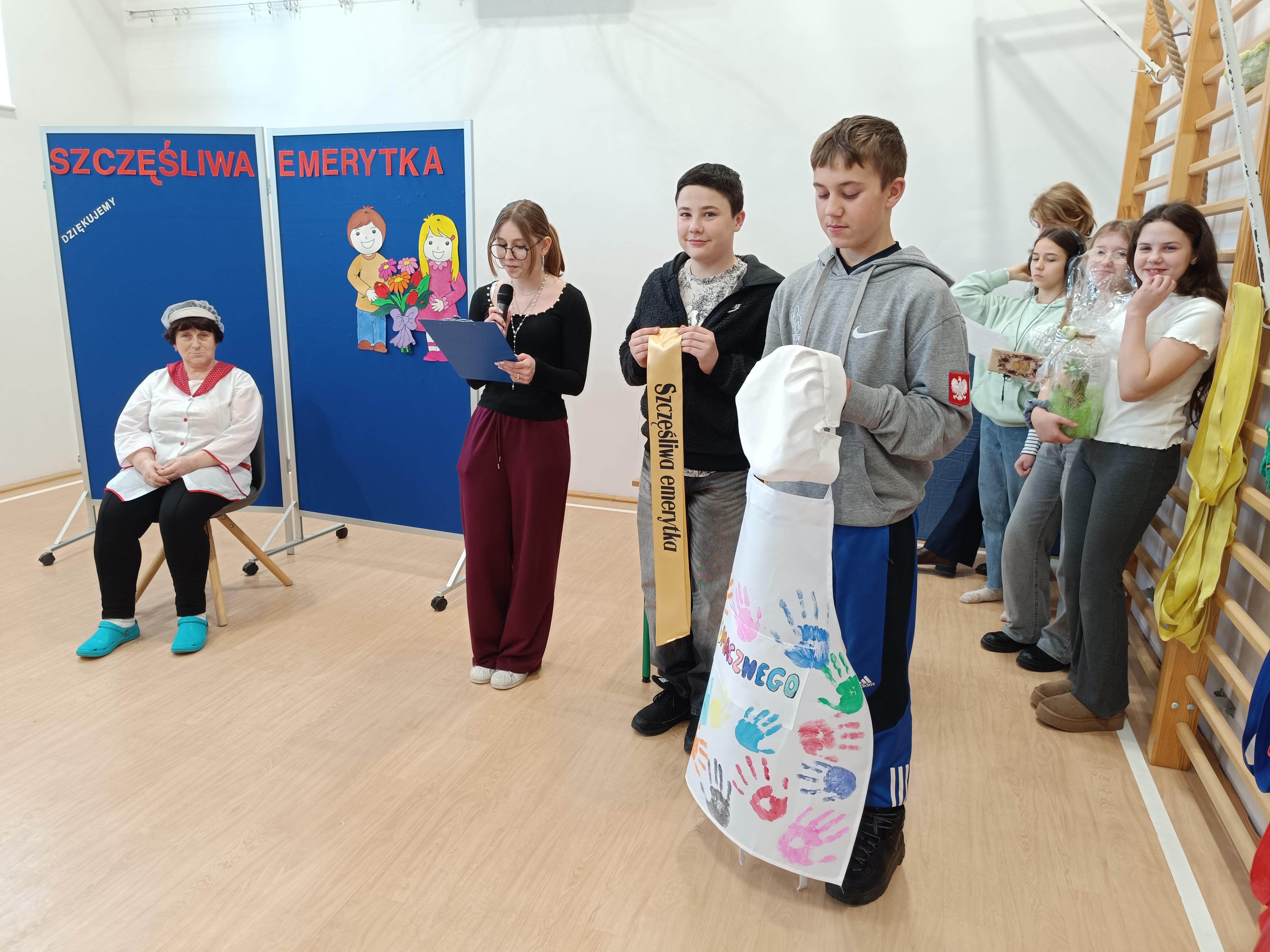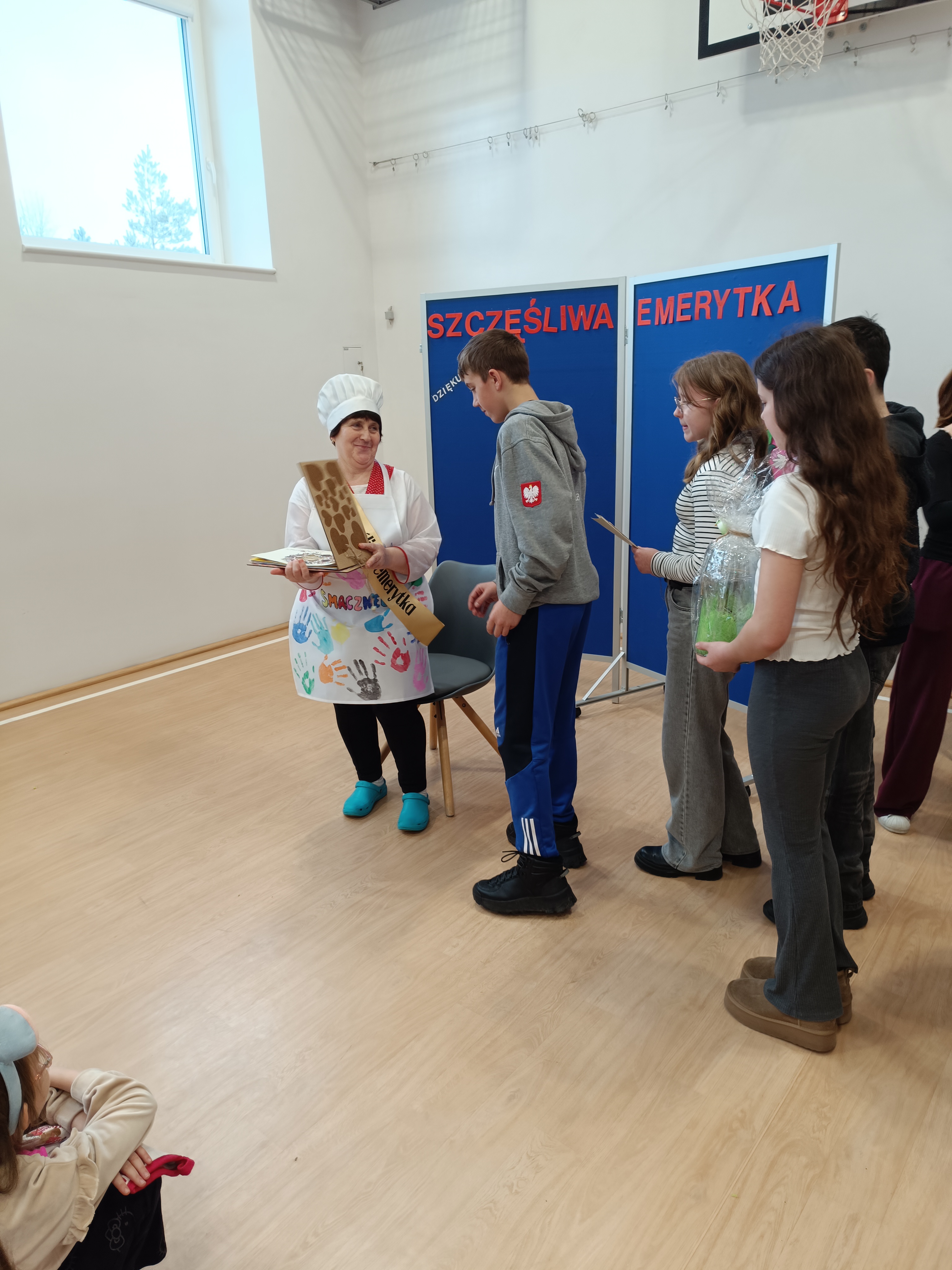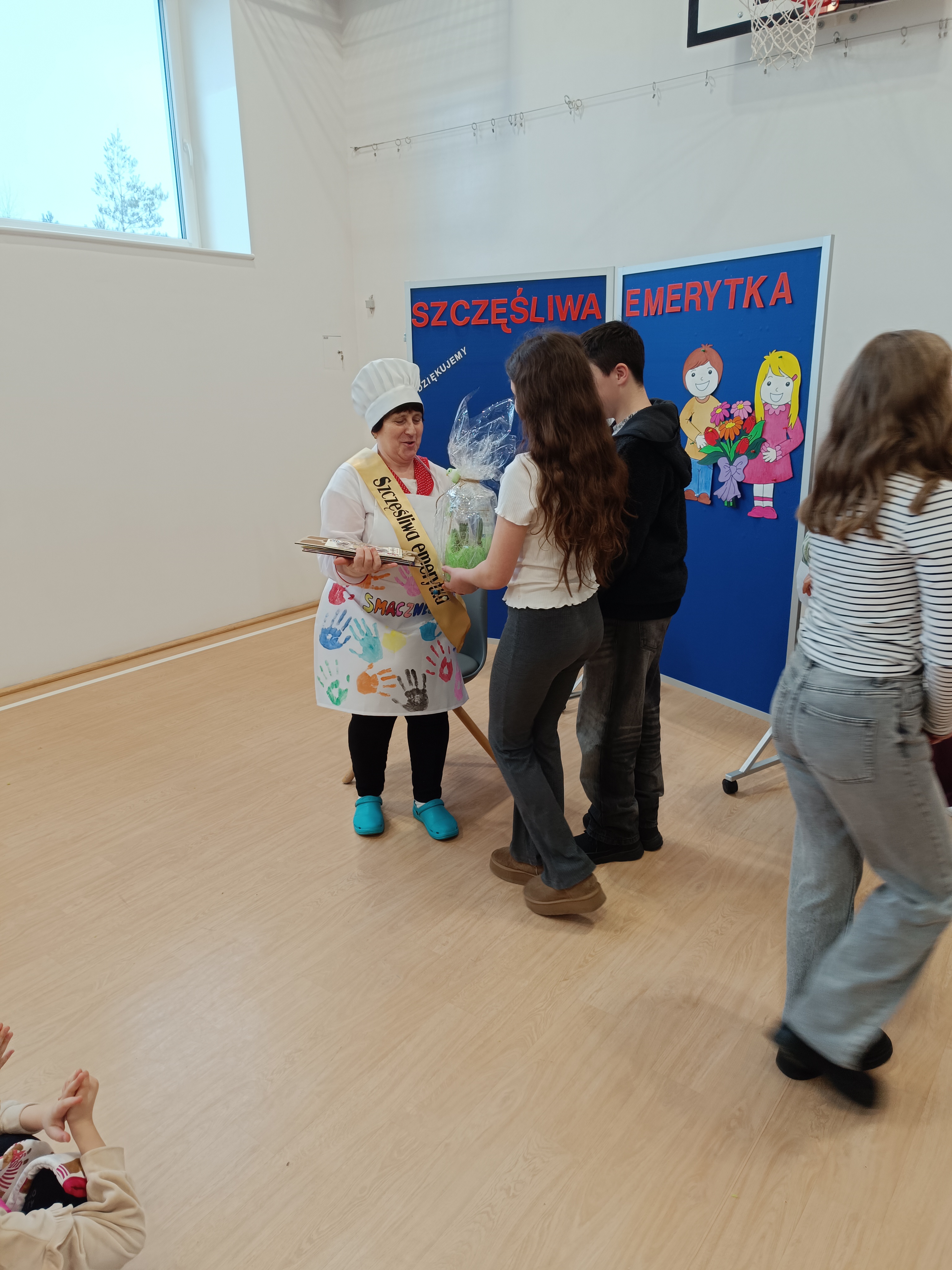 Samorząd Uczniowski przygotował specjalny fartuszek kucharski ozdobiony odciskami dłoni uczniów – symboliczny gest pełen wdzięczności i serca dla Pani Beni. Pani Bernadetta otrzymała również piękną szarfę z napisem „Szczęśliwa Emerytka” oraz album pamiątkowy, w którym każda klasa miała swoją stronę z podziękowaniami i wspomnieniami.