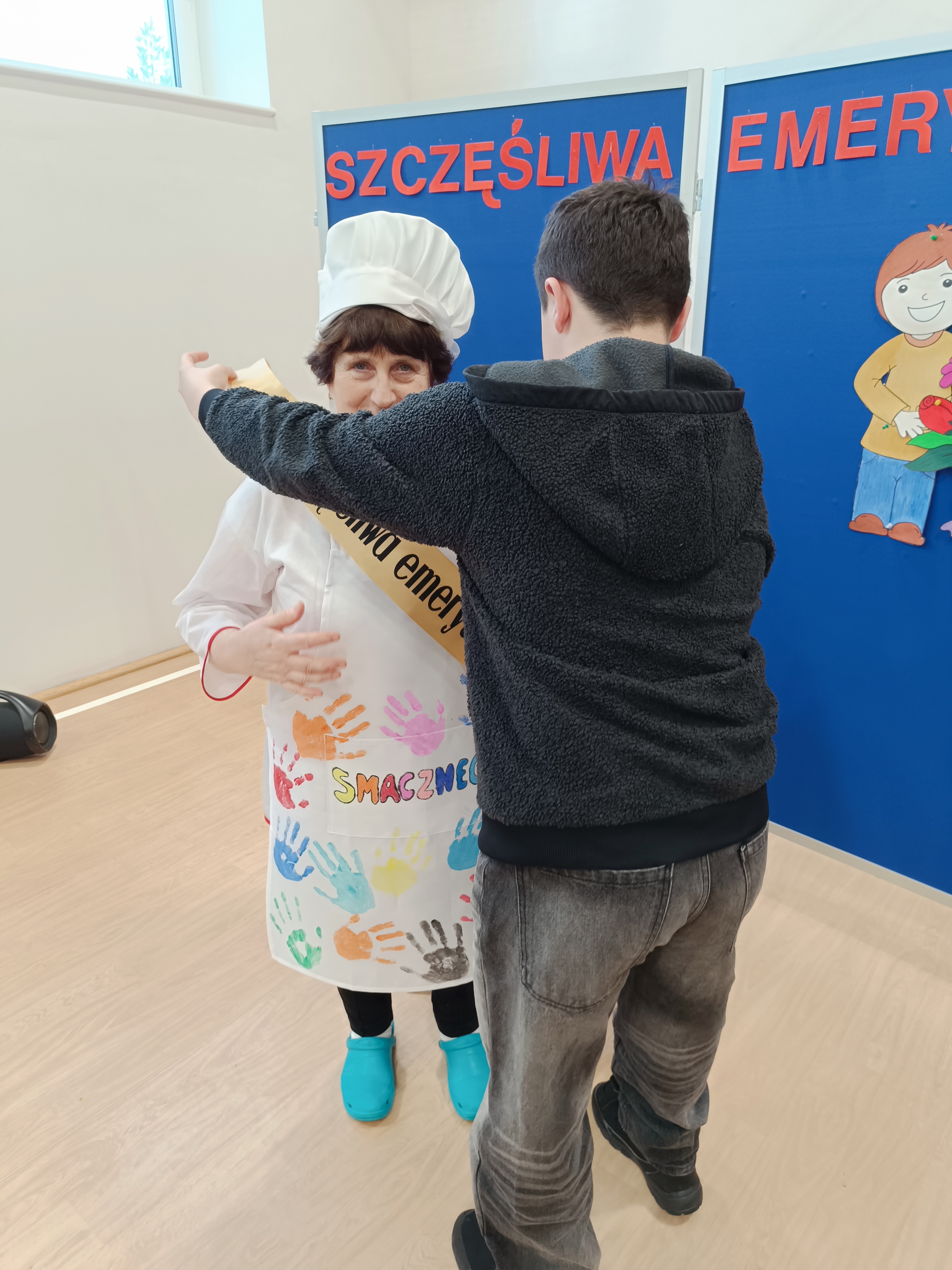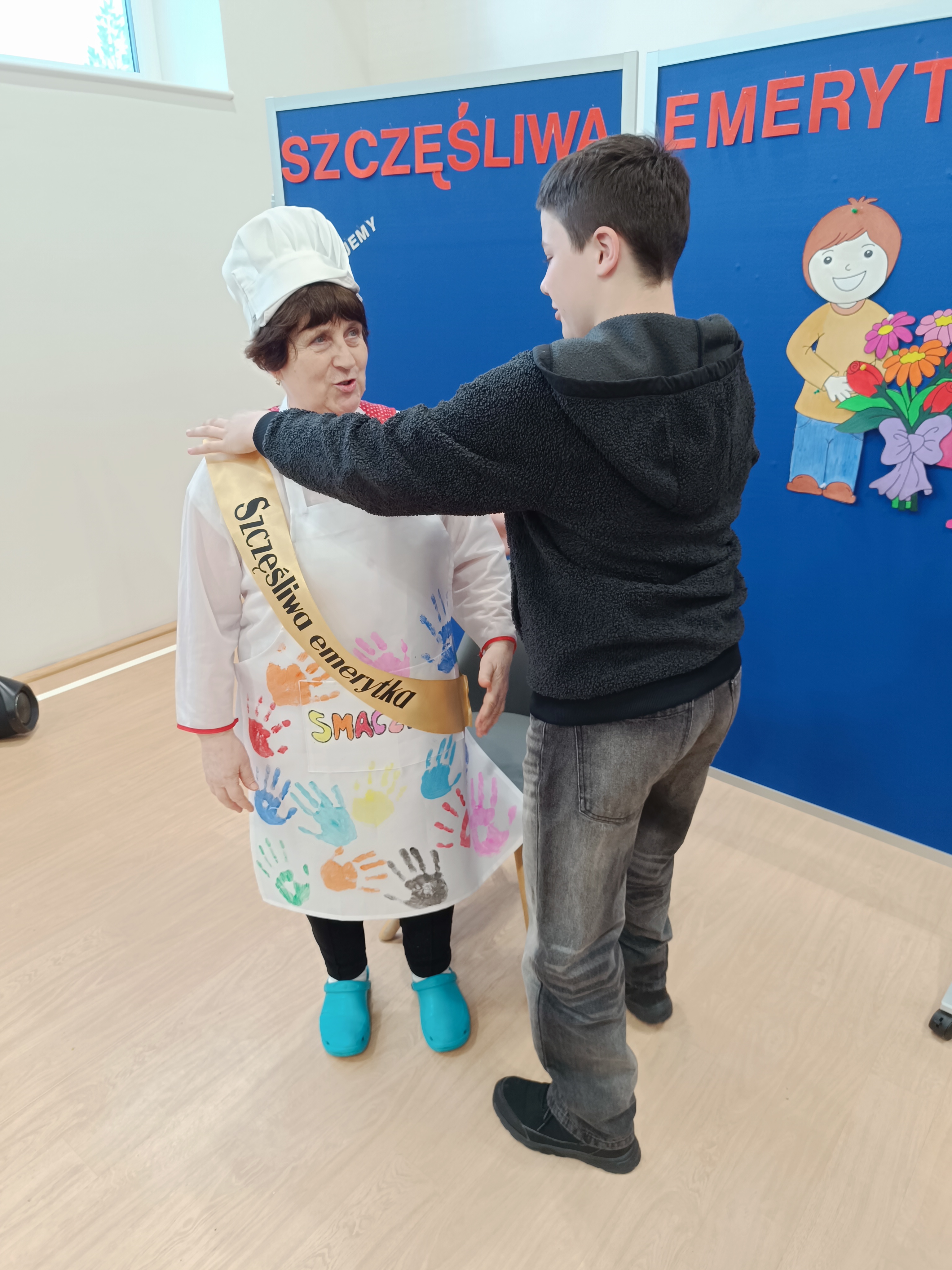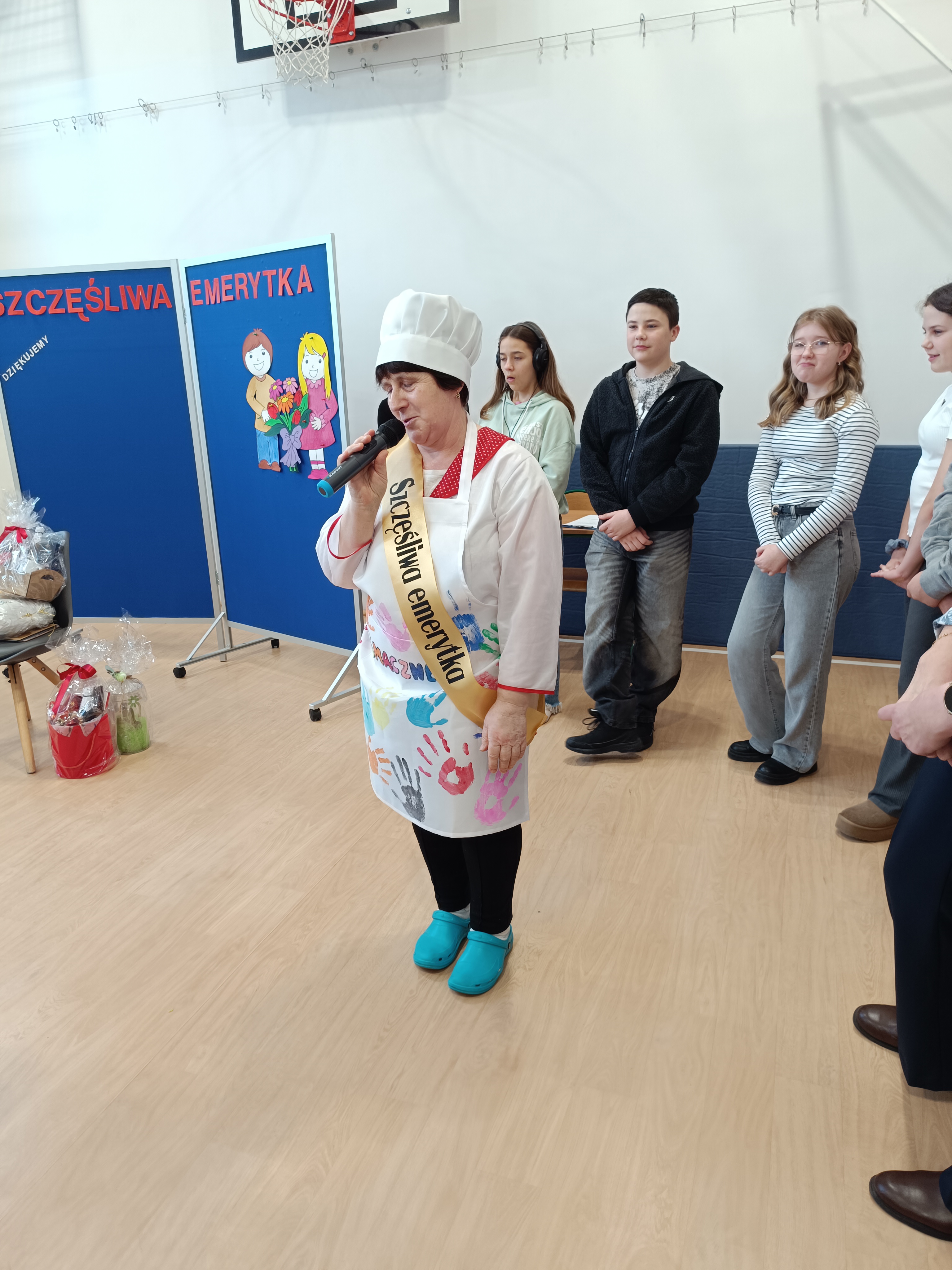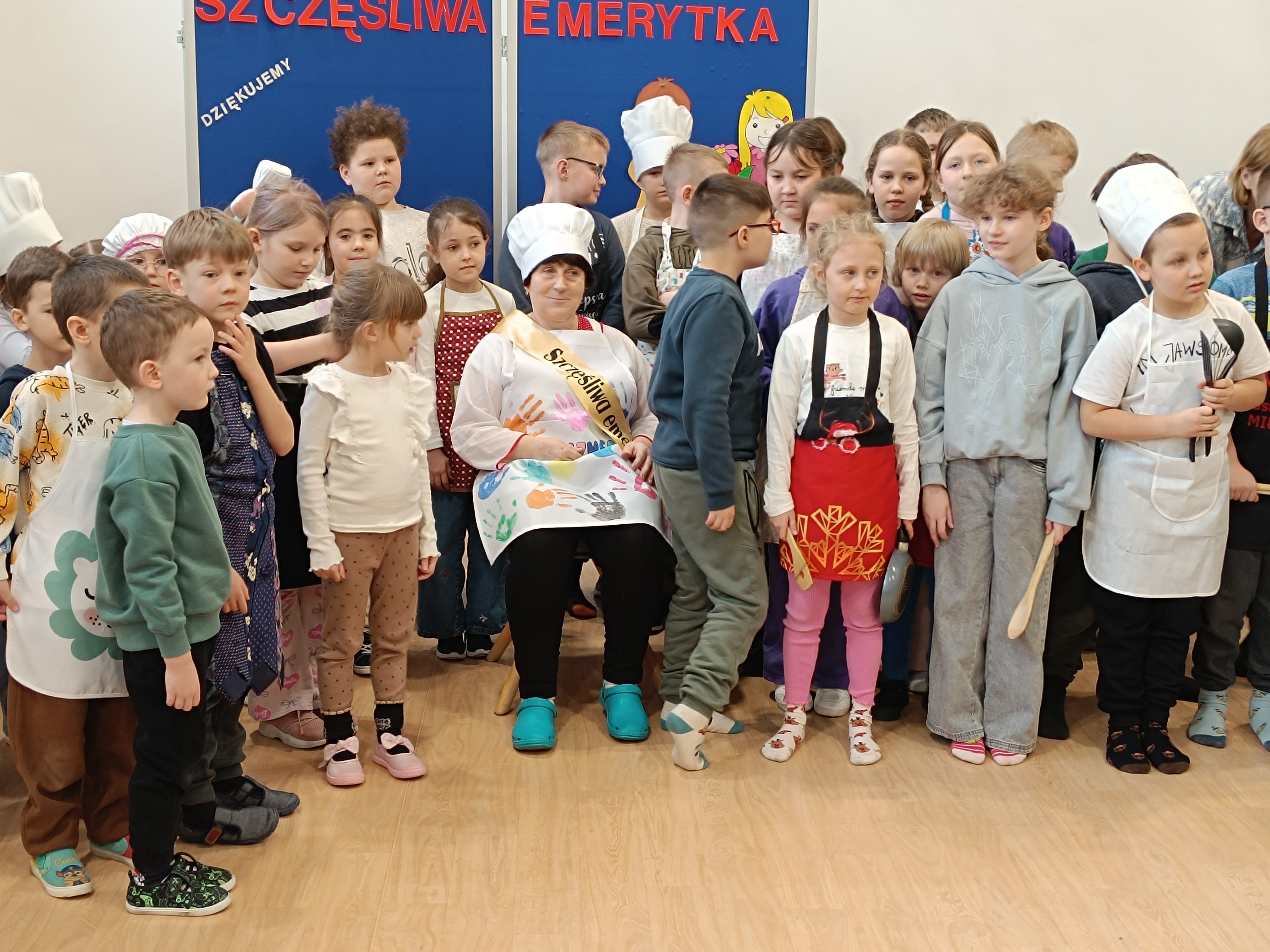 Samorząd Uczniowski przygotował specjalny fartuszek kucharski ozdobiony odciskami dłoni uczniów – symboliczny gest pełen wdzięczności i serca dla Pani Beni. Pani Bernadetta otrzymała również piękną szarfę z napisem „Szczęśliwa Emerytka” oraz album pamiątkowy, w którym każda klasa miała swoją stronę z podziękowaniami i wspomnieniami.