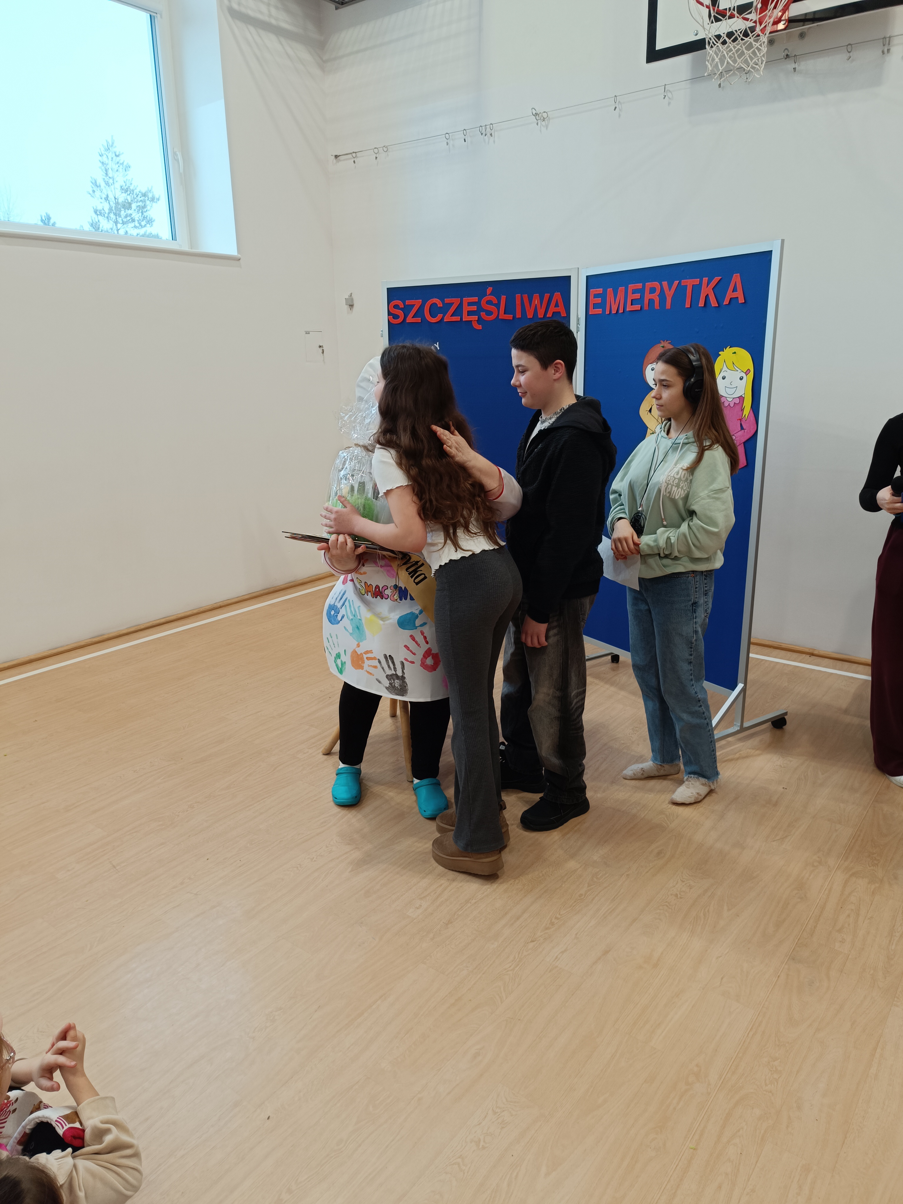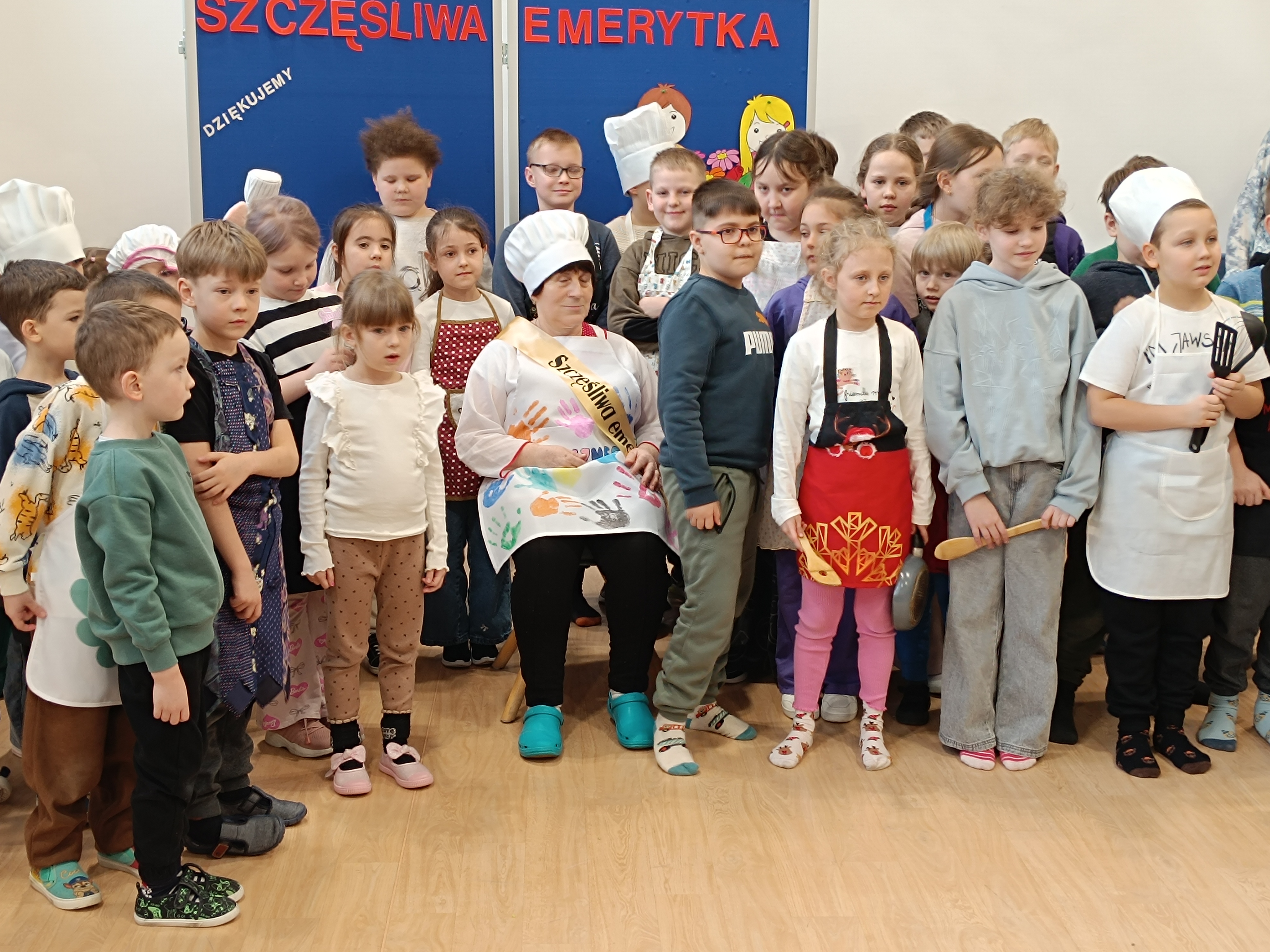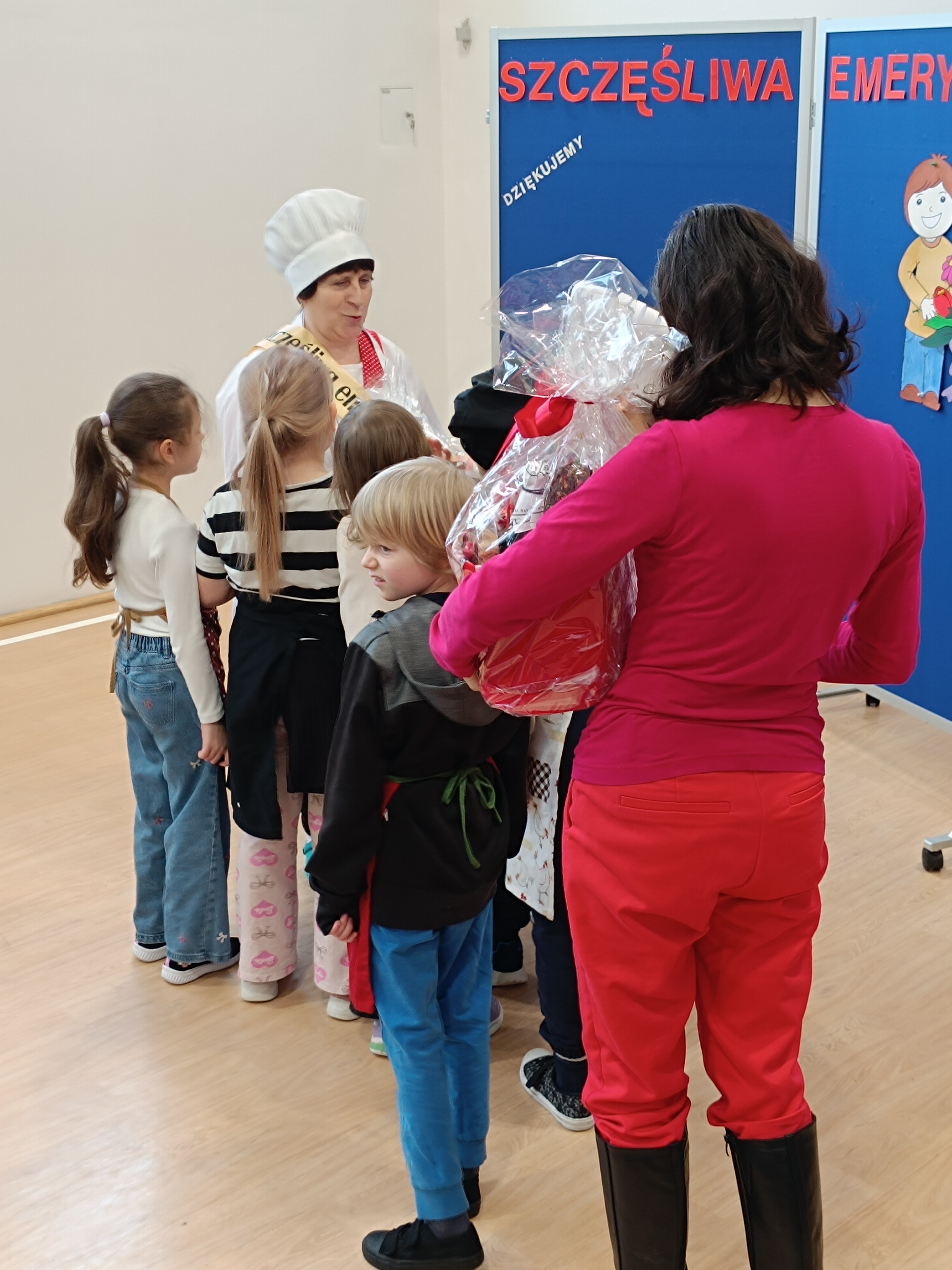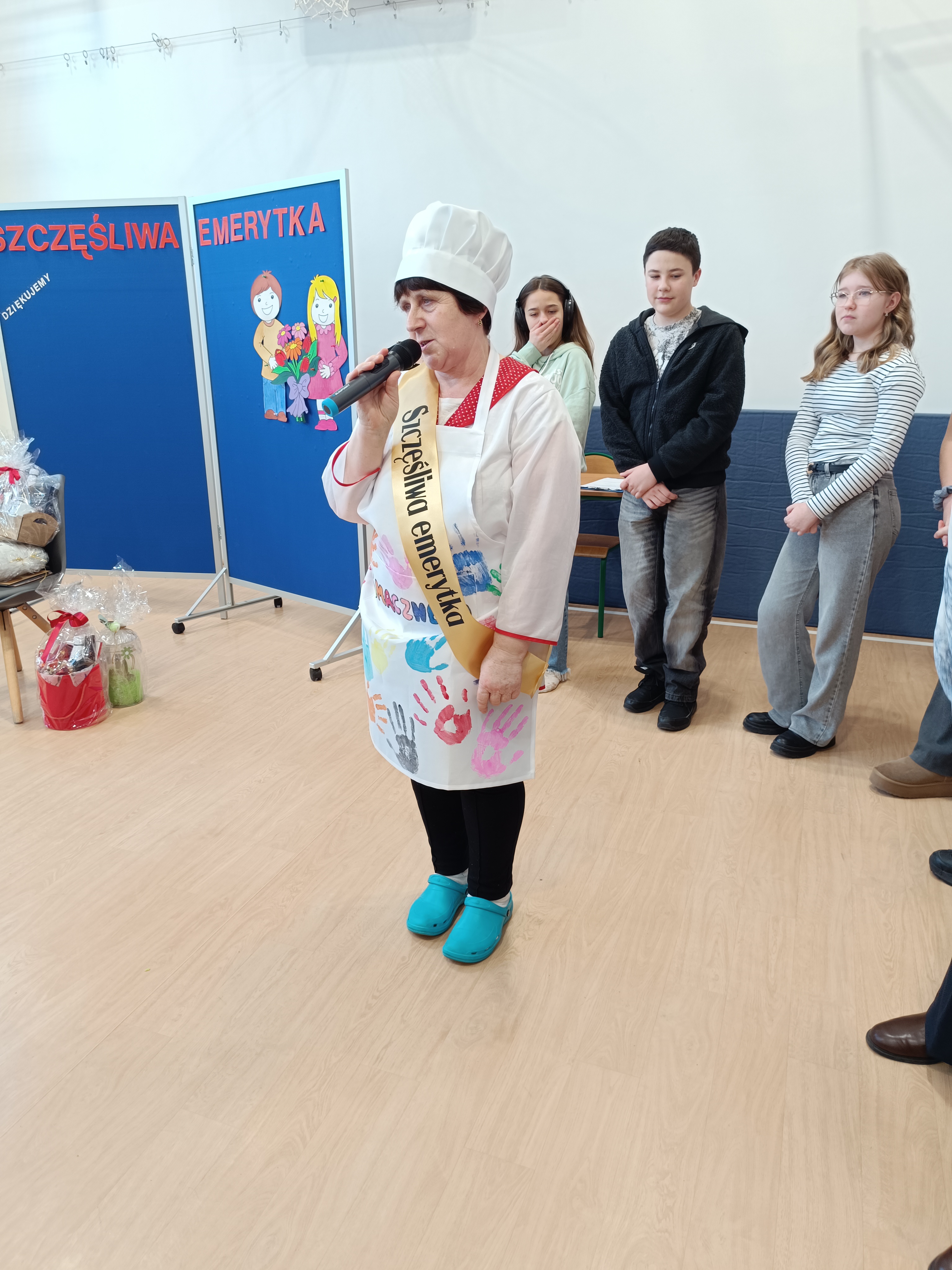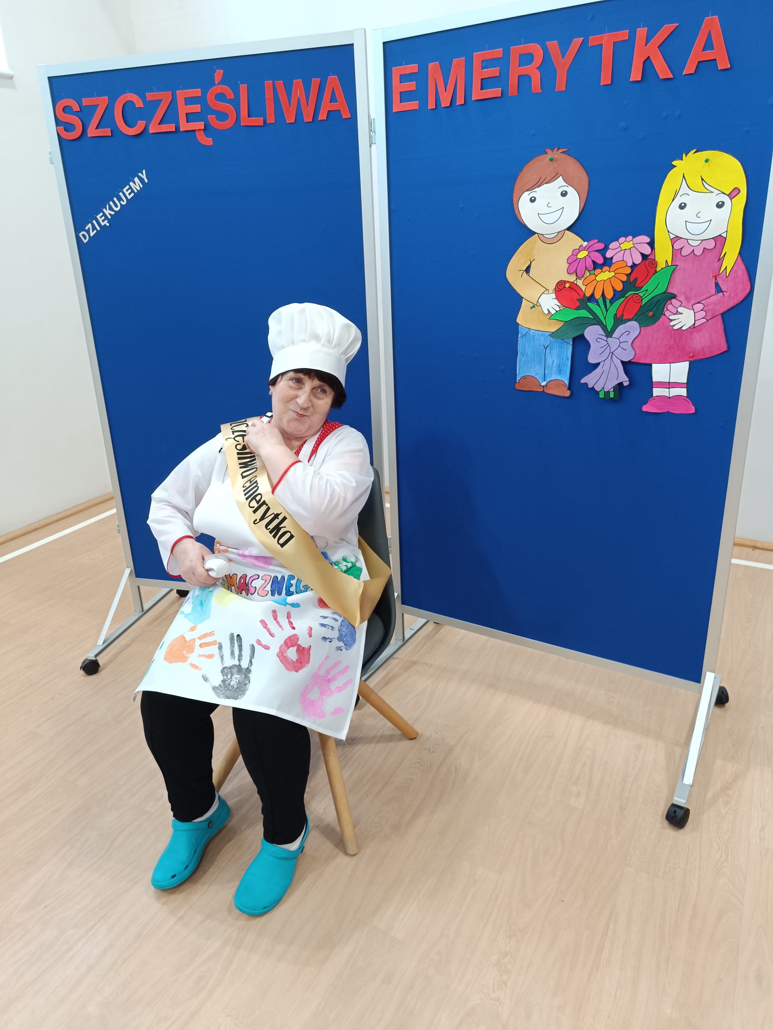 Samorząd Uczniowski przygotował specjalny fartuszek kucharski ozdobiony odciskami dłoni uczniów – symboliczny gest pełen wdzięczności i serca dla Pani Beni. Pani Bernadetta otrzymała również piękną szarfę z napisem „Szczęśliwa Emerytka” oraz album pamiątkowy, w którym każda klasa miała swoją stronę z podziękowaniami i wspomnieniami.