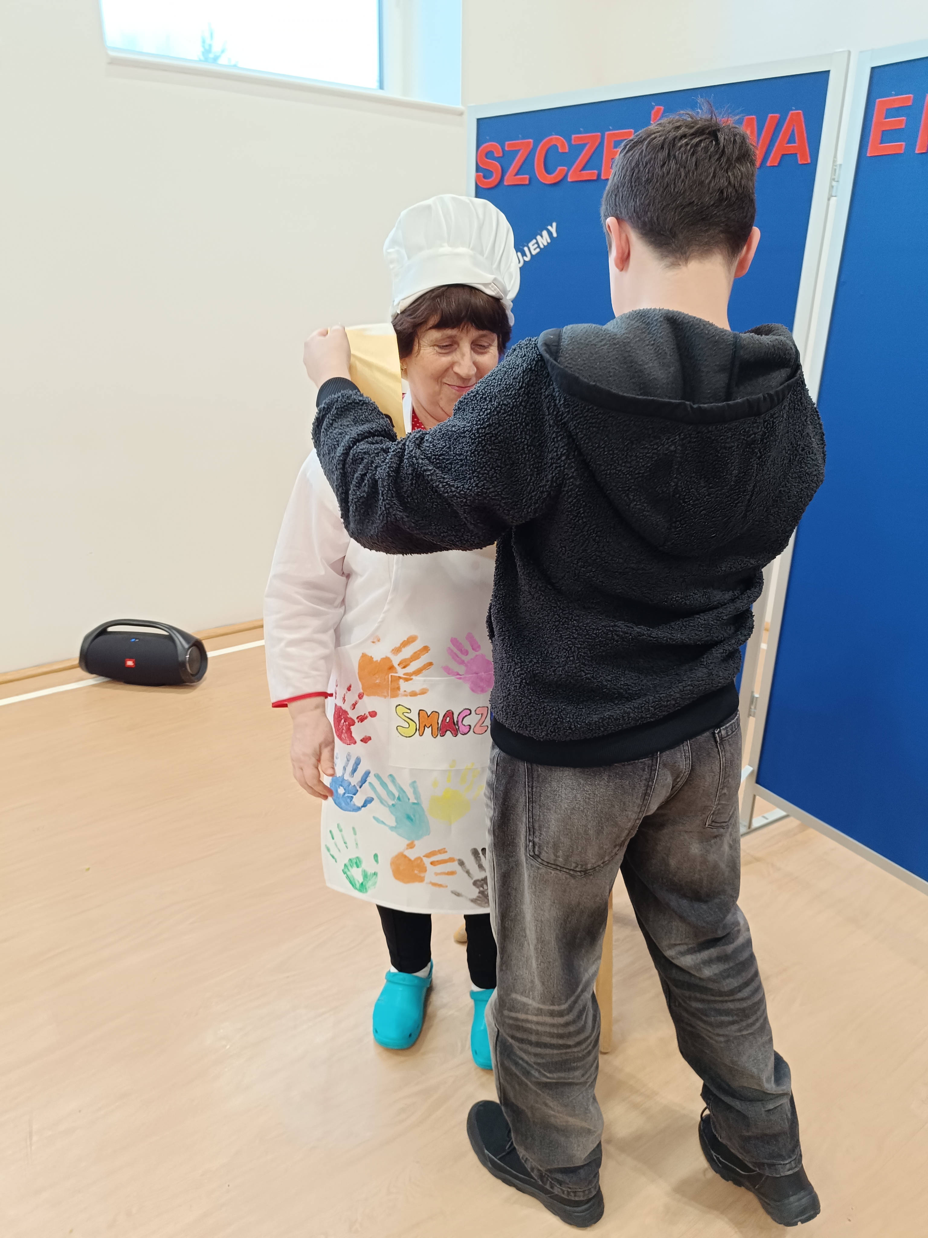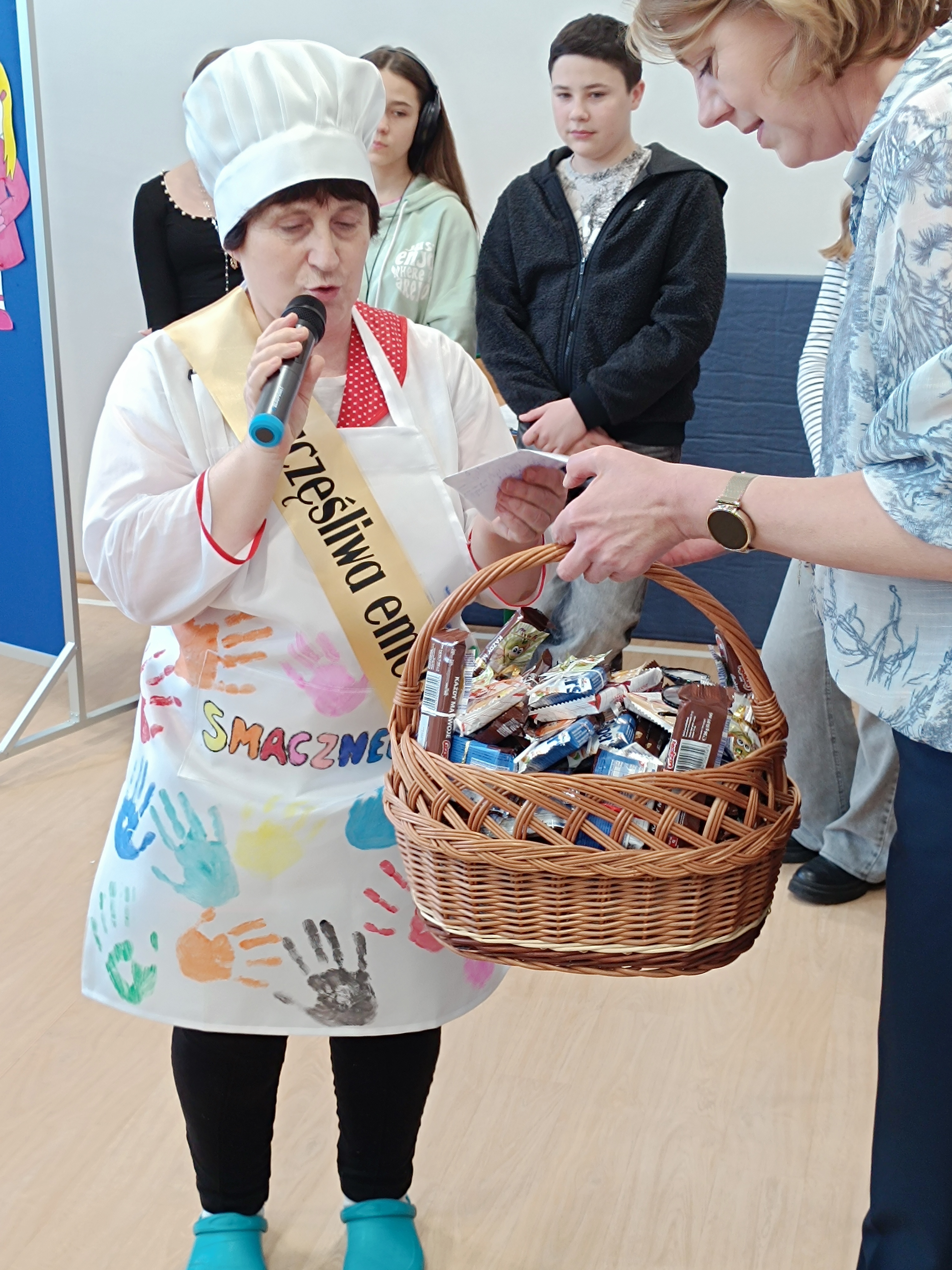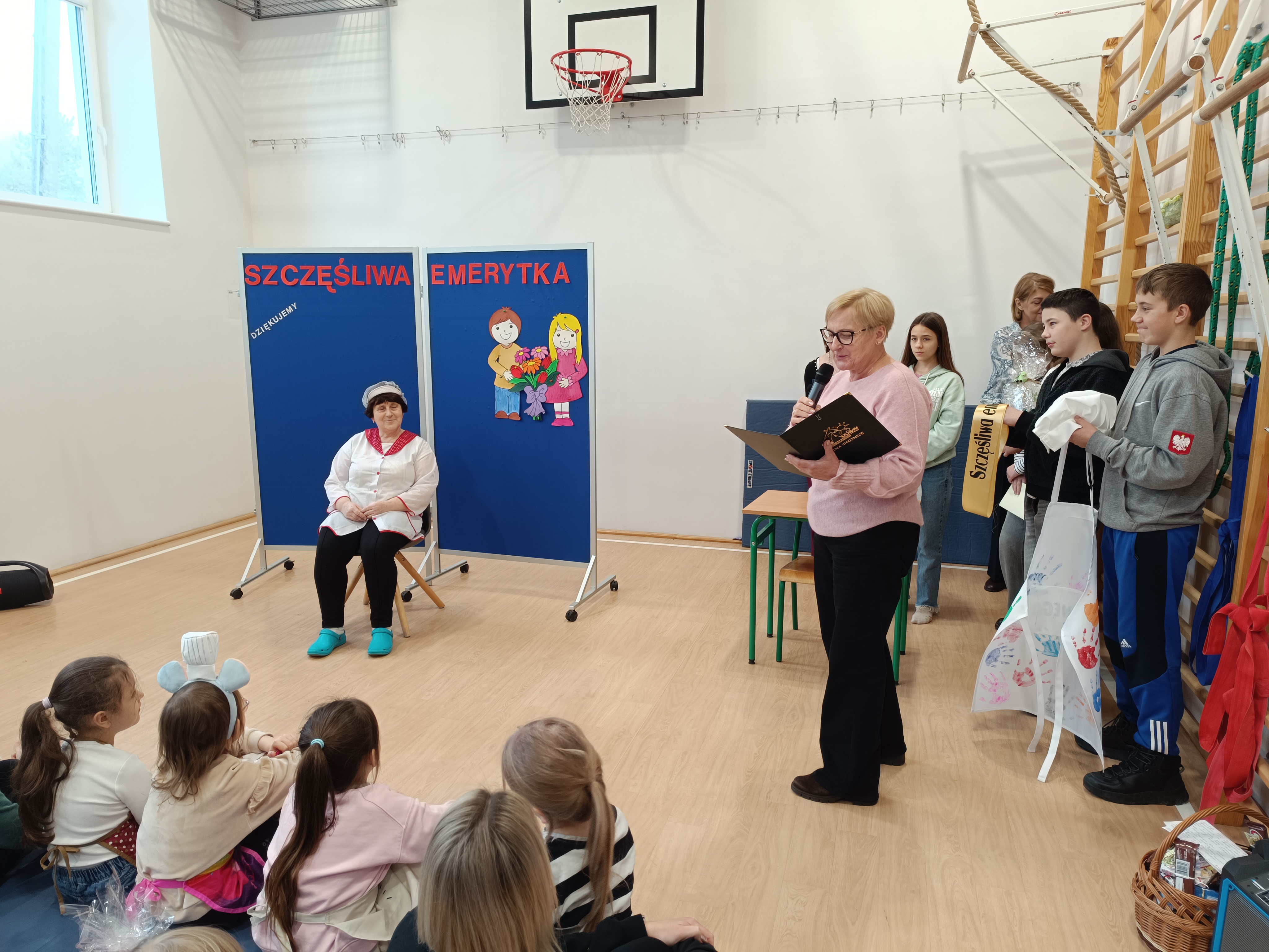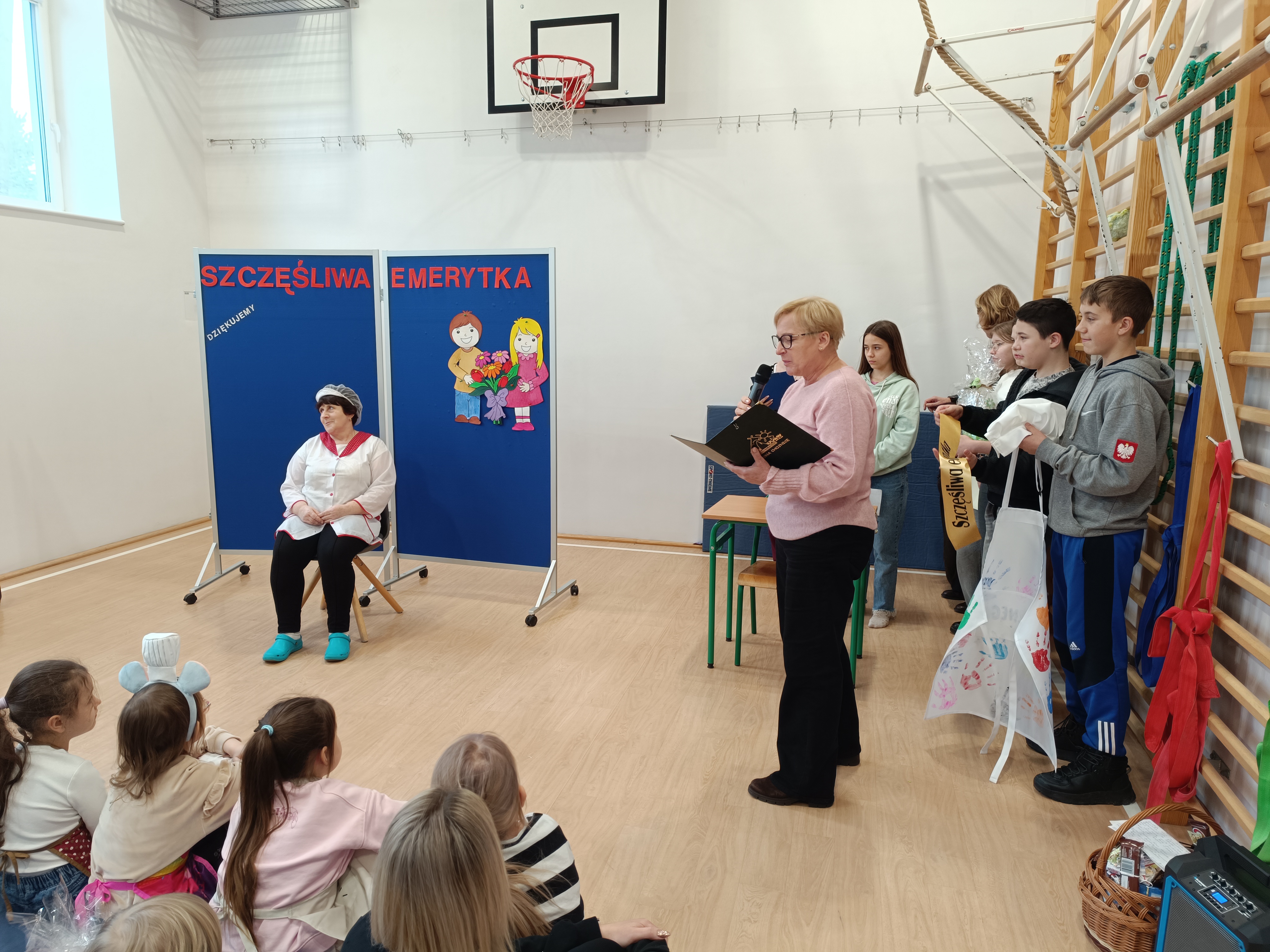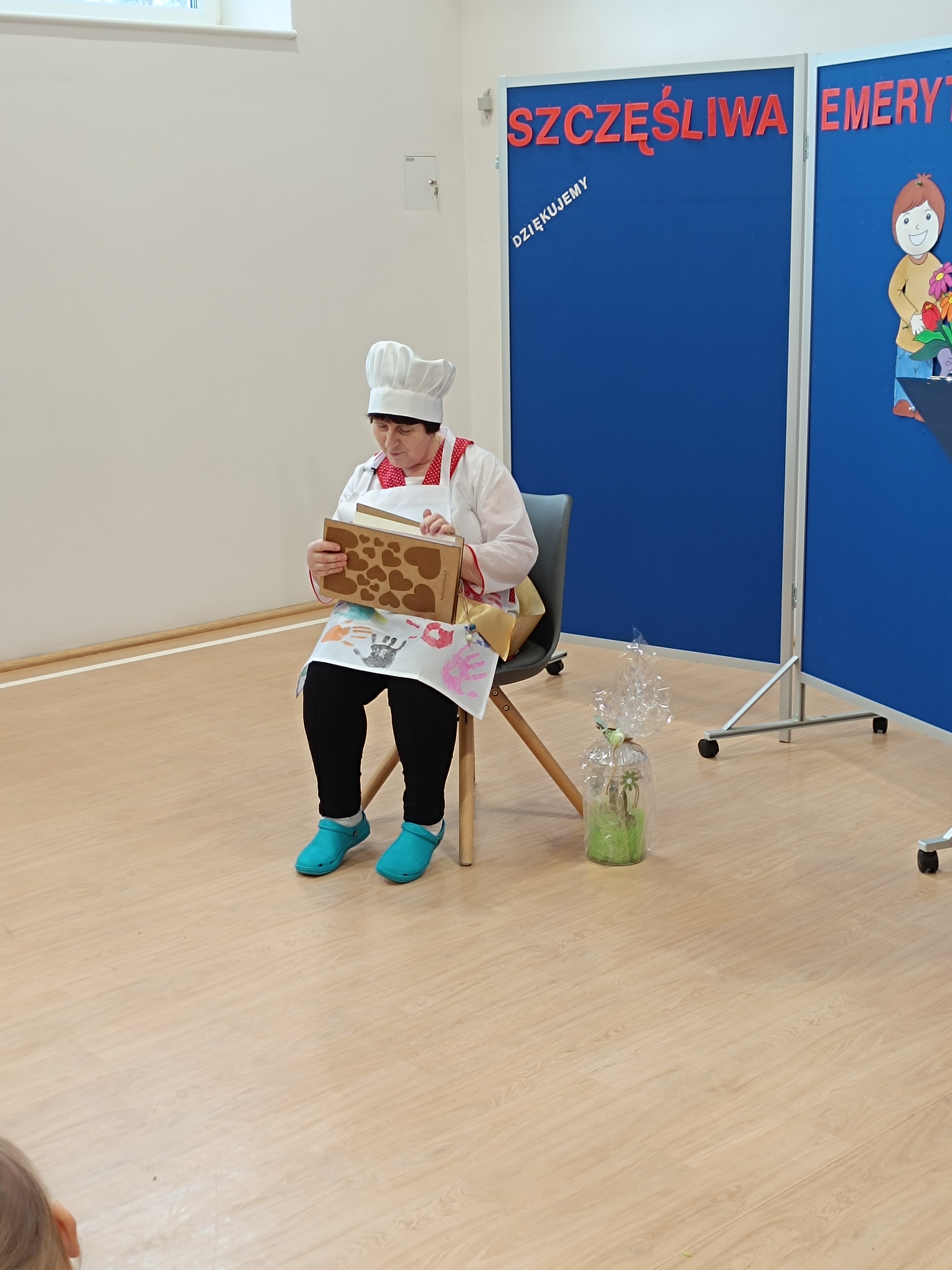 Samorząd Uczniowski przygotował specjalny fartuszek kucharski ozdobiony odciskami dłoni uczniów – symboliczny gest pełen wdzięczności i serca dla Pani Beni. Pani Bernadetta otrzymała również piękną szarfę z napisem „Szczęśliwa Emerytka” oraz album pamiątkowy, w którym każda klasa miała swoją stronę z podziękowaniami i wspomnieniami.