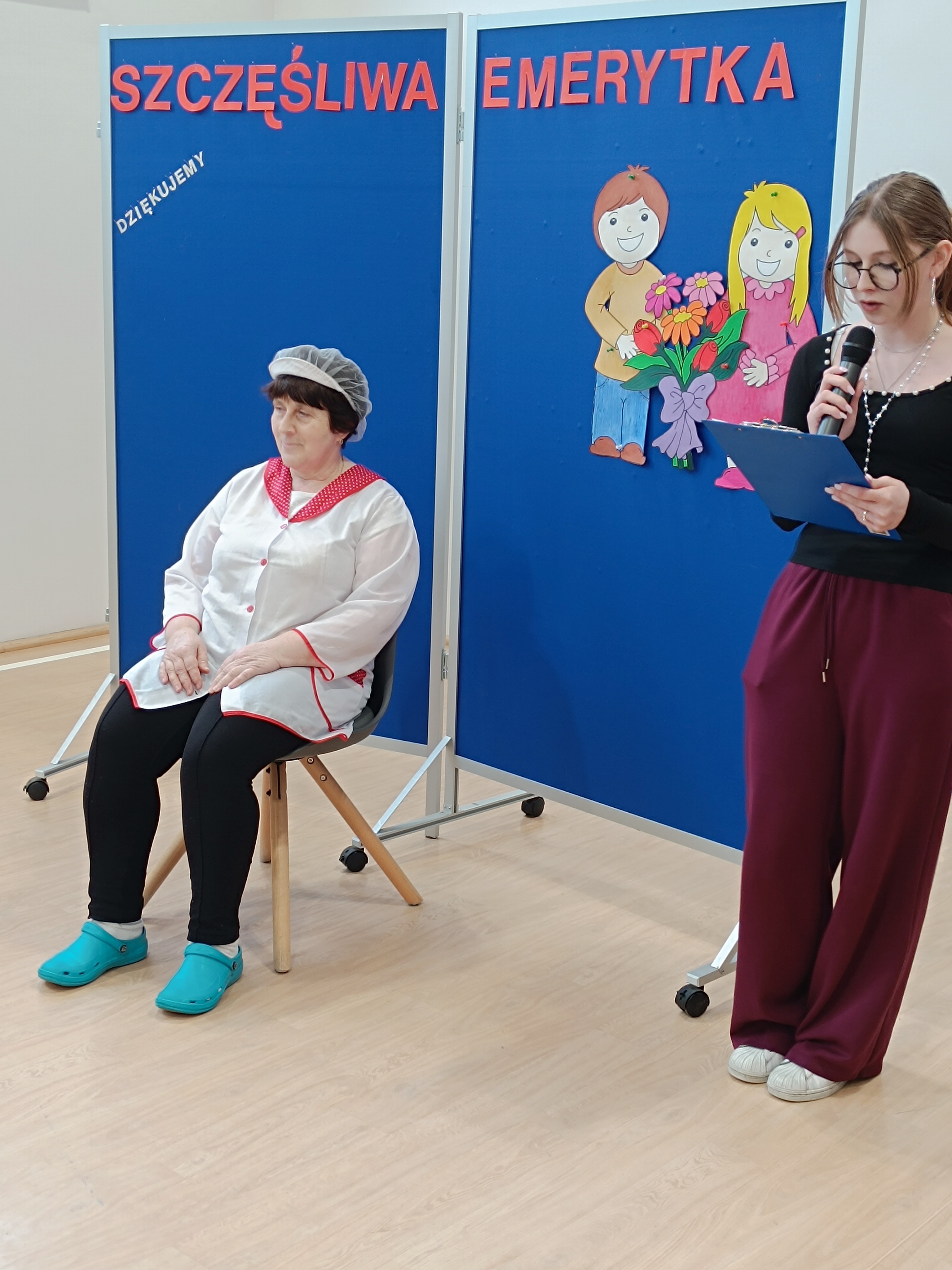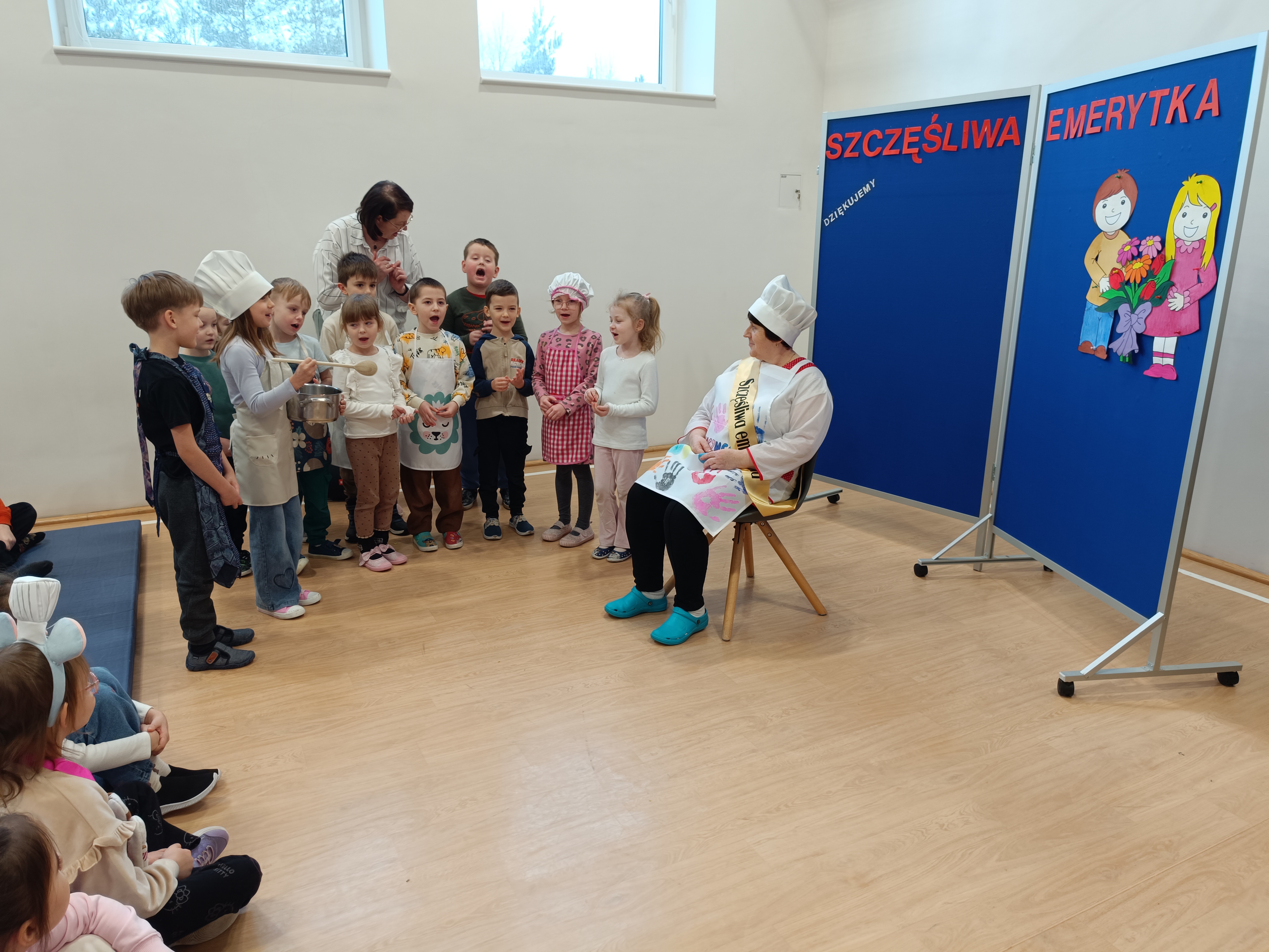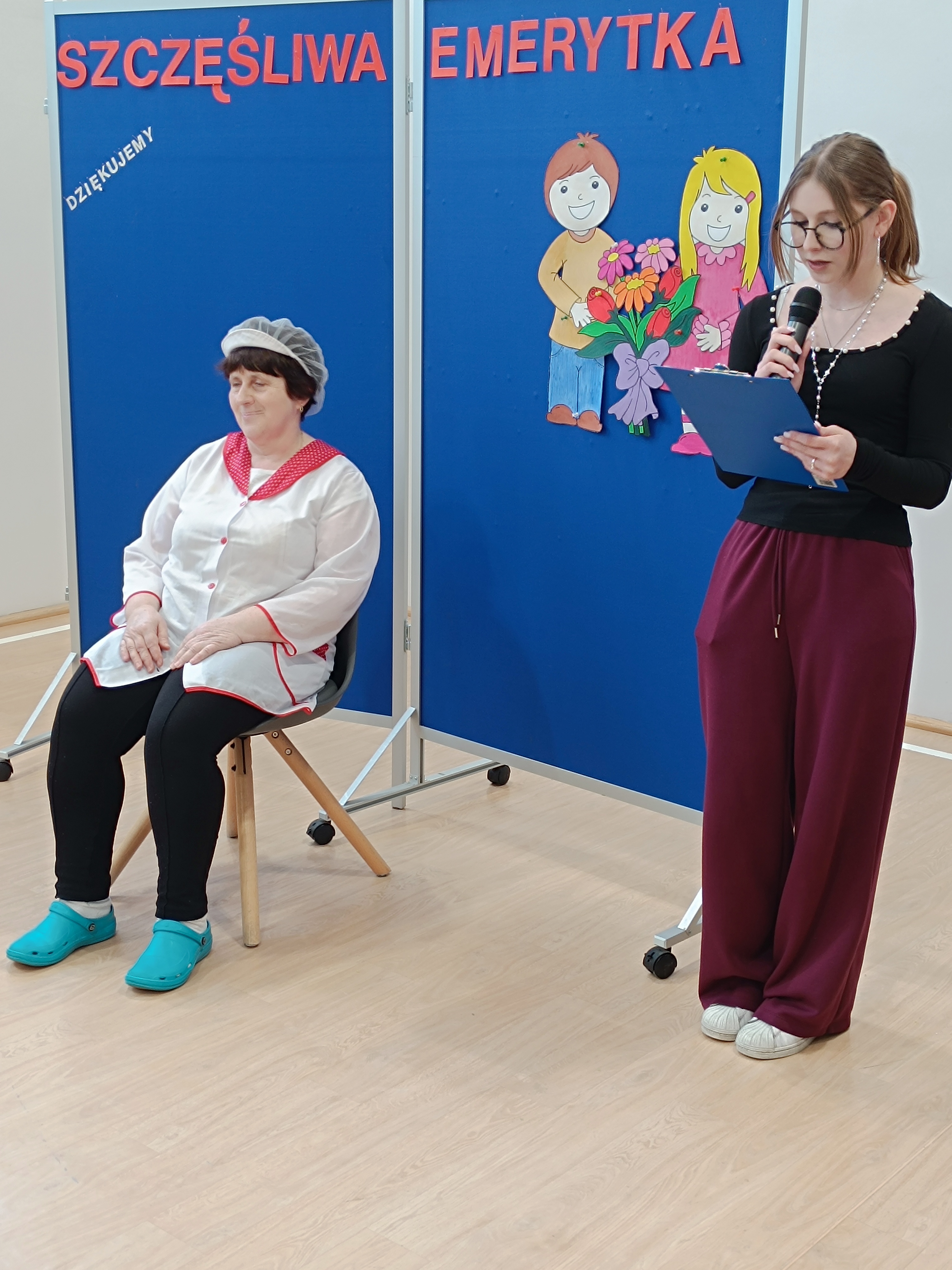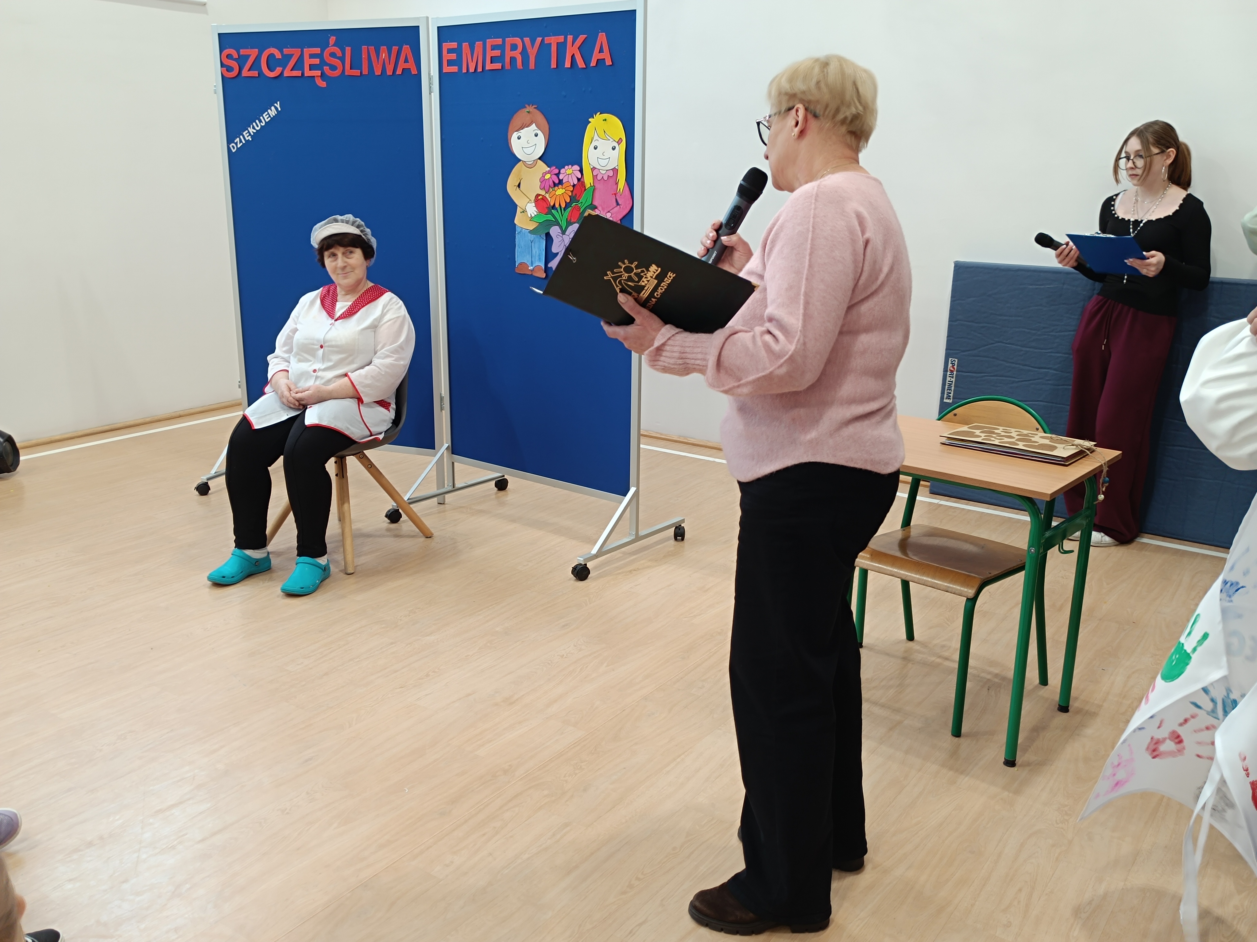 Samorząd Uczniowski przygotował specjalny fartuszek kucharski ozdobiony odciskami dłoni uczniów – symboliczny gest pełen wdzięczności i serca dla Pani Beni. Pani Bernadetta otrzymała również piękną szarfę z napisem „Szczęśliwa Emerytka” oraz album pamiątkowy, w którym każda klasa miała swoją stronę z podziękowaniami i wspomnieniami.