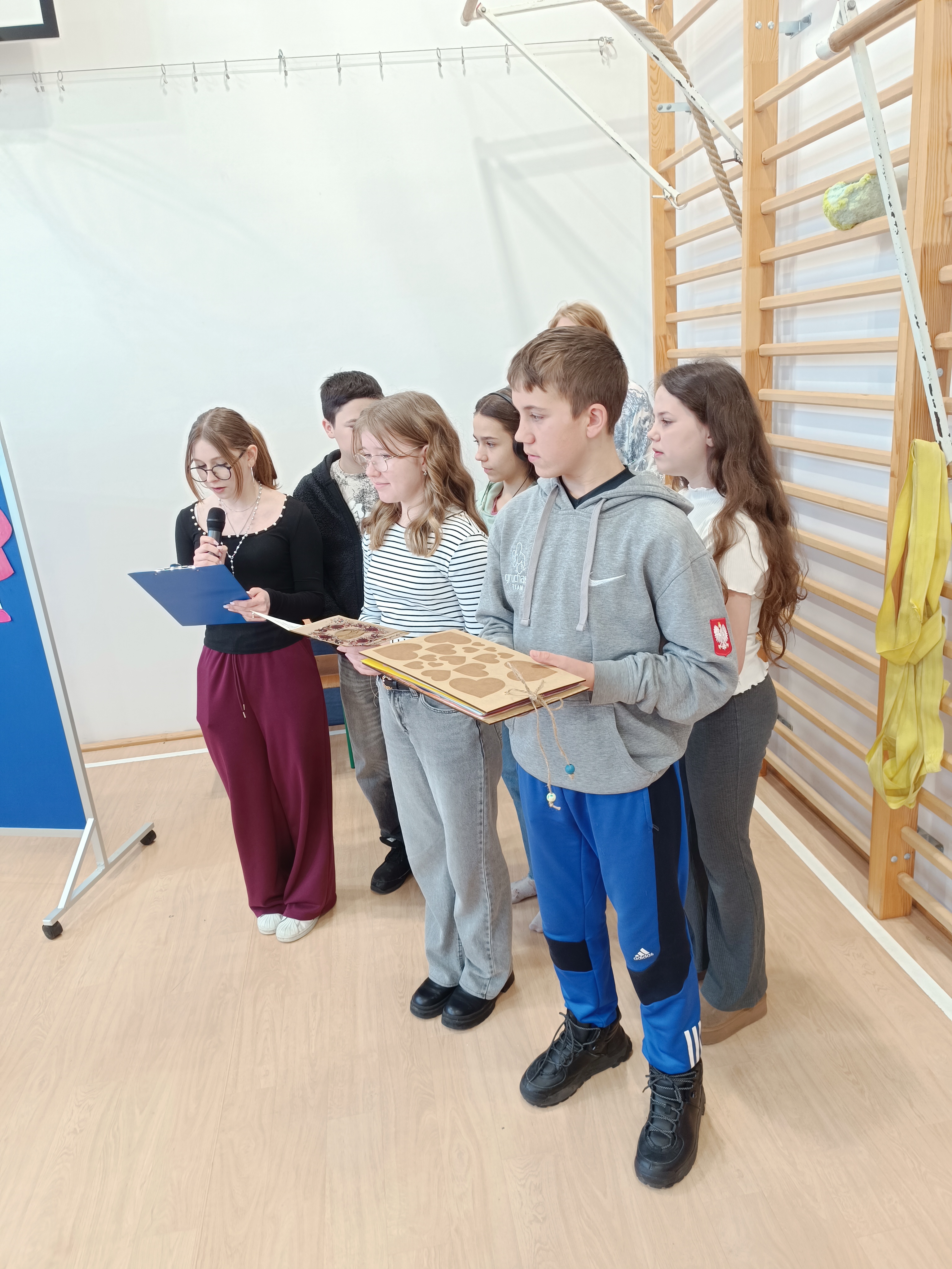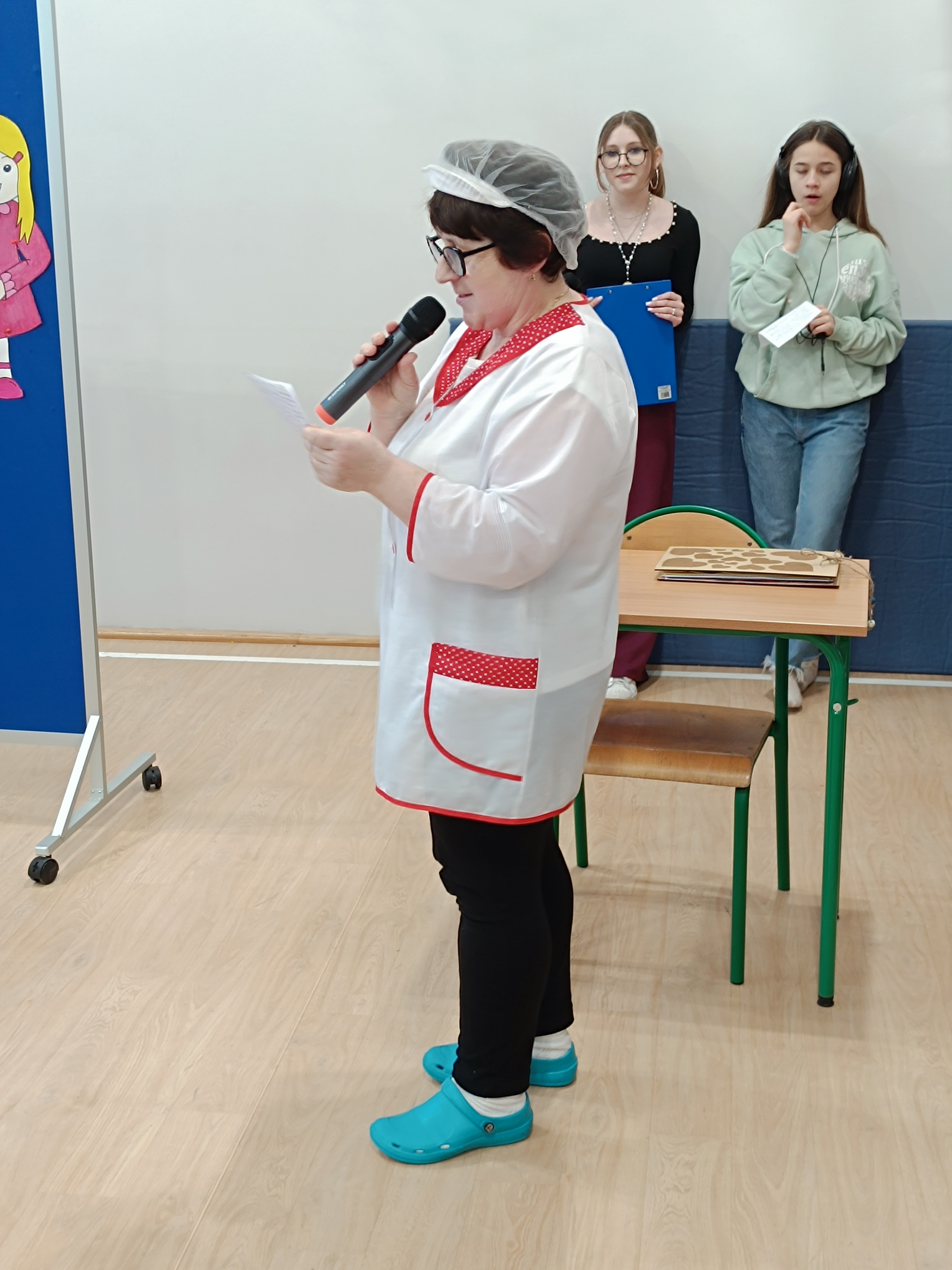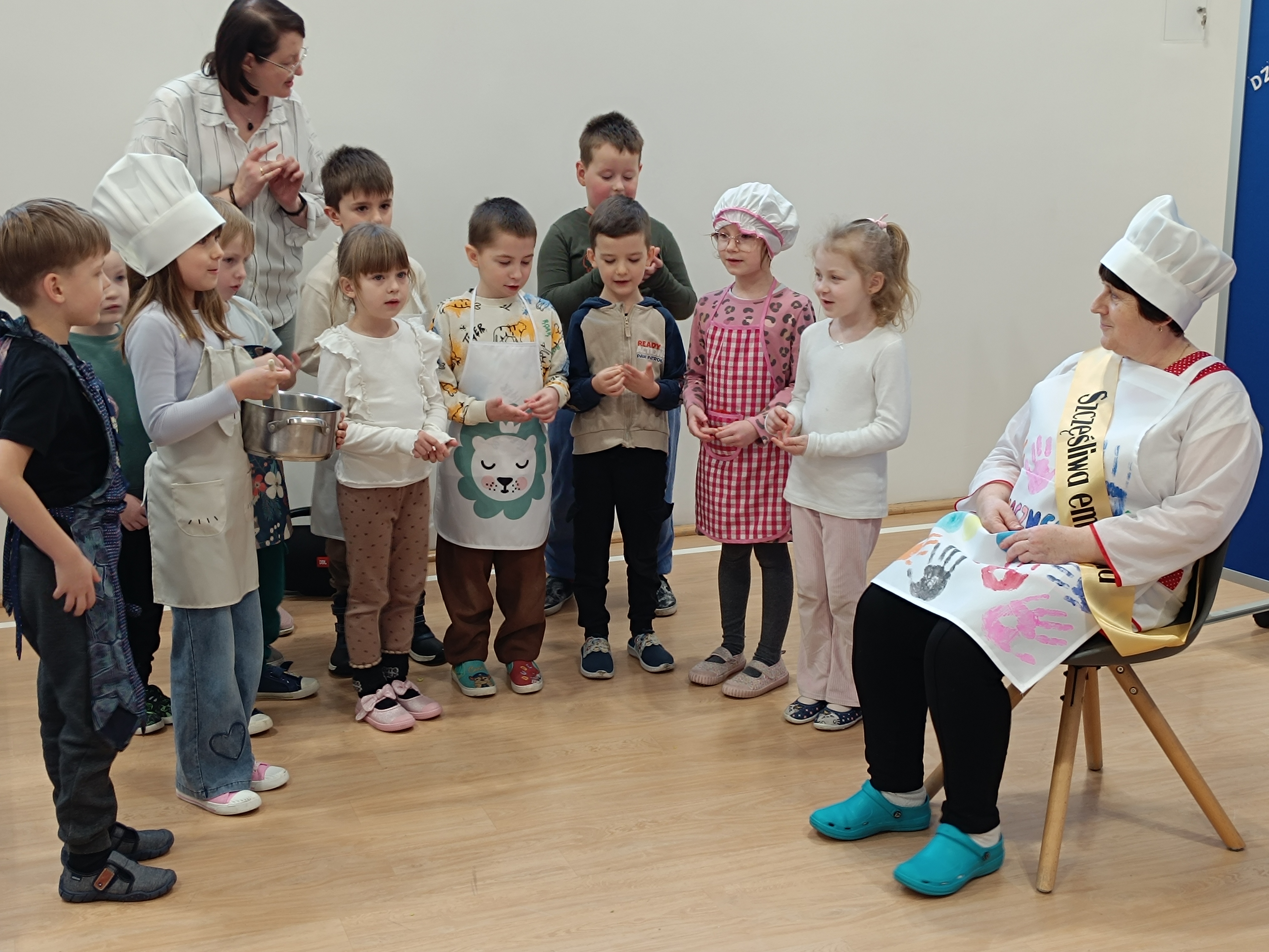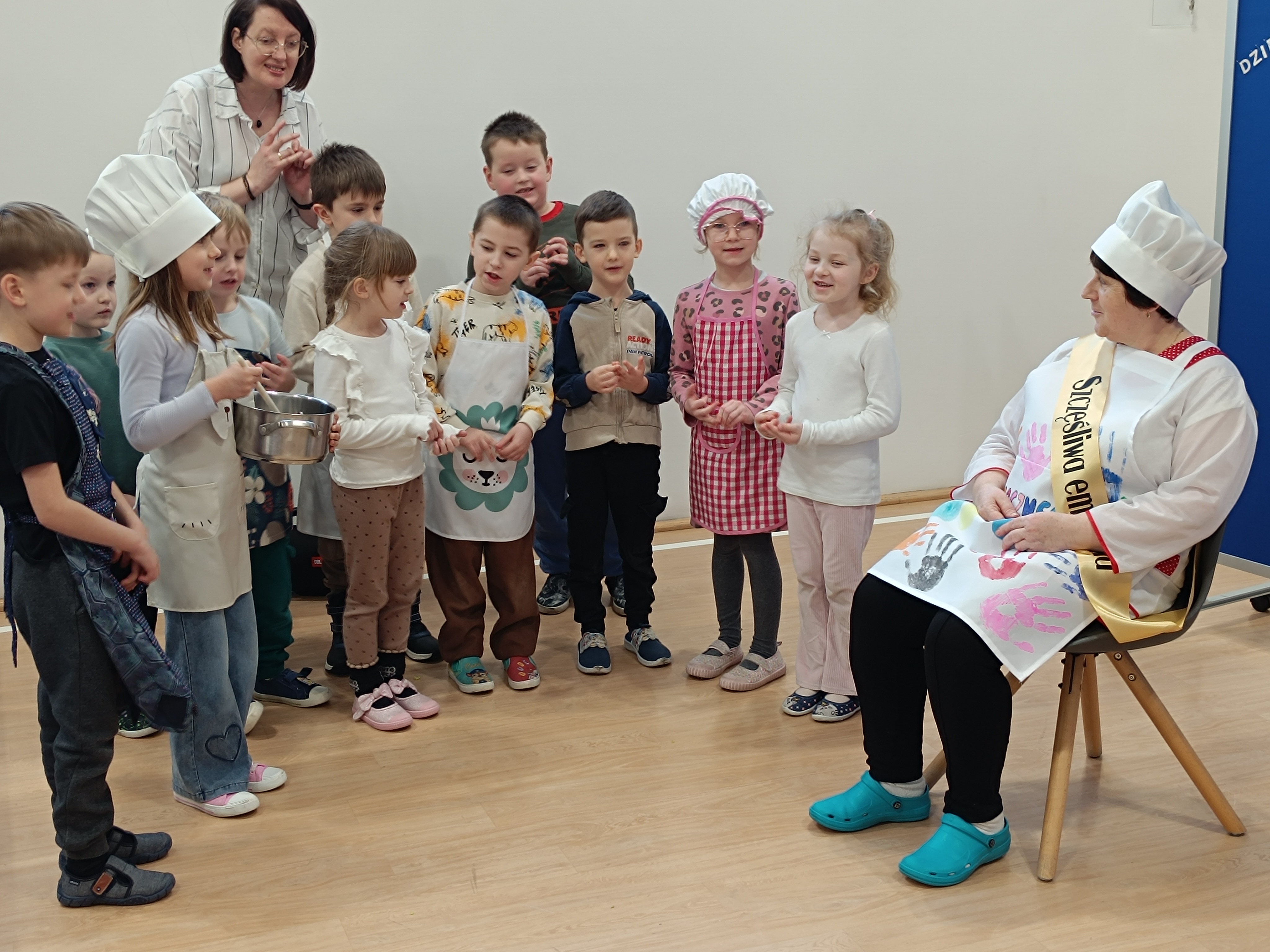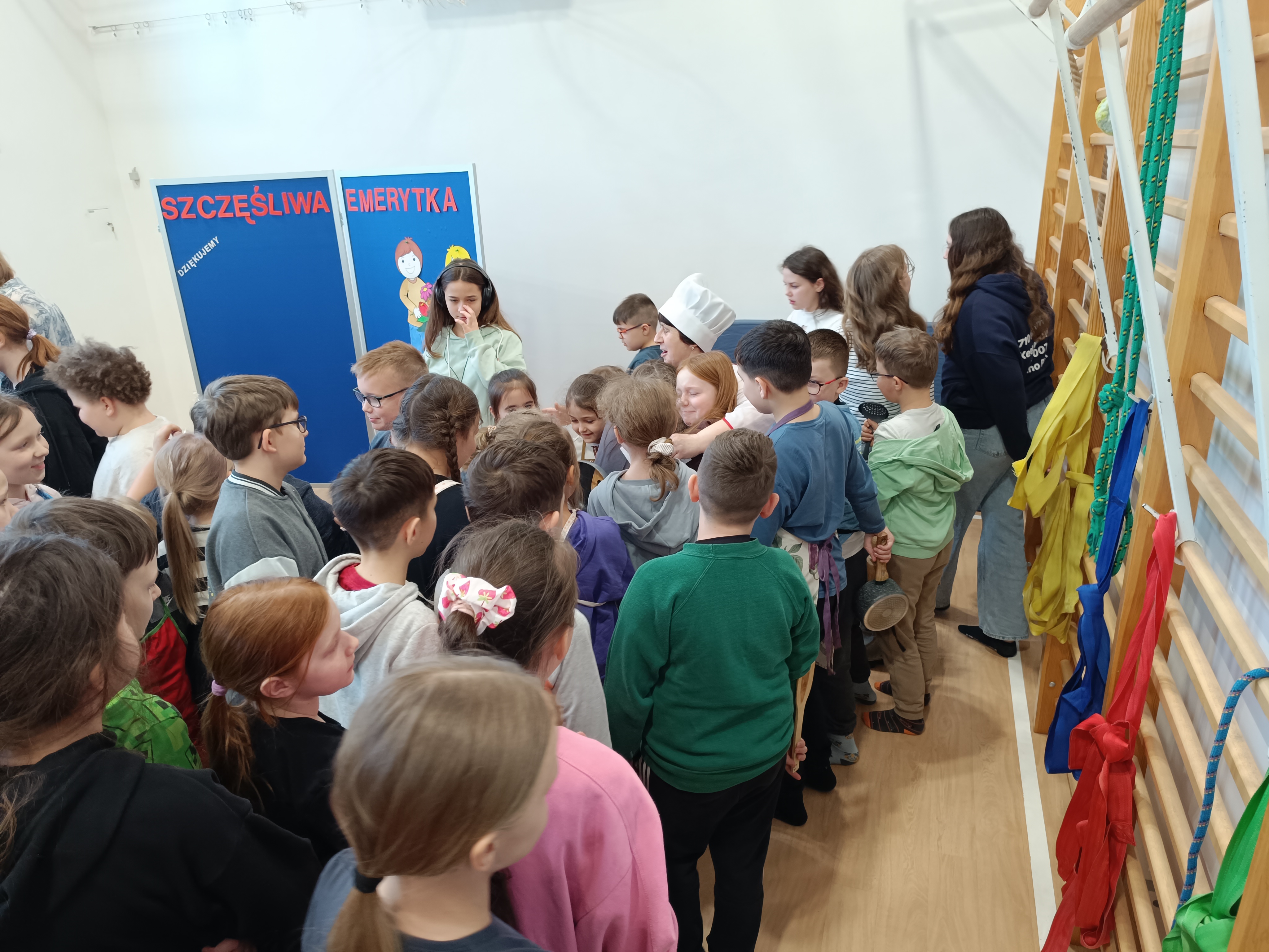 Samorząd Uczniowski przygotował specjalny fartuszek kucharski ozdobiony odciskami dłoni uczniów – symboliczny gest pełen wdzięczności i serca dla Pani Beni. Pani Bernadetta otrzymała również piękną szarfę z napisem „Szczęśliwa Emerytka” oraz album pamiątkowy, w którym każda klasa miała swoją stronę z podziękowaniami i wspomnieniami.