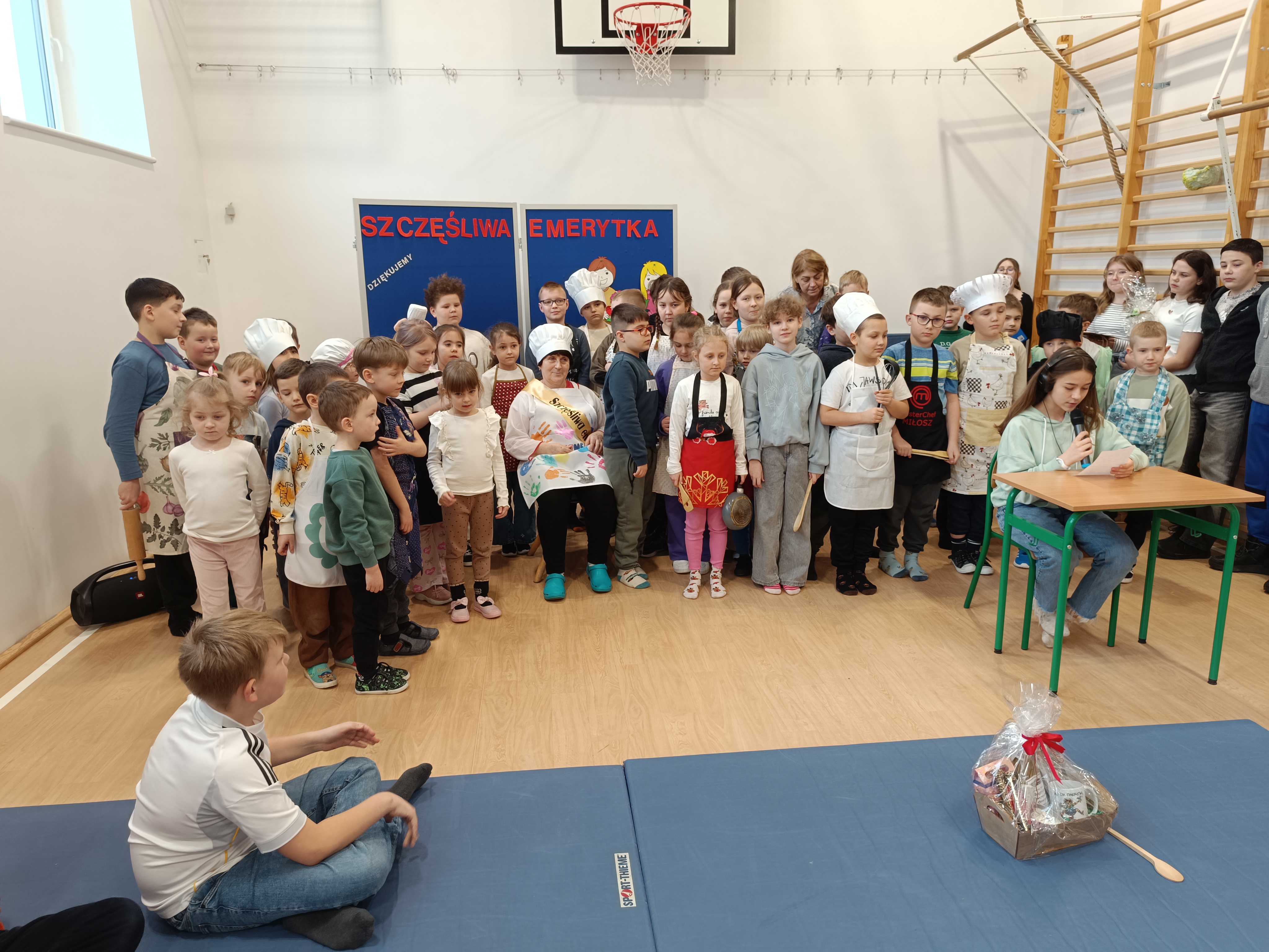 Z tej okazji cała społeczność szkolna zebrała się w sali gimnastycznej, gdzie Samorząd Uczniowski wraz z uczniami przygotował krótkie pożegnanie. Uroczystość rozpoczęła Pani Dyrektor, która w humorystyczny i serdeczny sposób przypomniała najlepsze dania Pani Beni, w szczególności piątkowe naleśniki, uwielbiane przez wszystkich uczniów. Zapach smażonych naleśników rozchodził się po całej szkole, a kolejka po dokładki była zawsze niekończąca się. Ten smak i aromat na długo pozostanie w naszej pamięci.