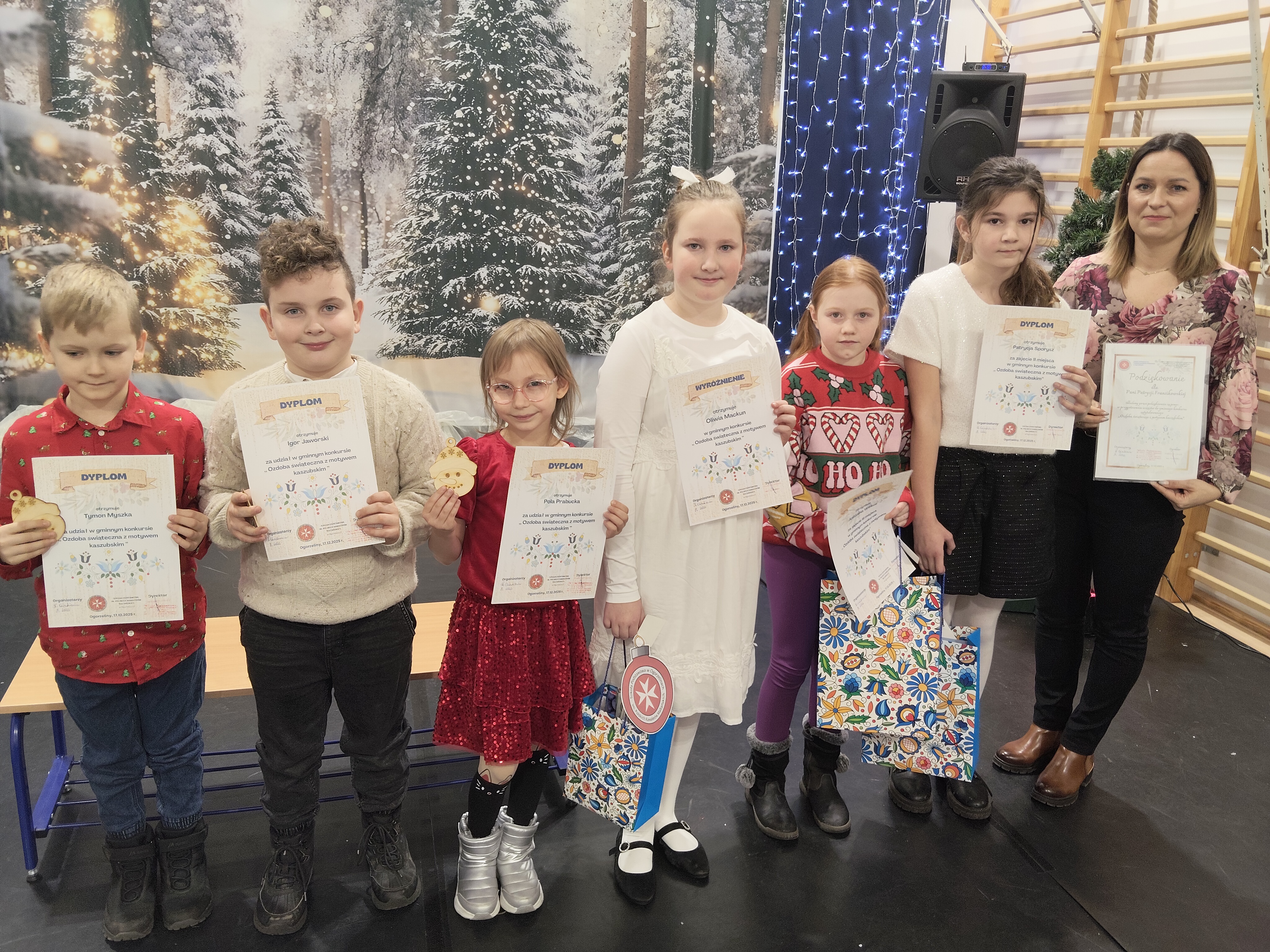 Z wielką radością informujemy o sukcesach naszych uczniów w gminnym konkursie pt. „Ozdoba świąteczna z motywem kaszubskim”, którego organizatorem była Szkoła Podstawowa w Ogorzelinach. Wszyscy uczniowie wykazali się dużą kreatywnością, tworząc piękne prace inspirowane tradycją i symboliką Kaszub. Konkurs był okazją do rozwijania talentów oraz pogłębiania wiedzy o regionalnym dziedzictwie kulturowym. Wszystkim uczestnikom dziękujemy za zaangażowanie, a laureatom serdecznie gratulujemy.