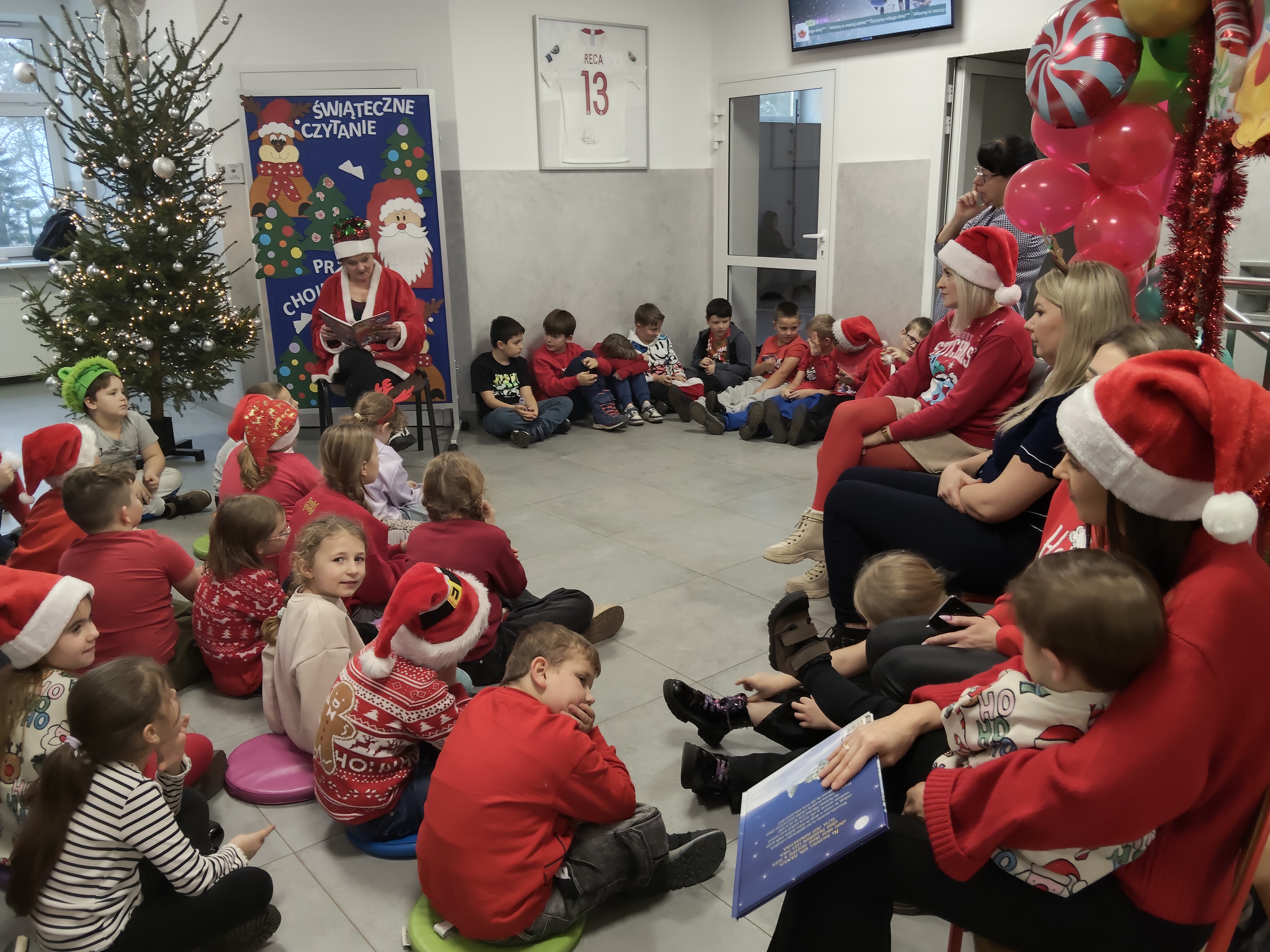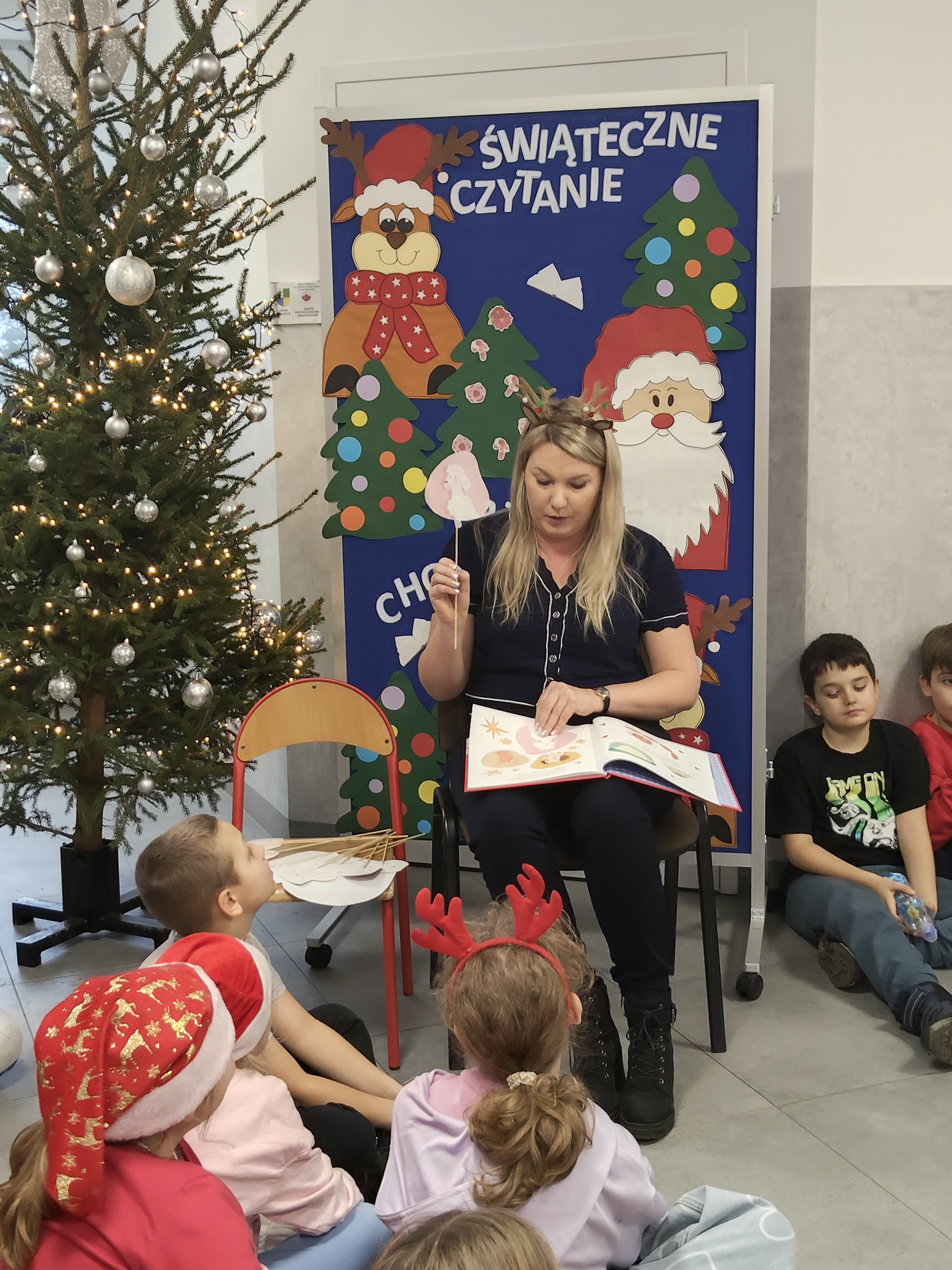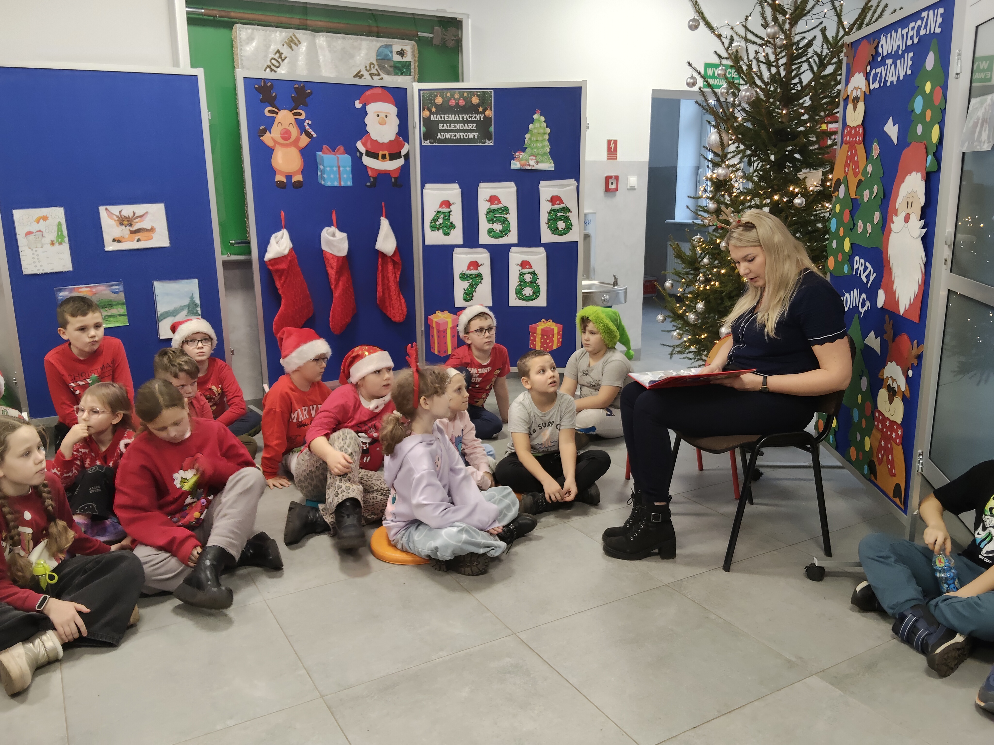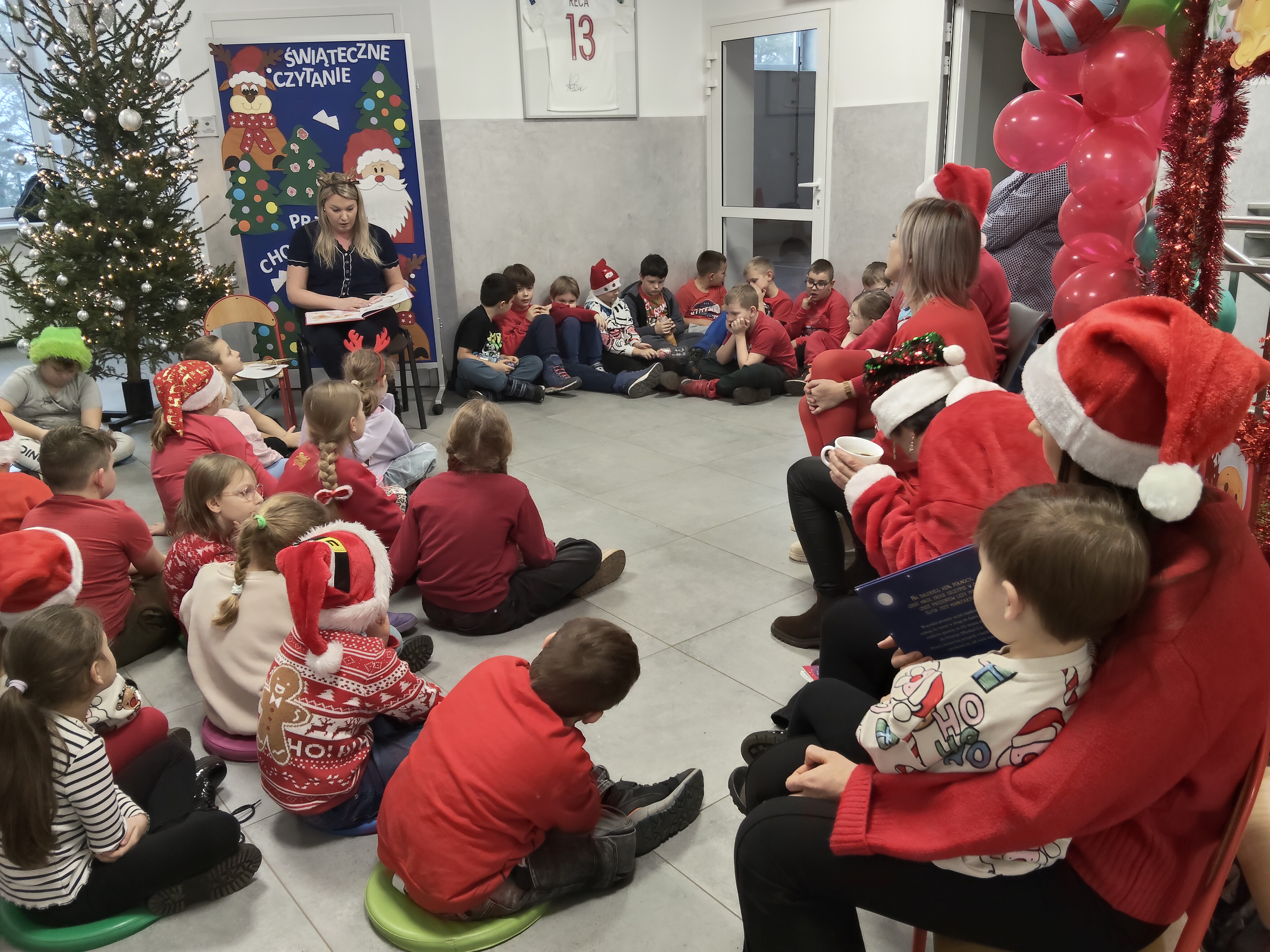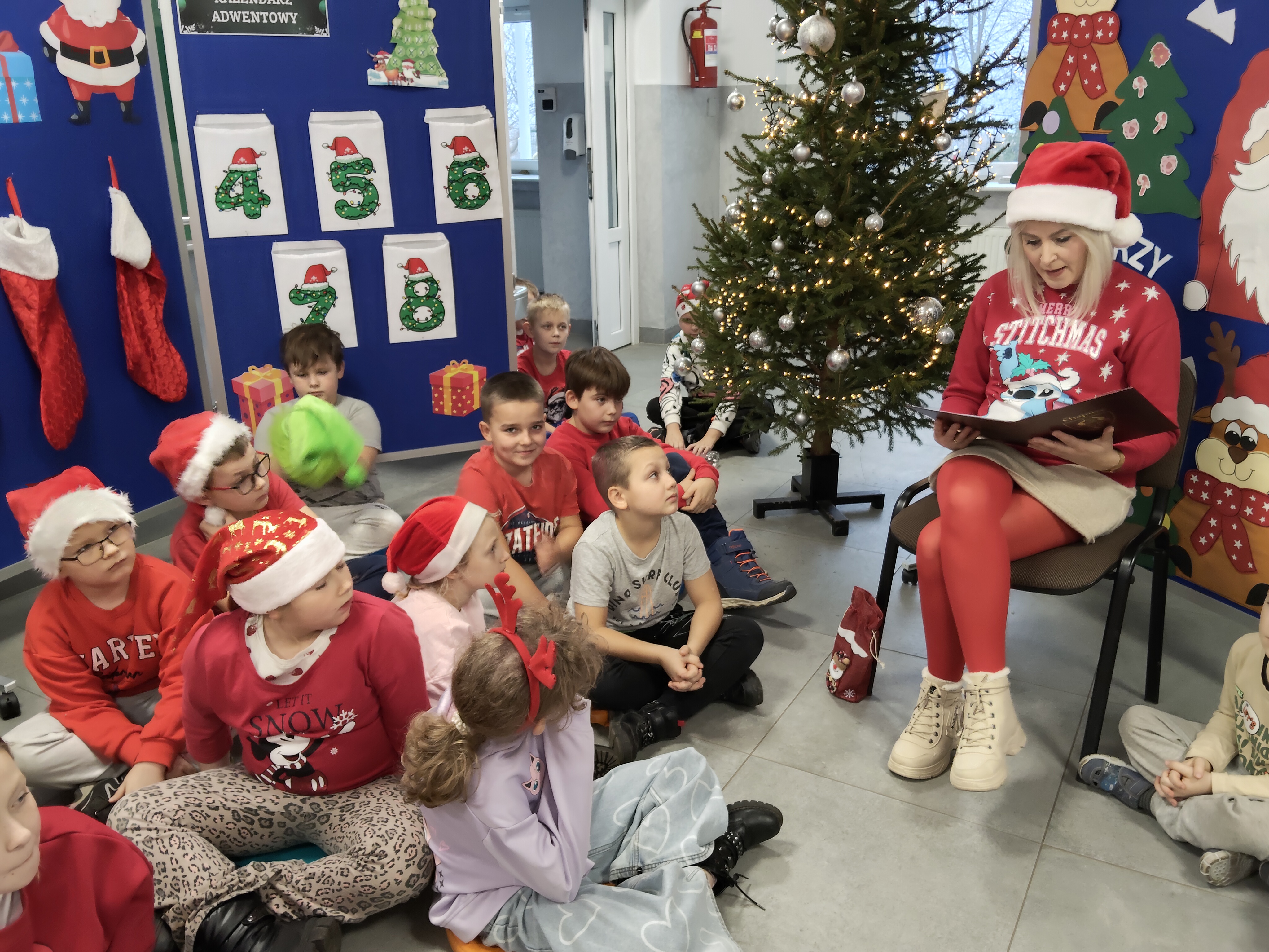 Wspólne czytanie było okazją do zatrzymania się na chwilę, budowania relacji oraz wprowadzenia dzieci w magiczny klimat Świąt Bożego Narodzenia. Uczniowie z zaciekawieniem słuchali czytanych historii, a blask choinkowych światełek dopełniał tej wyjątkowej chwili.