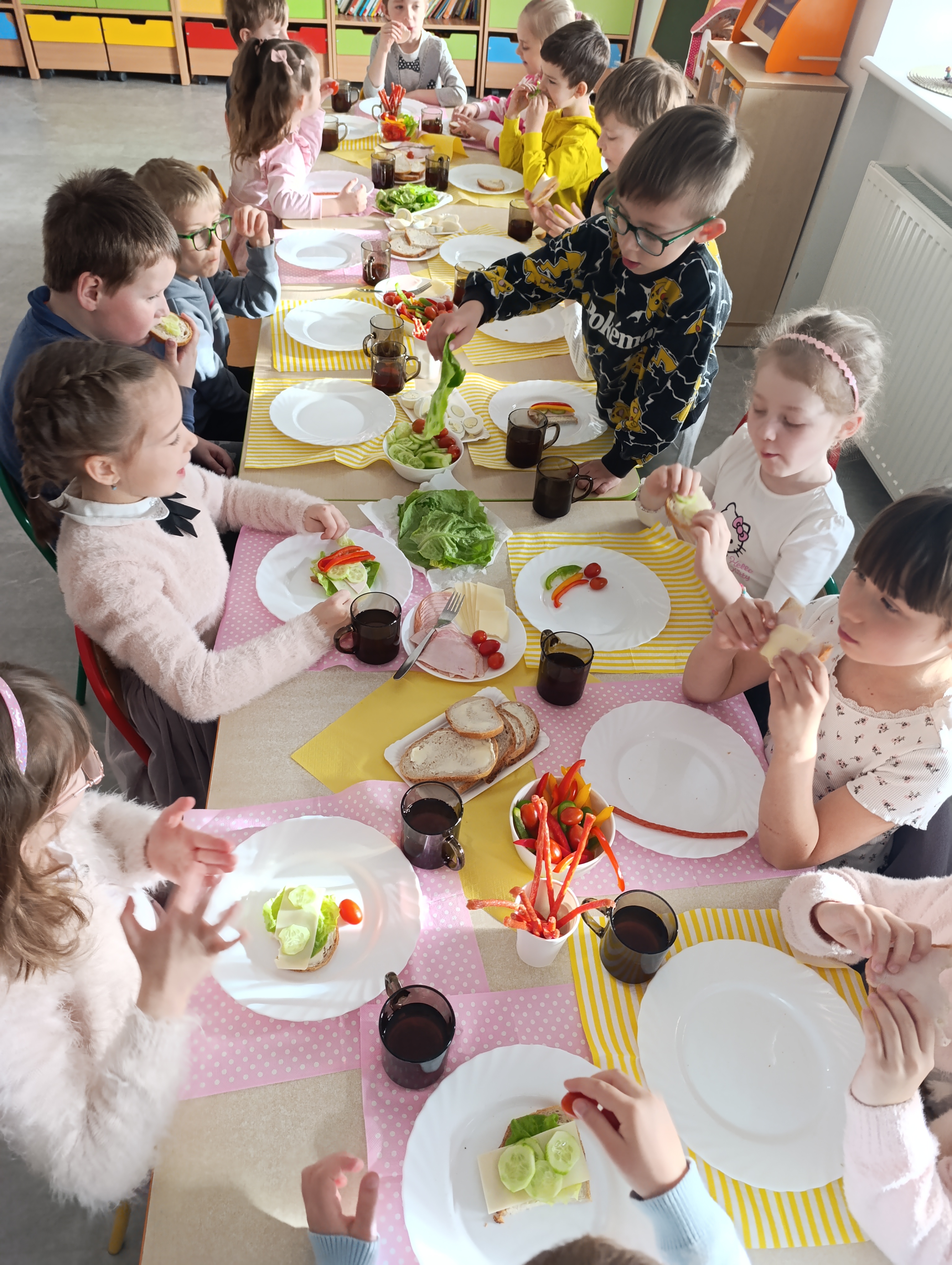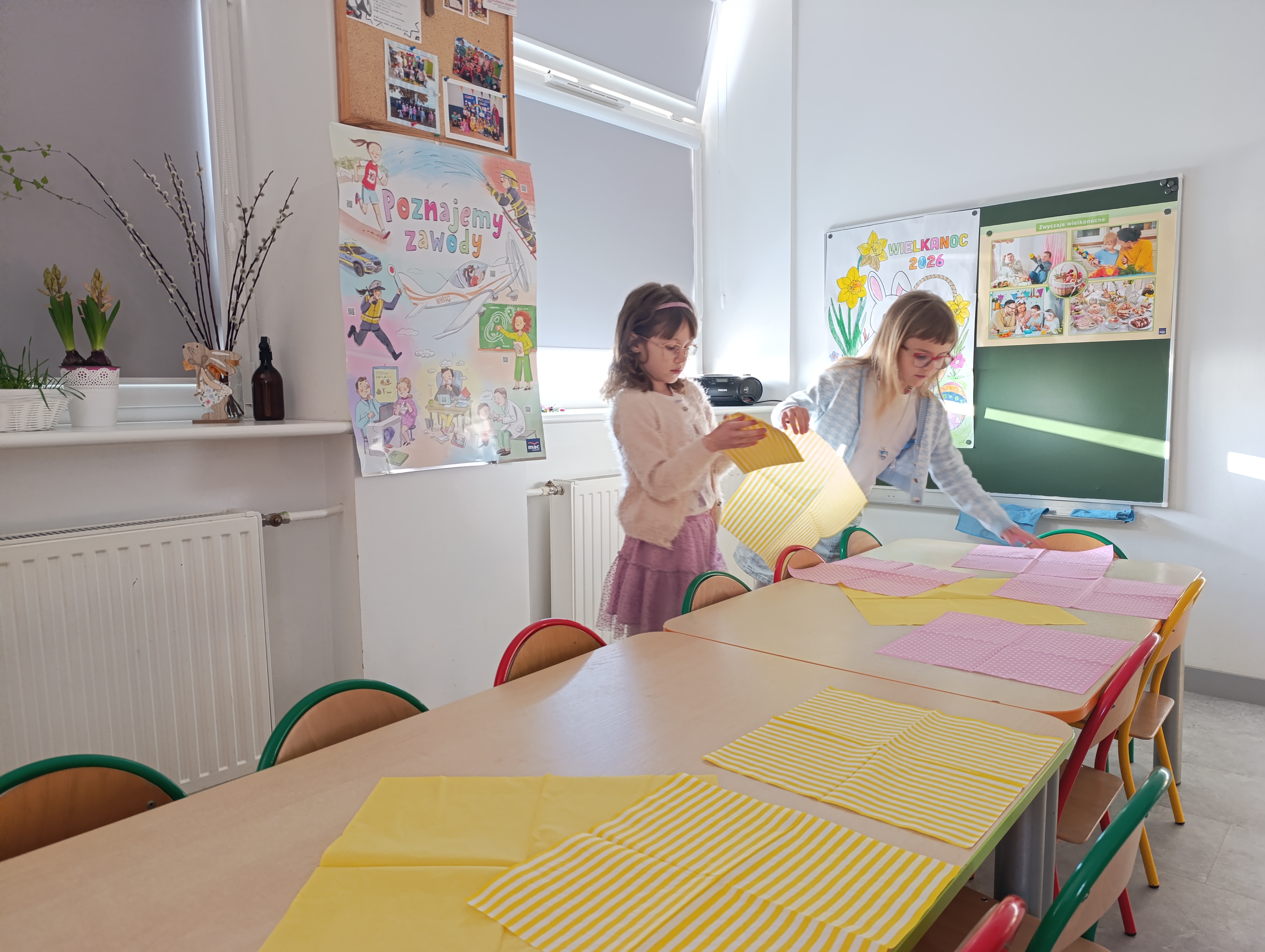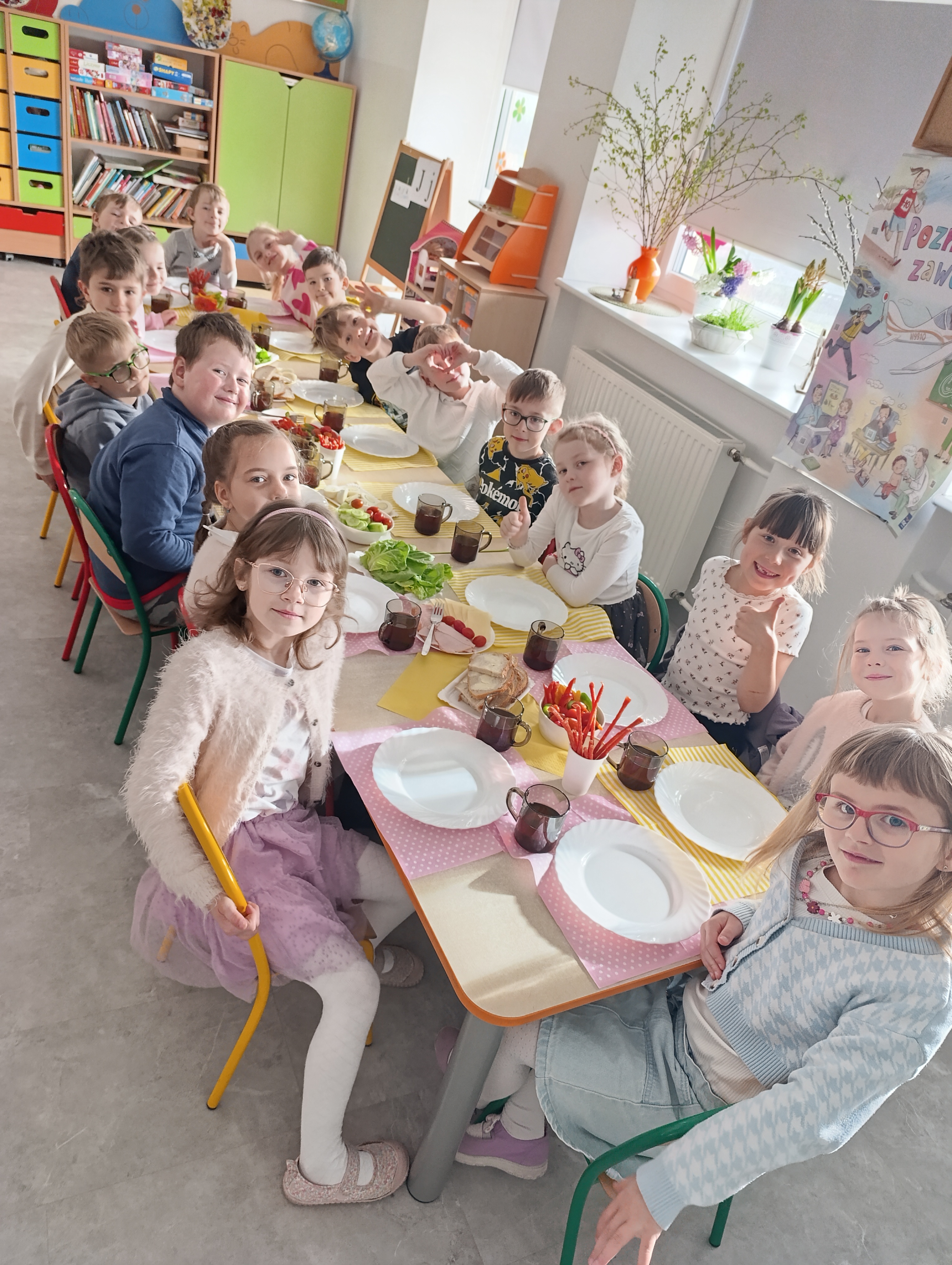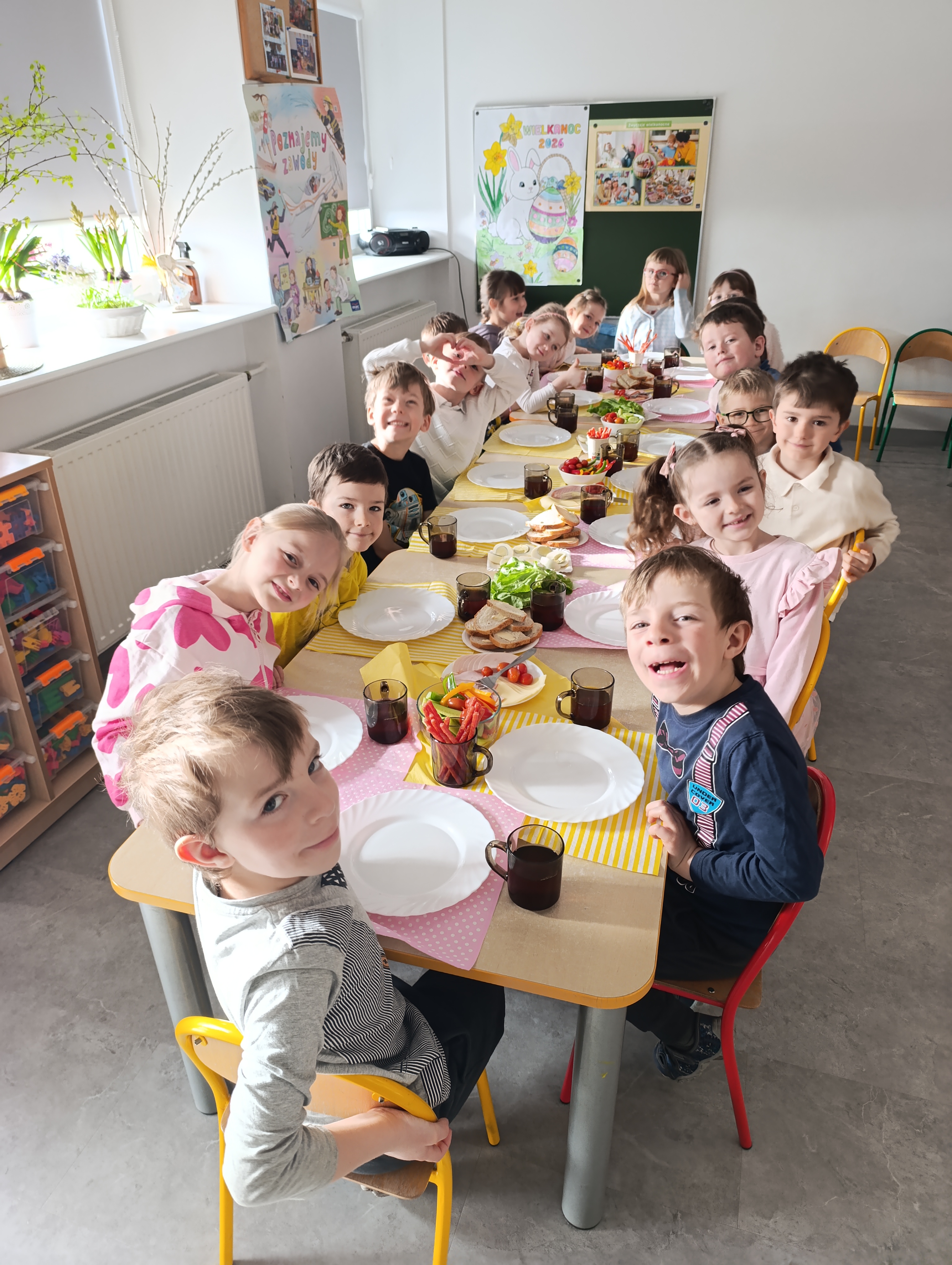 Dzięki wsparciu rodziców, dzieci z oddziału przedszkolnego zaczęły świętowanie tuż przed prawdziwą Wielkanocą! Pyszne i zdrowe śniadanie przy samodzielnie przygotowanym stole, szukanie zajączka, który podobno biegał po dachu oraz ulubione gry i zabawy wprawiły wszystkich w świąteczny i radosny nastrój!