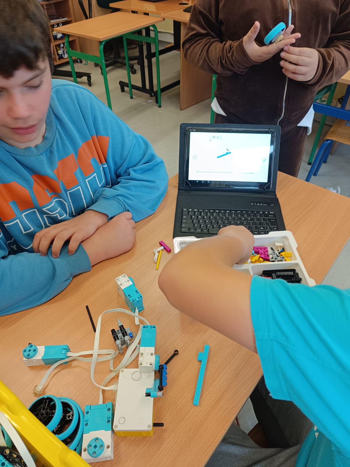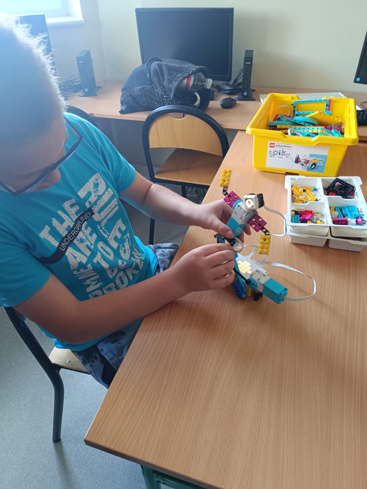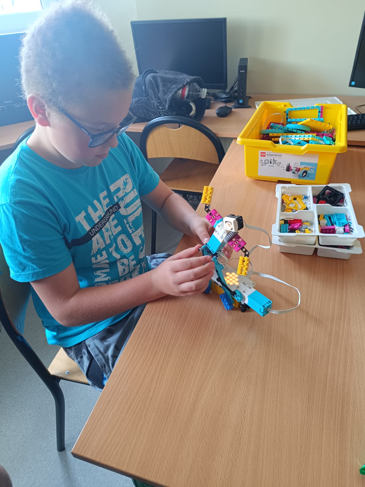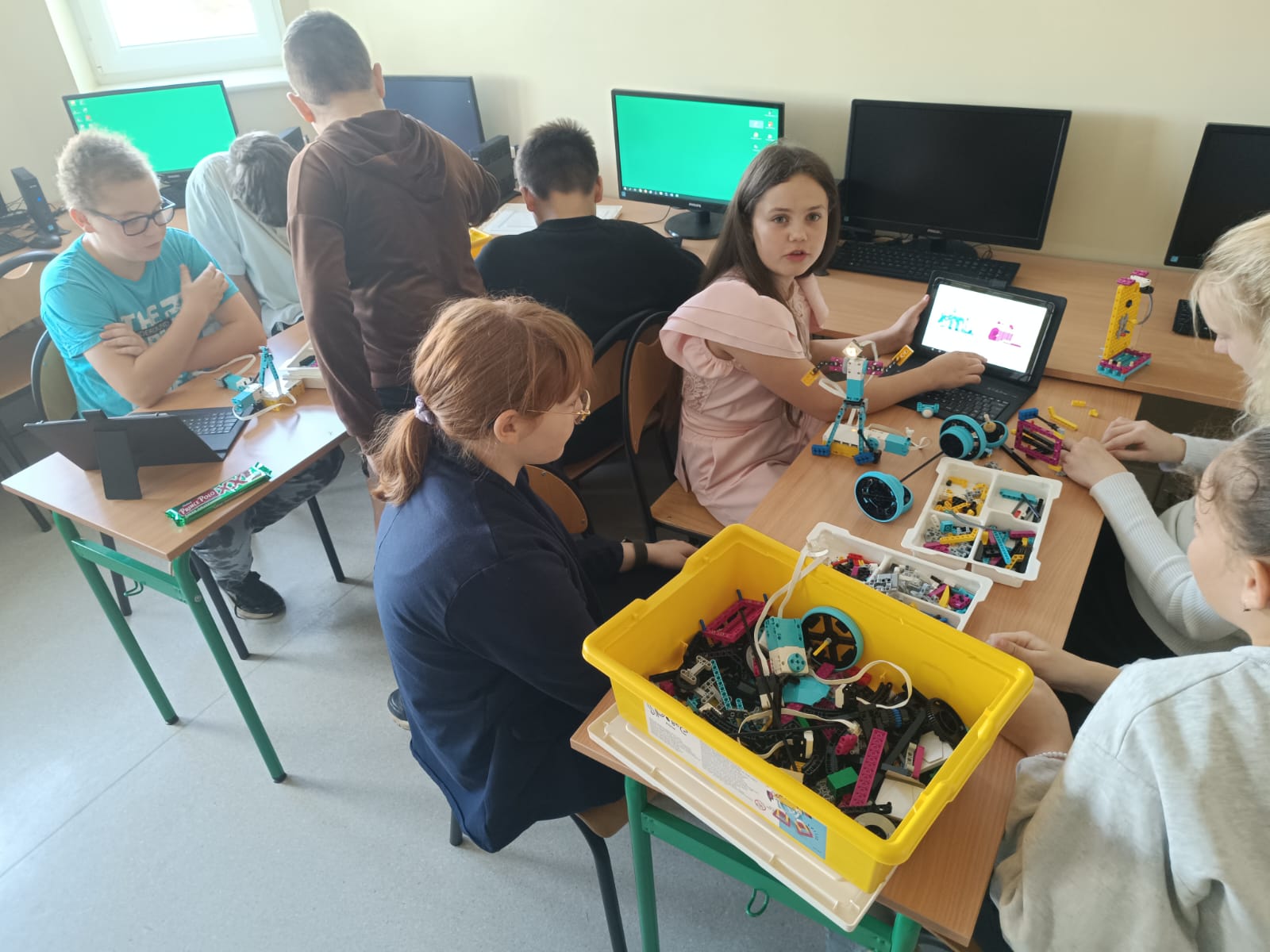 Uczniowie klasy 6 podczas zajęć z informatyki rozwijają kreatywne myślenie, pracując z zestawami Lego Spike Prime. Budują konstrukcje według gotowych projektów, które następnie programują i modyfikują zgodnie z własnymi pomysłami.