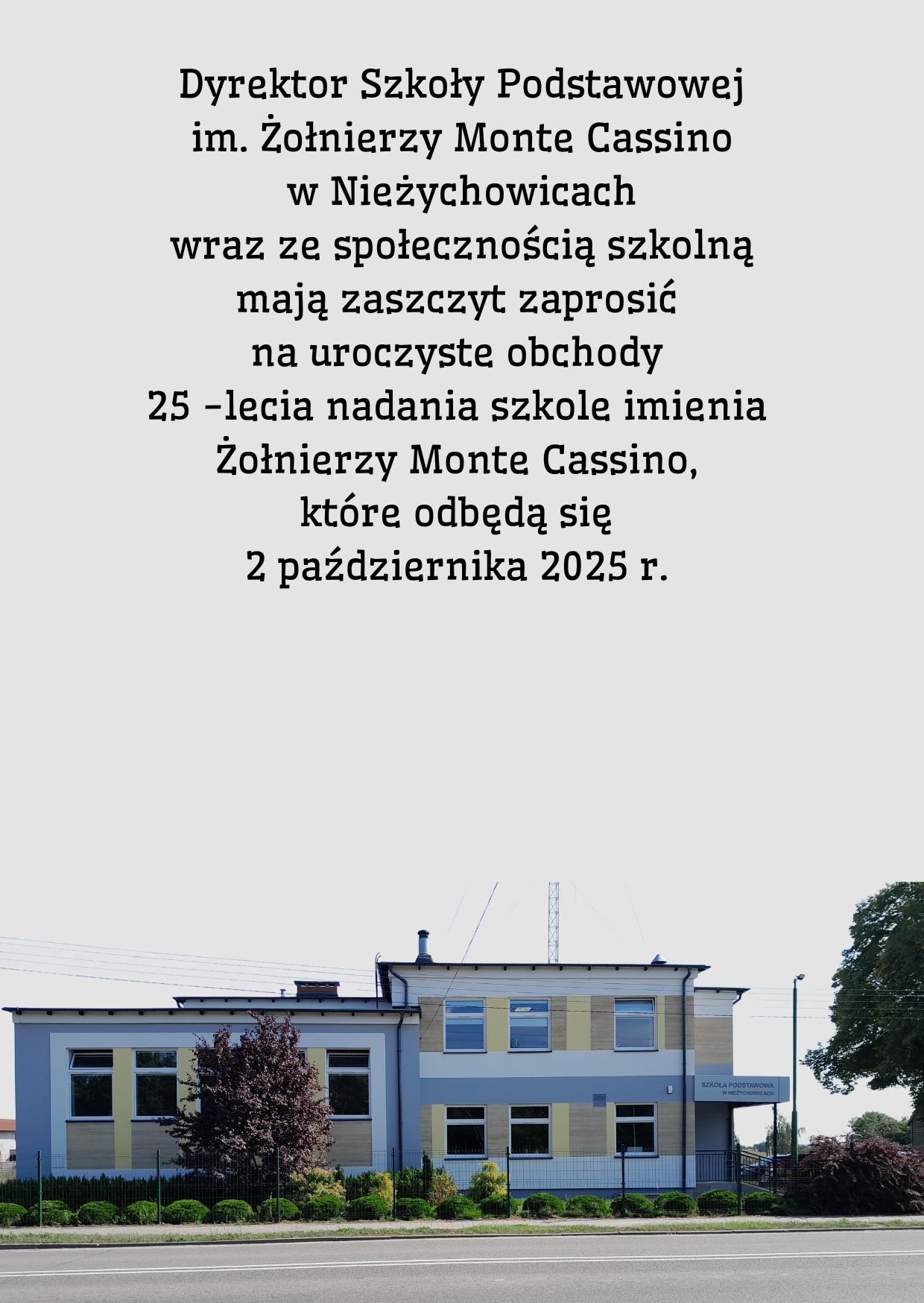 Serdecznie zapraszamy na uroczyste obchody 25 - lecia nadania szkole imienia Żołnierzy Monte Cassino, które odbędą się 2 października 2025 r.