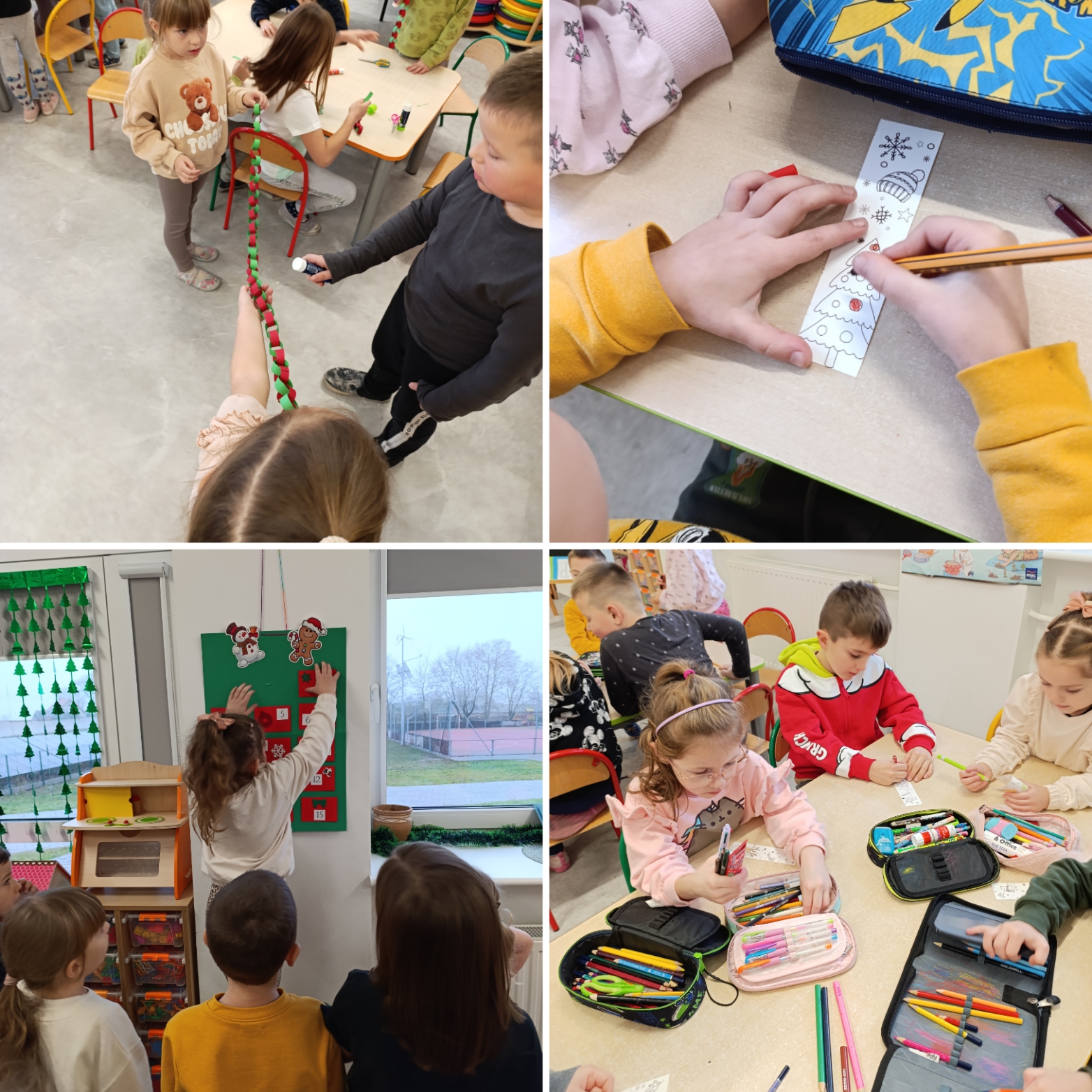 Wśród codziennych zajęć w grudniu odliczamy do najpiękniejszego czasu w roku - Świąt Bożego Narodzenia. Nasz kalendarz adwentowy nie jest wypełniony czekoladkami, ale wesołymi wyzwaniami plastycznymi i technicznymi. Dzięki temu klimat w naszej sali jest coraz bardziej magiczny. Do tej pory udało nam się stworzyć świąteczne łańcuchy, wieniec z odrysowanych naszych dłoni, kolorowe krasnale, magnesy na lodówkę, zakładki do książek, wesołe renifery i kartki świąteczne! A jeszcze trochę przed nami...
