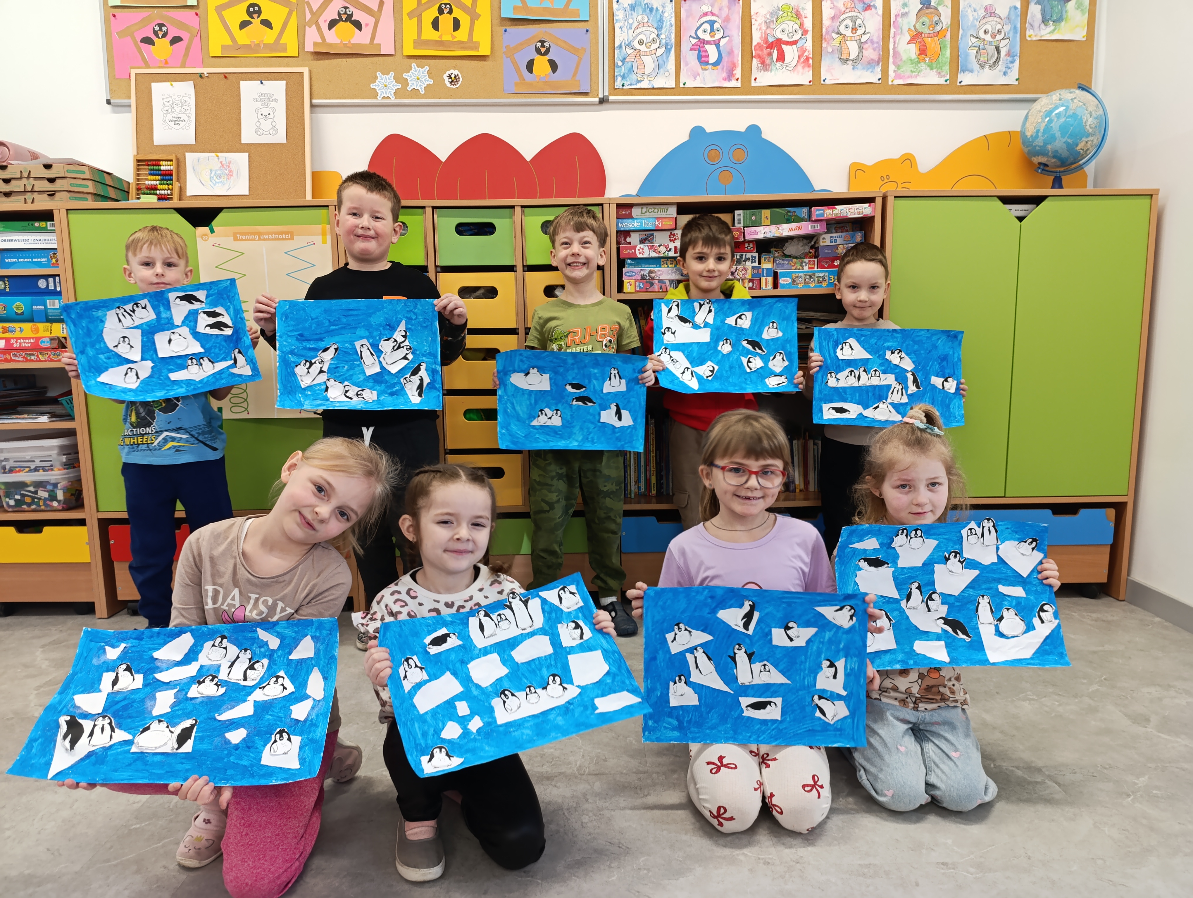 W minionym tygodniu dzieci z zerówki wyruszyły w niezwykłą, edukacyjną podróż na mroźne krańce świata – do Arktyki i Antarktyki. Przedszkolaki poznawały położenie tych miejsc, pracując z globusem, dowiedziały się, jaka panuje tam pogoda, jakie zwierzęta zamieszkują lodowe krainy oraz czy i jak żyją tam ludzie.